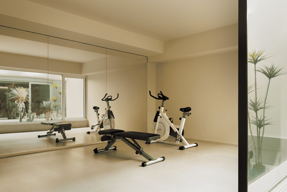 业主夫妇选择在家办公,他们的办公区域与健身区被精心安排在这里。原本封闭采光井的实体墙已被拆除,取而代之的是明亮通透的植物盒子,在盎然绿意中,各个功能空间被巧妙地划分开来。健身区、影音室、水吧和办公区围绕着“植物盒子”与楼梯布局,共同构成了一个集工作与休闲于一体的多功能空间。
