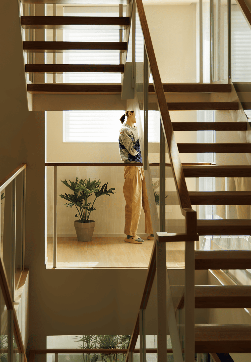 虽然建筑外立面无法改变,但设计团队通过精心设计,优化了光线流动的路径,改变了楼梯的位置和封闭形式,让阳光在地下室和各楼层之间自由流动。从地下一层到地上二层,每一层都承载着家庭生活的核心功能。改造后的楼梯不仅承担了垂直交通的功能,还成为光影和情感互动的纽带。