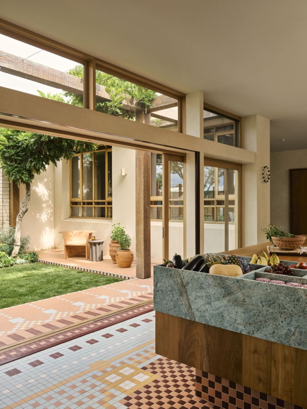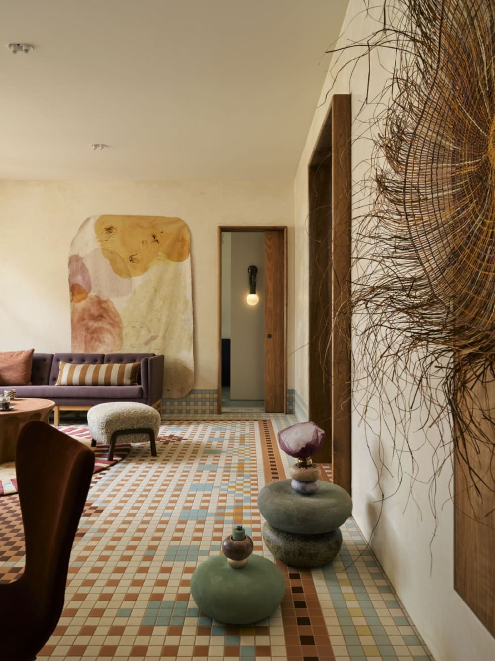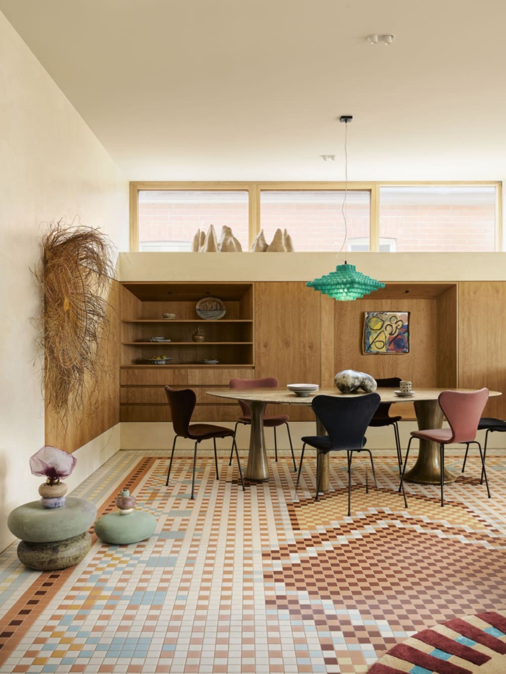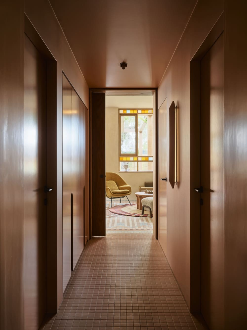 我们延伸的走廊通道被涂上了深桃色(搭配瓷砖)。其推拉门由突出的木质门框构成,增强了进入照明客厅的感觉,在这里,玻璃化瓷质地砖的 “地毯 ”最终形成了精致的像素图案,其灵感来自波斯地毯。