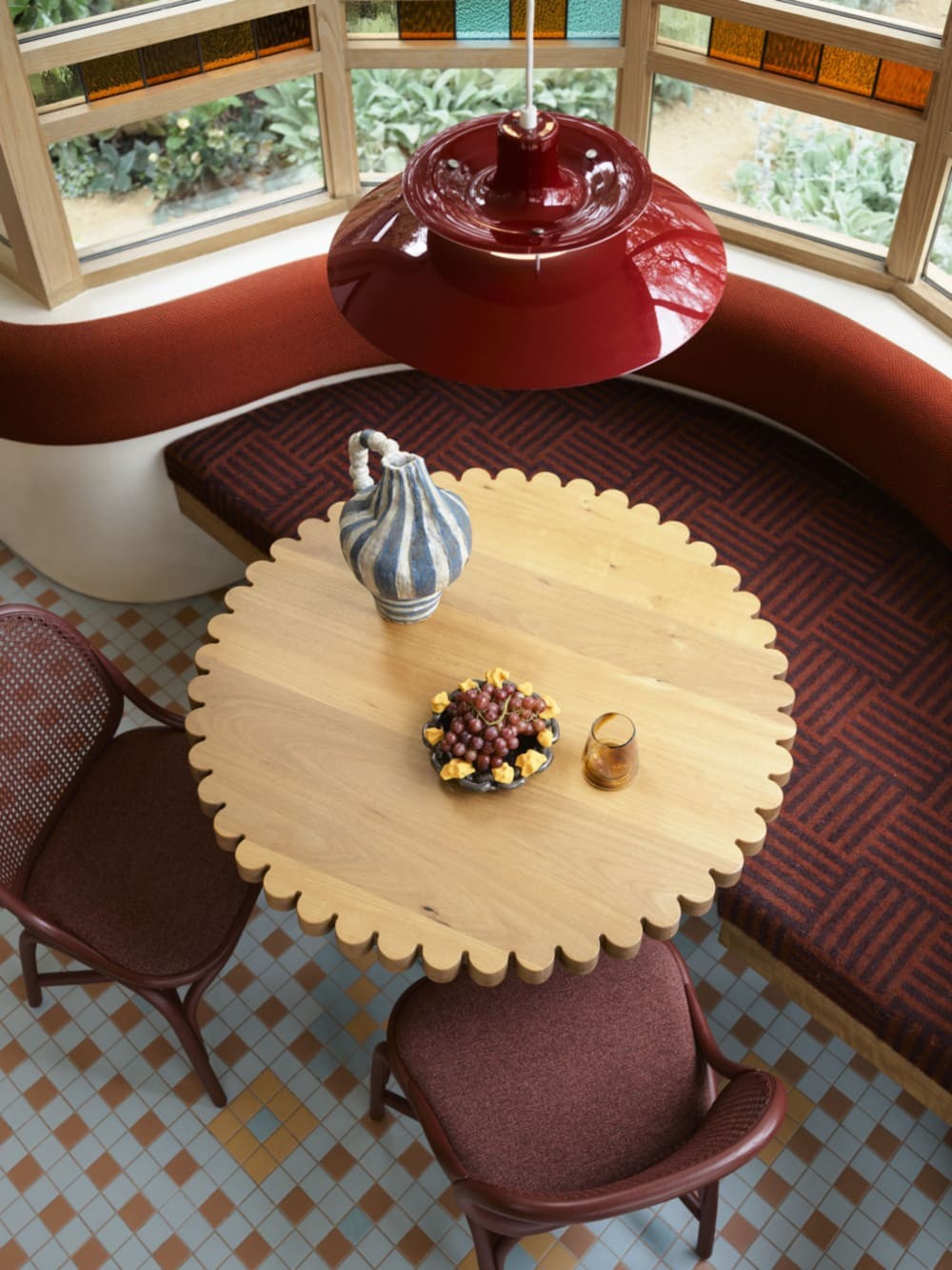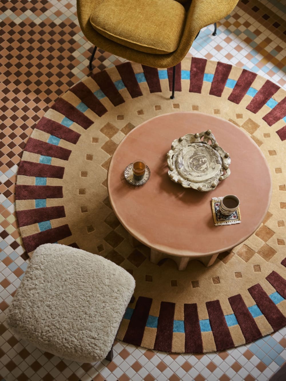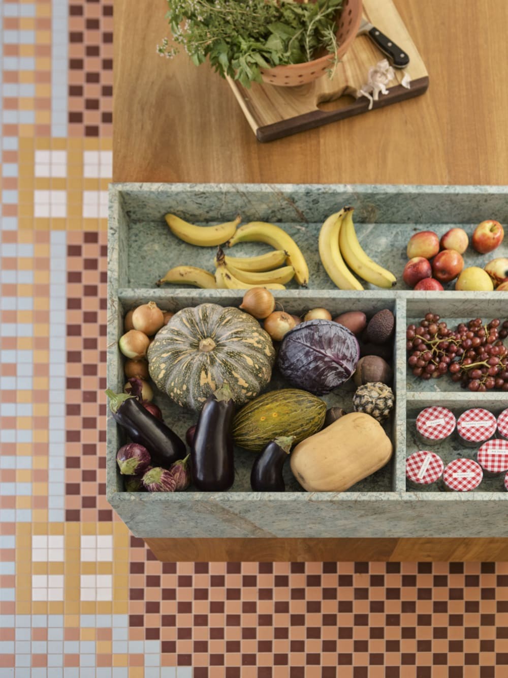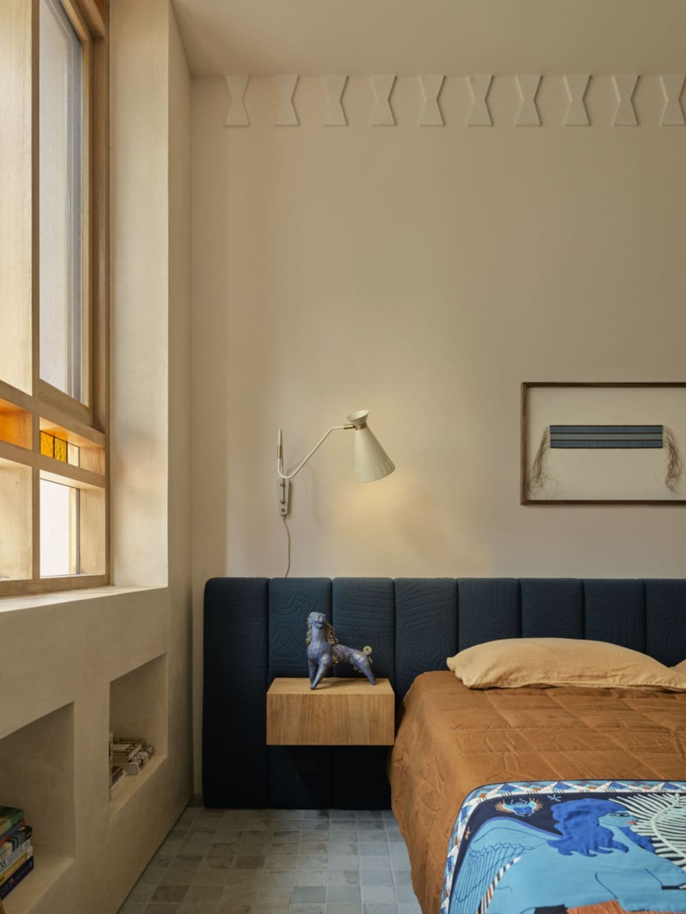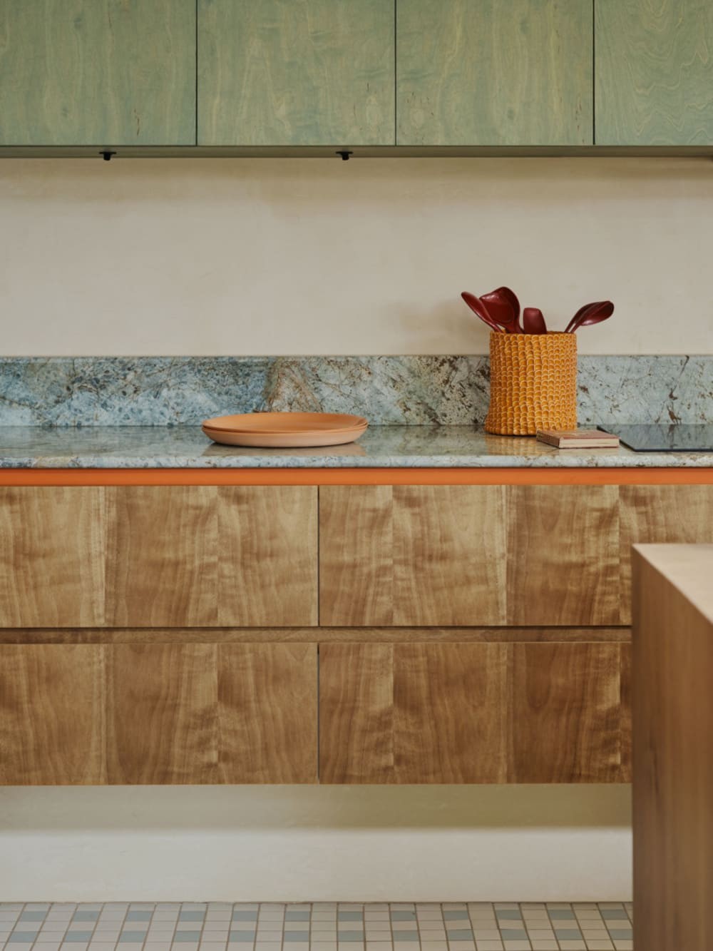 我们延伸的走廊通道被涂上了深桃色(搭配瓷砖)。其推拉门由突出的木质门框构成,增强了进入照明客厅的感觉,在这里,玻璃化瓷质地砖的 “地毯 ”最终形成了精致的像素图案,其灵感来自波斯地毯。