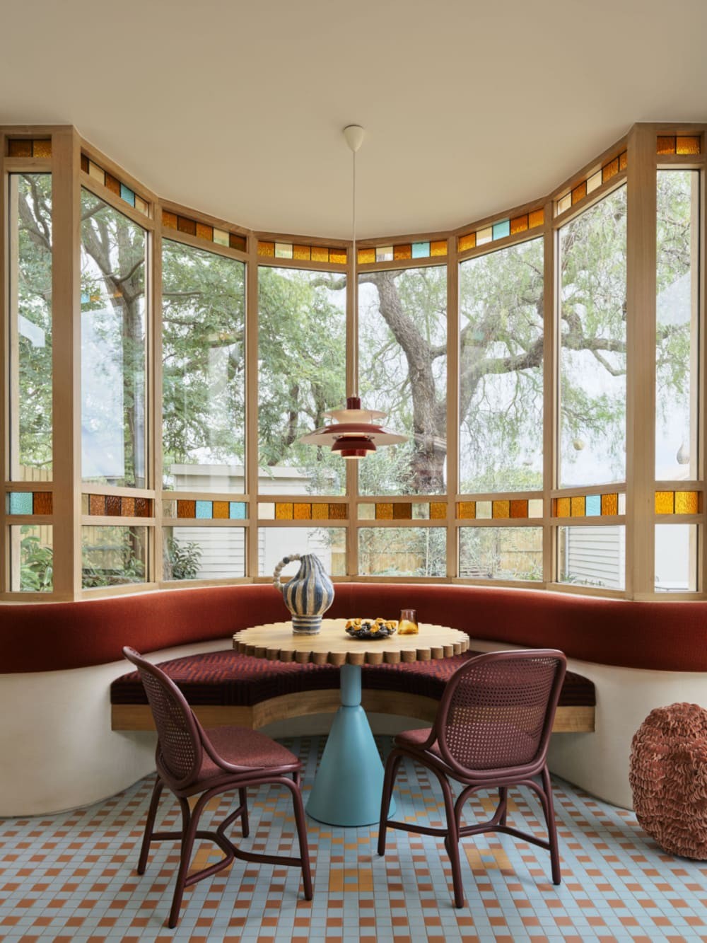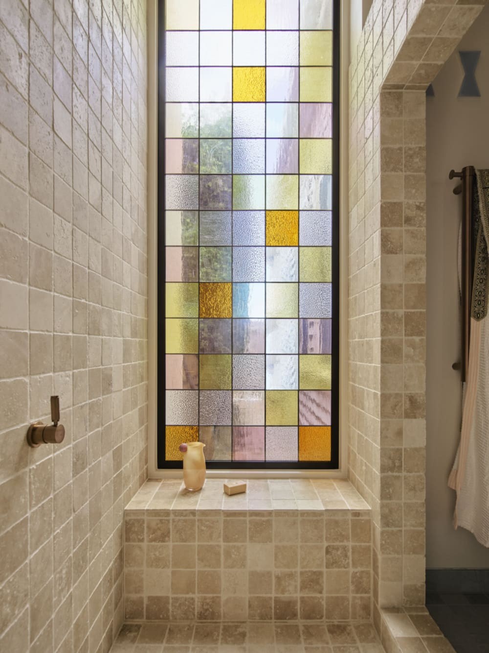我们对色彩强度和照度进行了调整,在杏色前门周围添加了柔和的宝石色窗格。