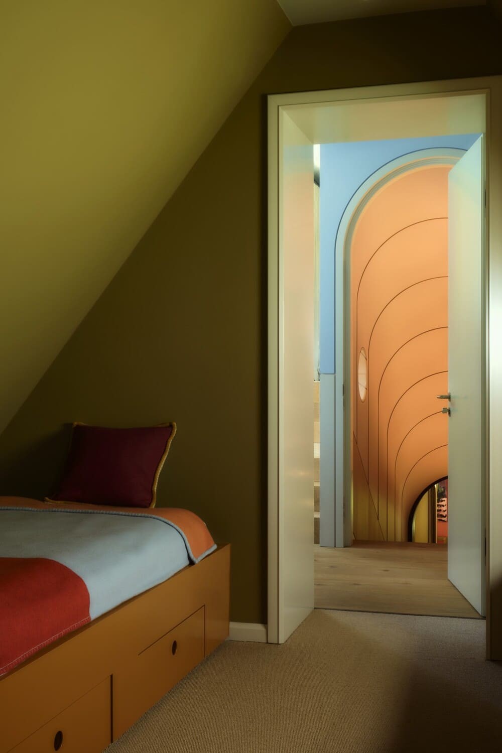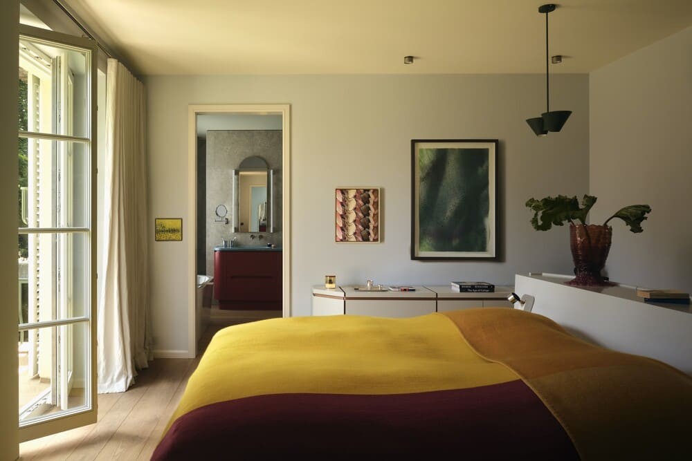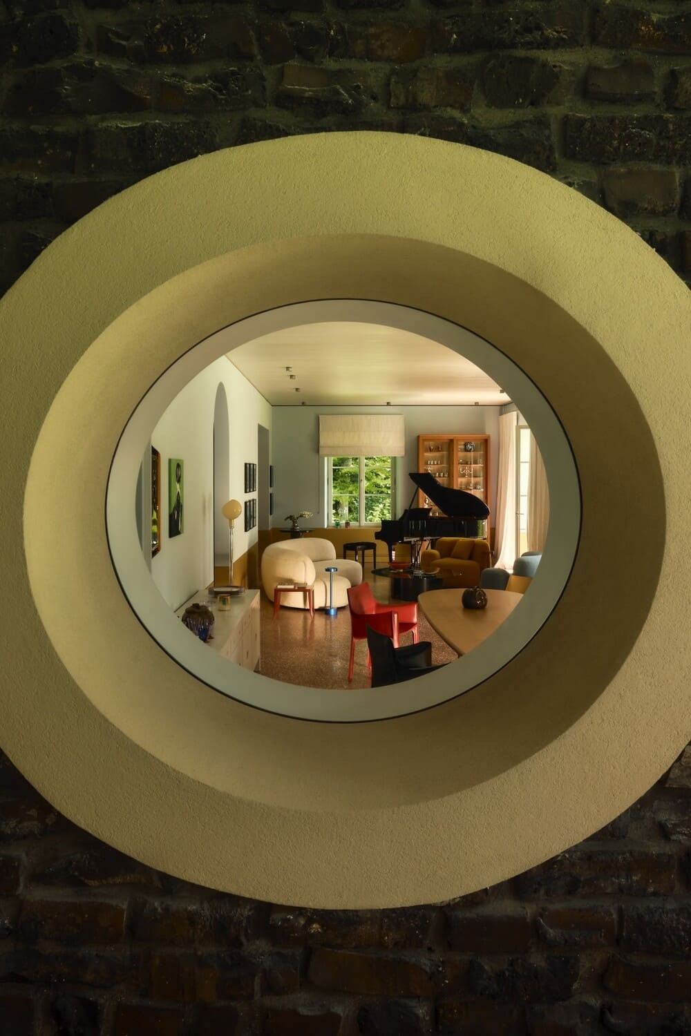 The staircase connecting the floors was rebuilt, and as a central motif of the redesign, Pöppler gave the passageways round arches. He opened up the conservatory entrance to make the space feel larger, just as he let more light into the house by installing oval wall openings (which he borrowed from Italian designer Luigi Caccia Dominioni whom he admires). Angling window openings are “an elaborate way of making them look larger than they are,” explains the architect, “and are particularly common in Switzerland.”