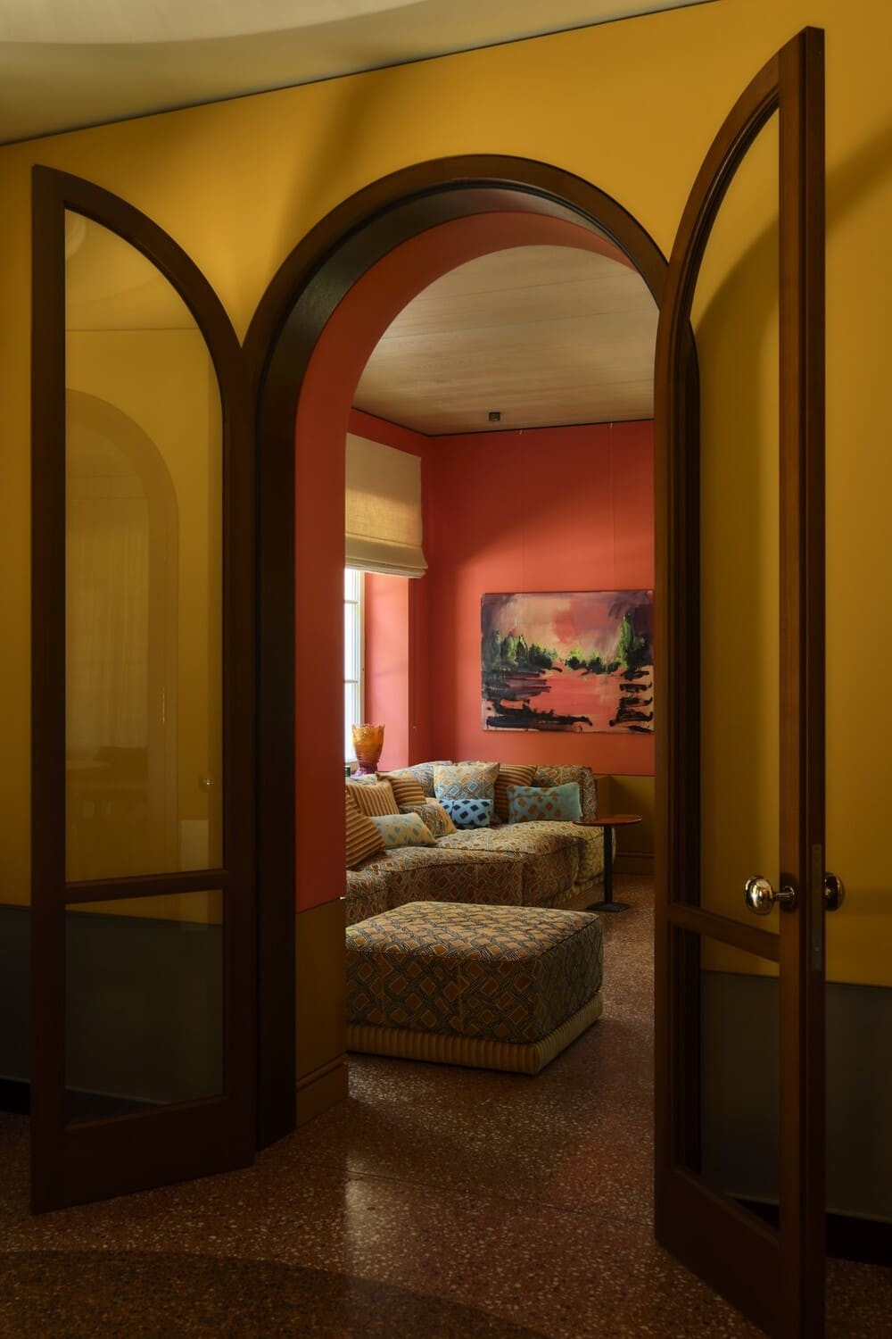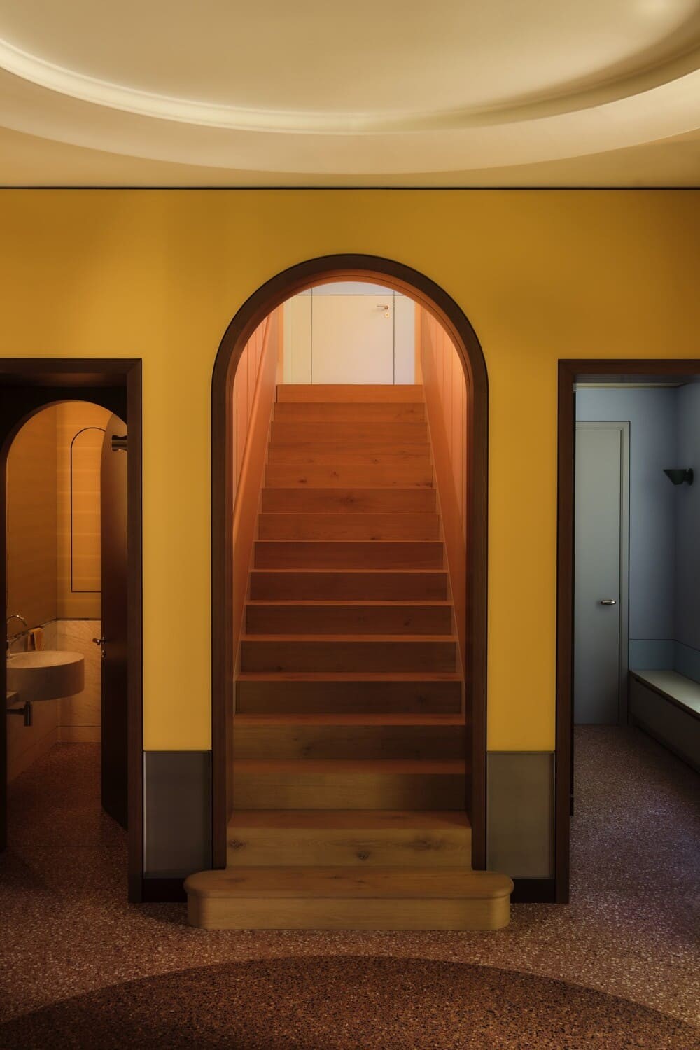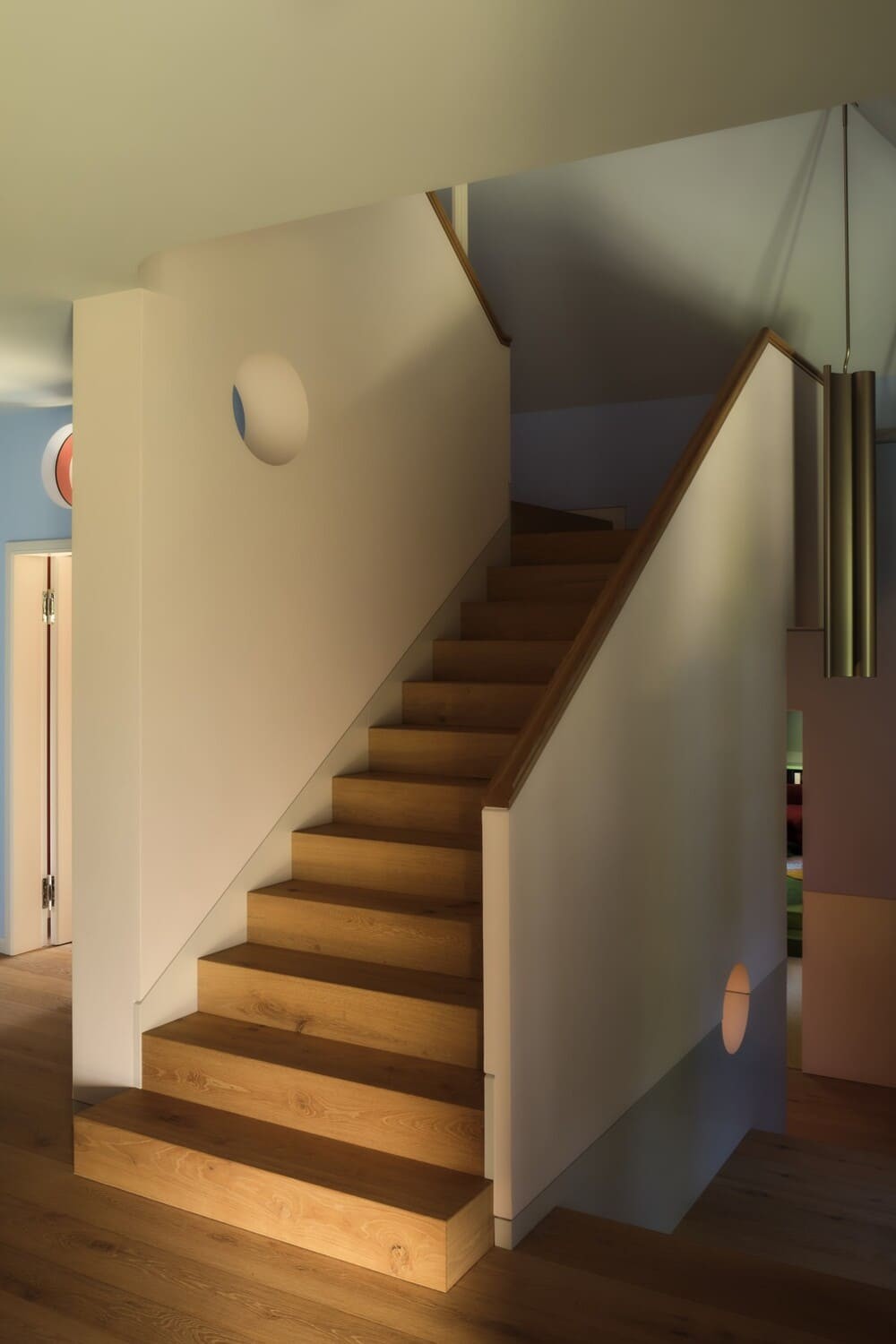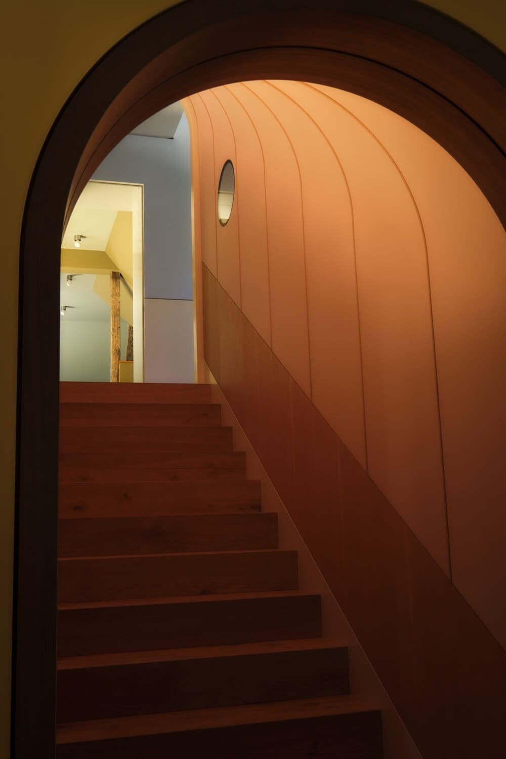 连接各楼层的楼梯被重新修建,作为重新设计的中心主题,Pöppler 将通道设计成圆形拱门。他打通了温室的入口,使空间感觉更大,同时通过安装椭圆形墙洞(借鉴了他所欣赏的意大利设计师 Luigi Caccia Dominioni 的设计),让更多的光线进入室内。建筑师解释说:“使窗户开口成角度是一种精心设计的方法,可以让窗户看起来比实际面积更大”,“这在瑞士尤为常见”。