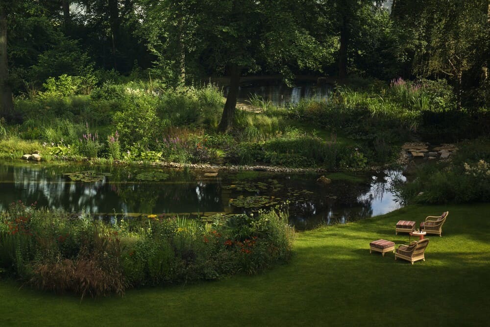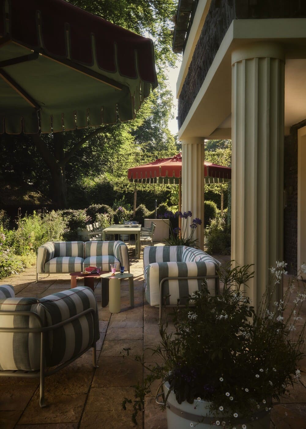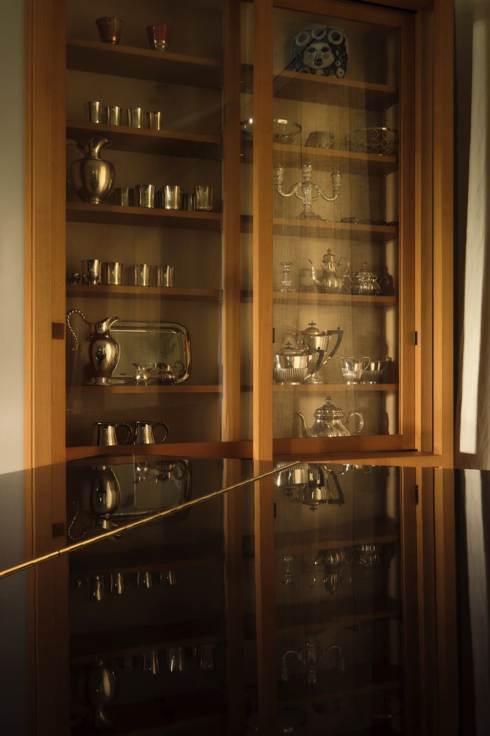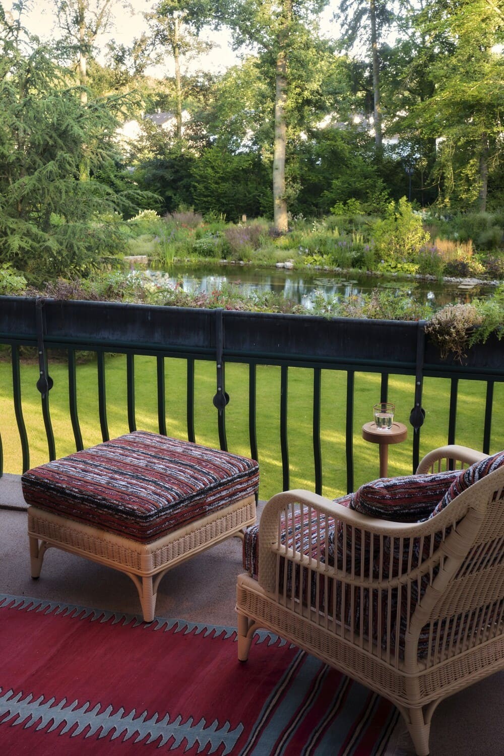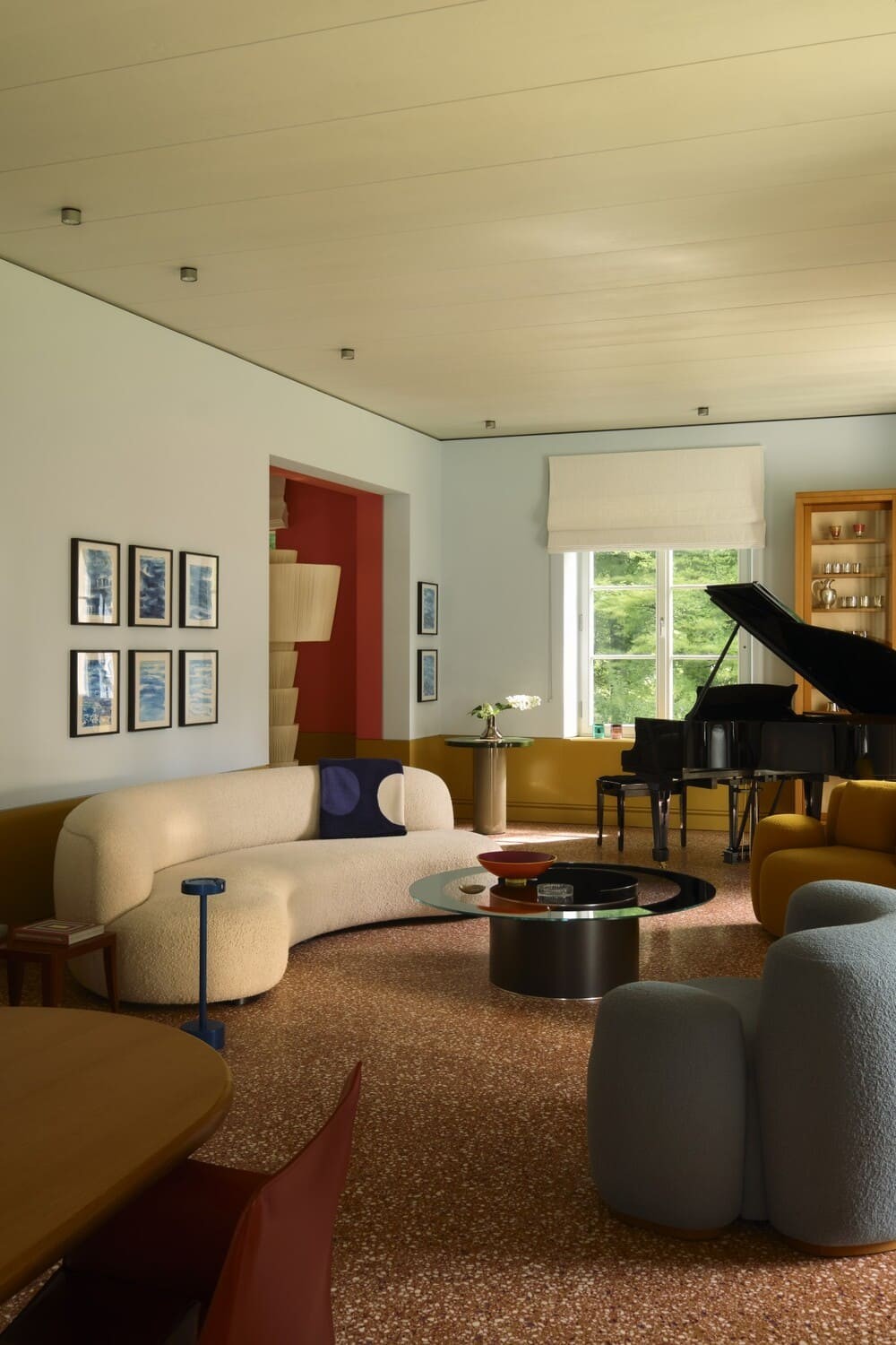 The Pütter-Ammers appreciate flowering meadows as one can see in the park that Berlin’s Royal Garden Academy created for them, with a large natural pool that looks like a pond serving as a swimming hole. The furniture in this welcoming house is made up of a mixture of design classics and pieces from Pöppler’s own furniture line. The fabrics for the sofa and armchair covers come from Dedar, Bute, Svenskt Tenn, and Le Manach, the latter now a collection under the Pierre Frey brand that Pöppler likes to work with as he says it offers greater flexibility when it comes to customization than almost anyone else. Even the door handles were specially designed and manufactured for the villa by a foundry in Belgium, perhaps motivated by a desire to honor Henry van de Velde’s Hohenhof. After two years of sweeping renovation work, it is this attention to seemingly minor details that convinced “impulse buyer” Pütter-Ammer that this house is now their home. “We will enjoy it for a very long time to come, I’m sure of it.”