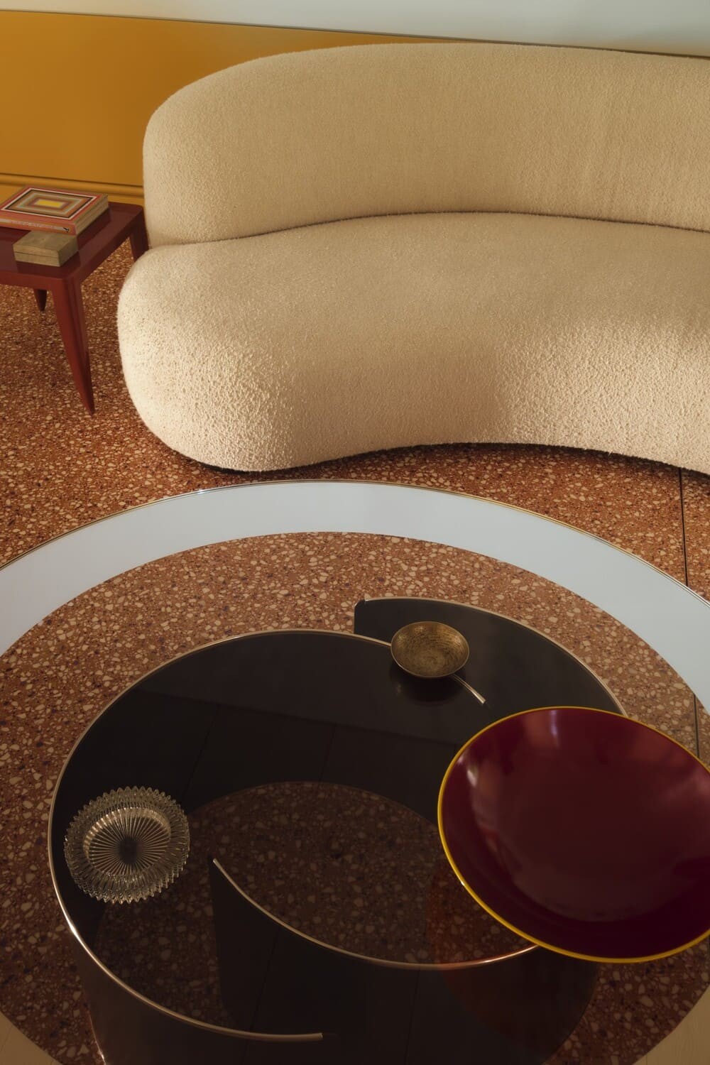 Pöppler 委托柏林的一位 “神奇怪人 ”专家在花园房间内铺设了红色水磨石地板,让人联想起霍亨霍夫宫内的装饰。在维尔茨堡附近的巴伐利亚小镇里姆帕尔(Rimpar)的木匠大师斯特凡-弗罗伊登贝格尔(Stefan Freudenberger)的带领下,另一个高度专业化的团队在那里的基座区域(以及入口处)的木板上添加了圆形板条,波普勒选择这样做是为了 “让房间看起来不那么空旷和光秃秃”。