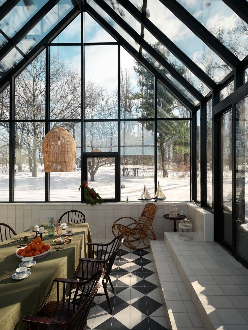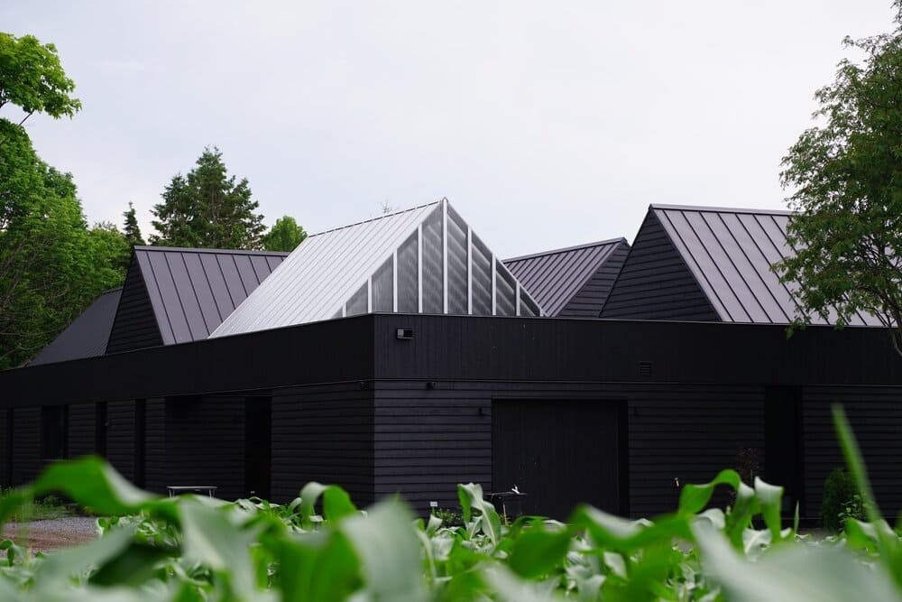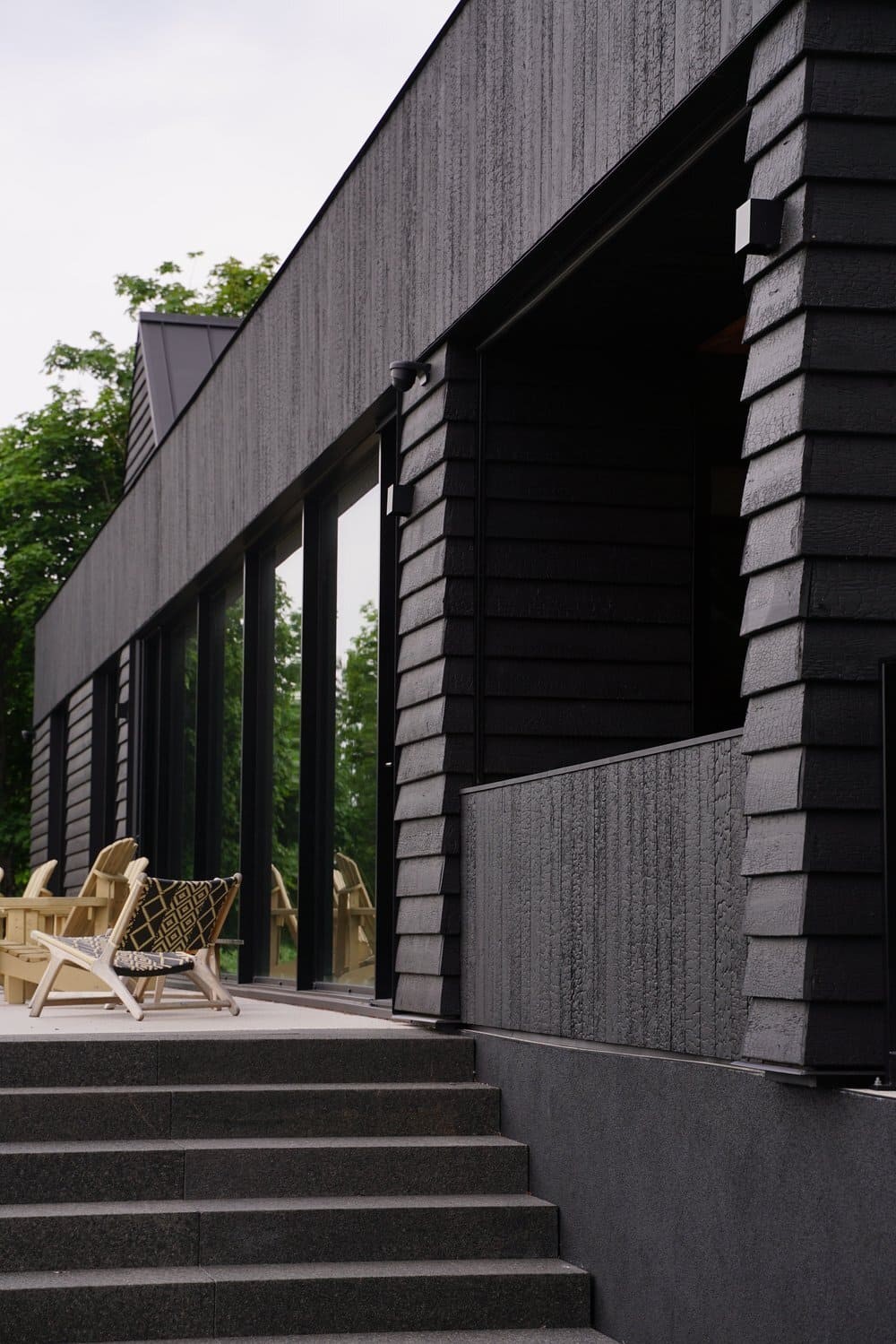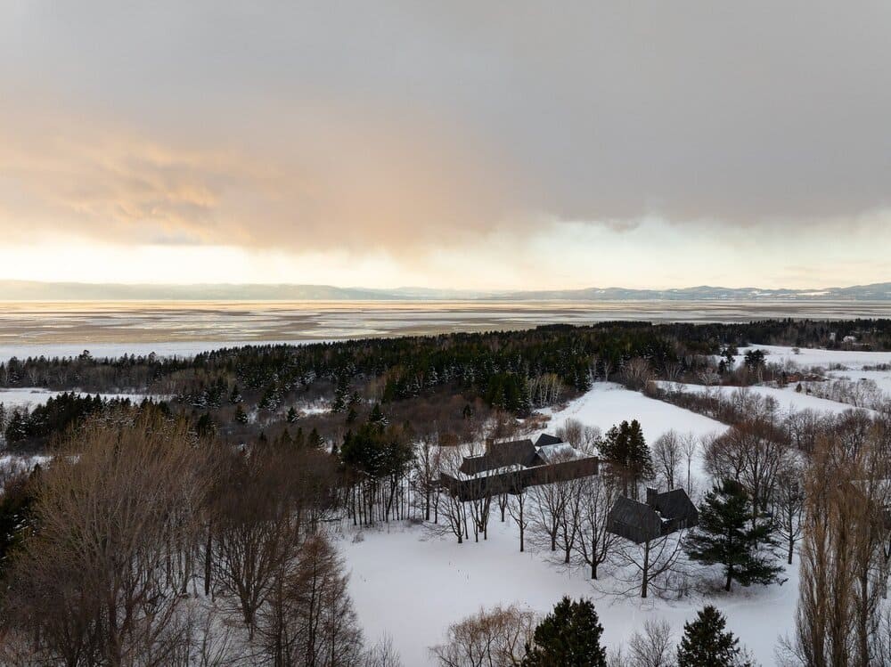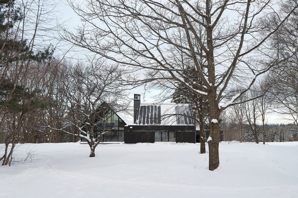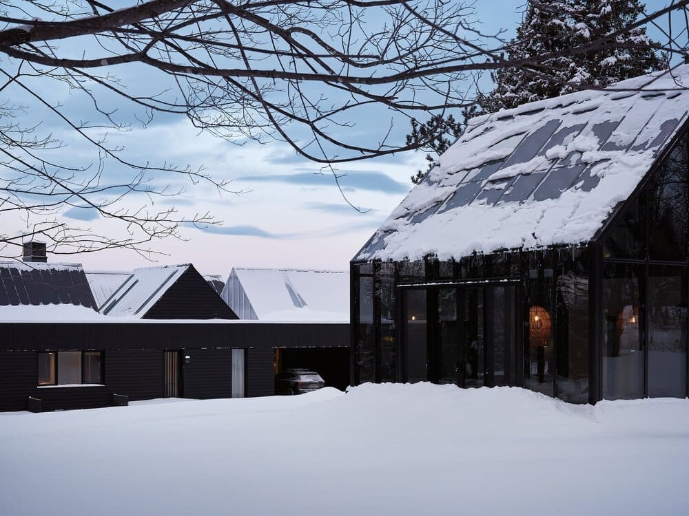 Situated on a site with a rich family history to the client, the residence is developed as a series of volumes assembled under one common roof. Each volume is thus given an orientation through its ceiling, that playfully resemble a village of pitched roof housing specific programs. The large fenestration offers a grand view on the fiery sunset, and each space provides intricacies such as reading nook for these avid readers. The custom black charred wood exterior cladding is both humble in the summer colors and a striking scene under the white blanket of winter. The original home was transformed into a wintergarden of a similar language, with the greenhouse and interior cement tiles as a way to link to a bygone era and passion for gardening of the owners.