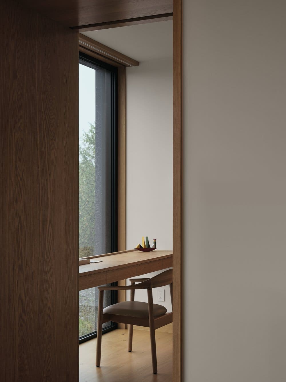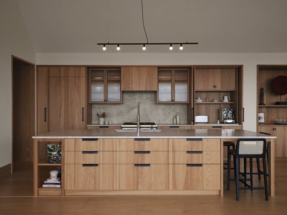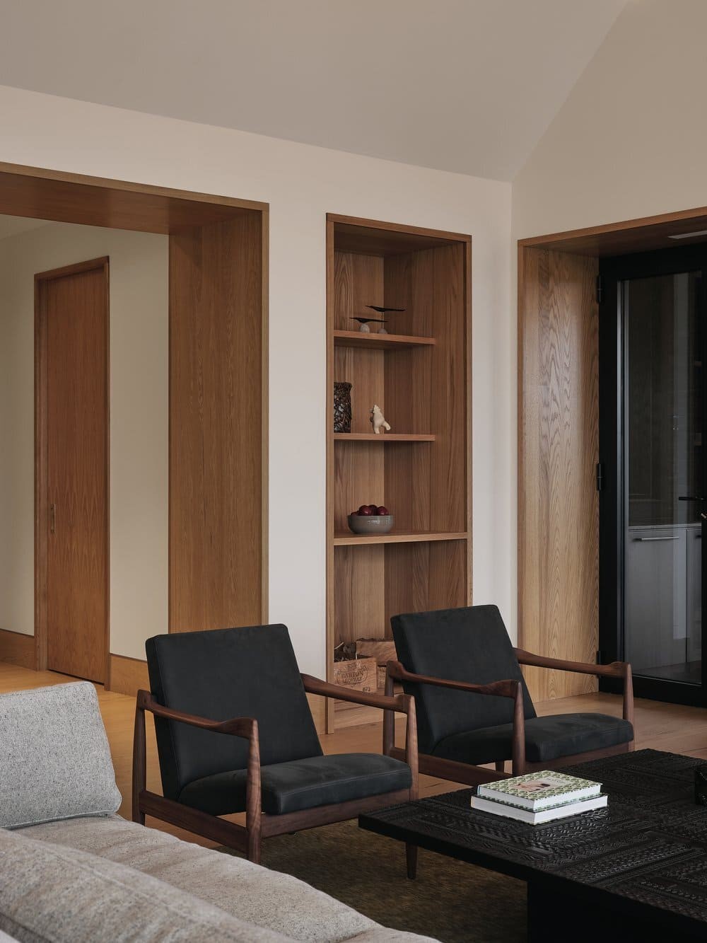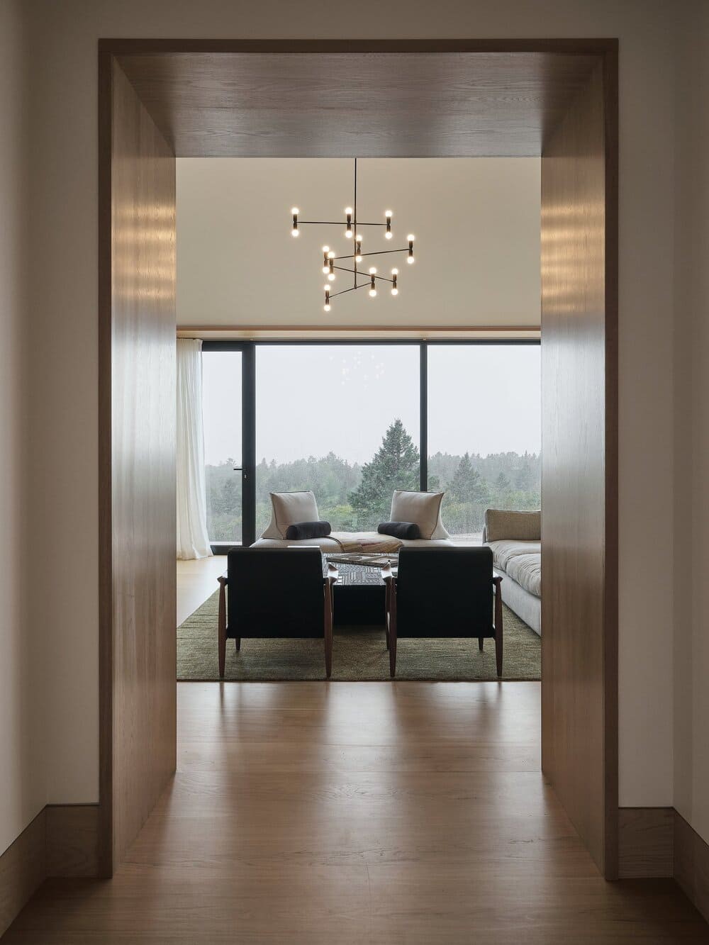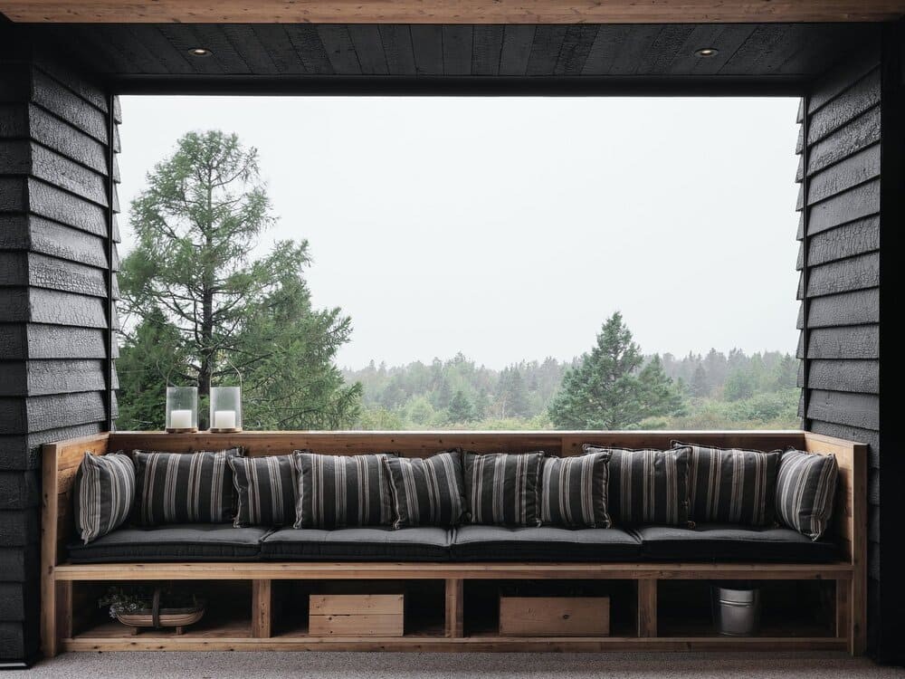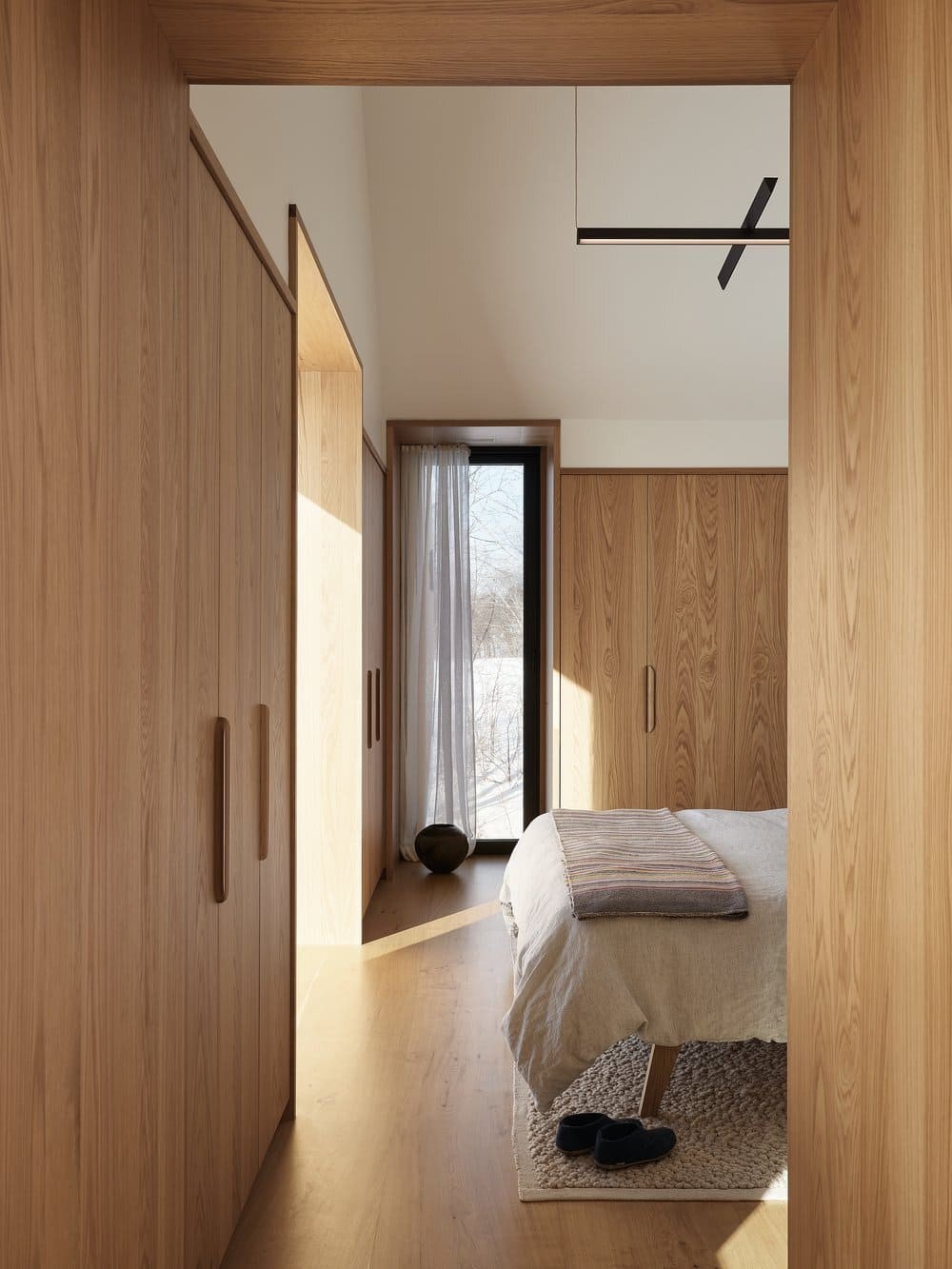 Situated on a site with a rich family history to the client, the residence is developed as a series of volumes assembled under one common roof. Each volume is thus given an orientation through its ceiling, that playfully resemble a village of pitched roof housing specific programs. The large fenestration offers a grand view on the fiery sunset, and each space provides intricacies such as reading nook for these avid readers. The custom black charred wood exterior cladding is both humble in the summer colors and a striking scene under the white blanket of winter. The original home was transformed into a wintergarden of a similar language, with the greenhouse and interior cement tiles as a way to link to a bygone era and passion for gardening of the owners.