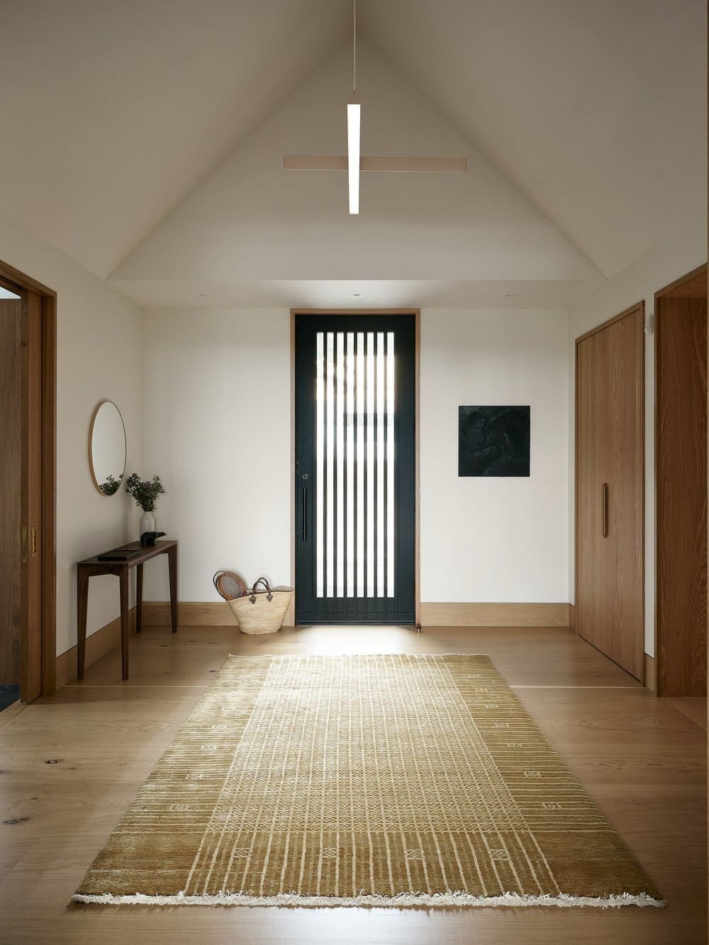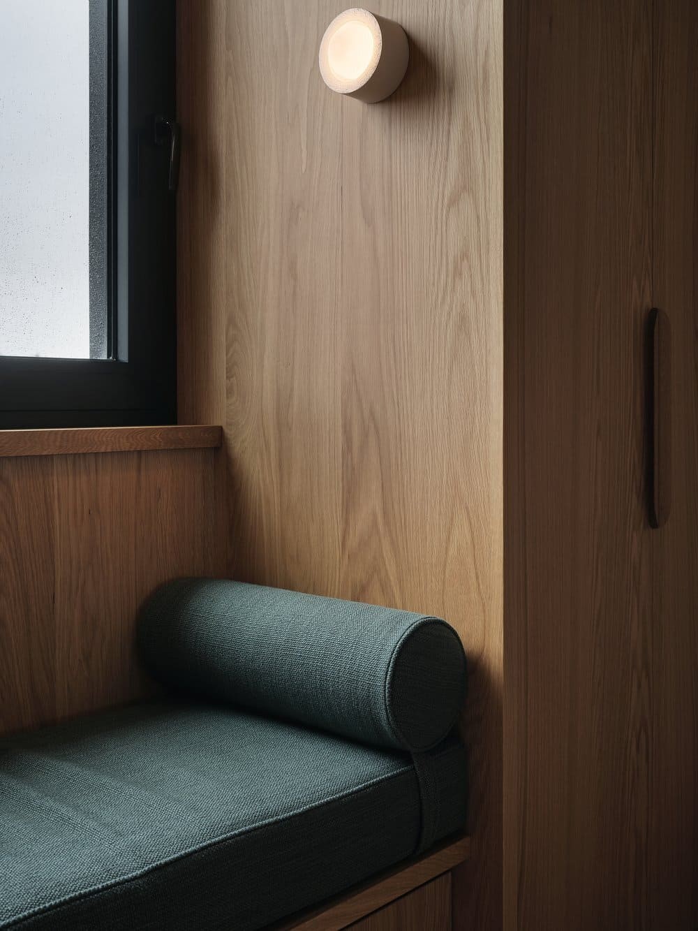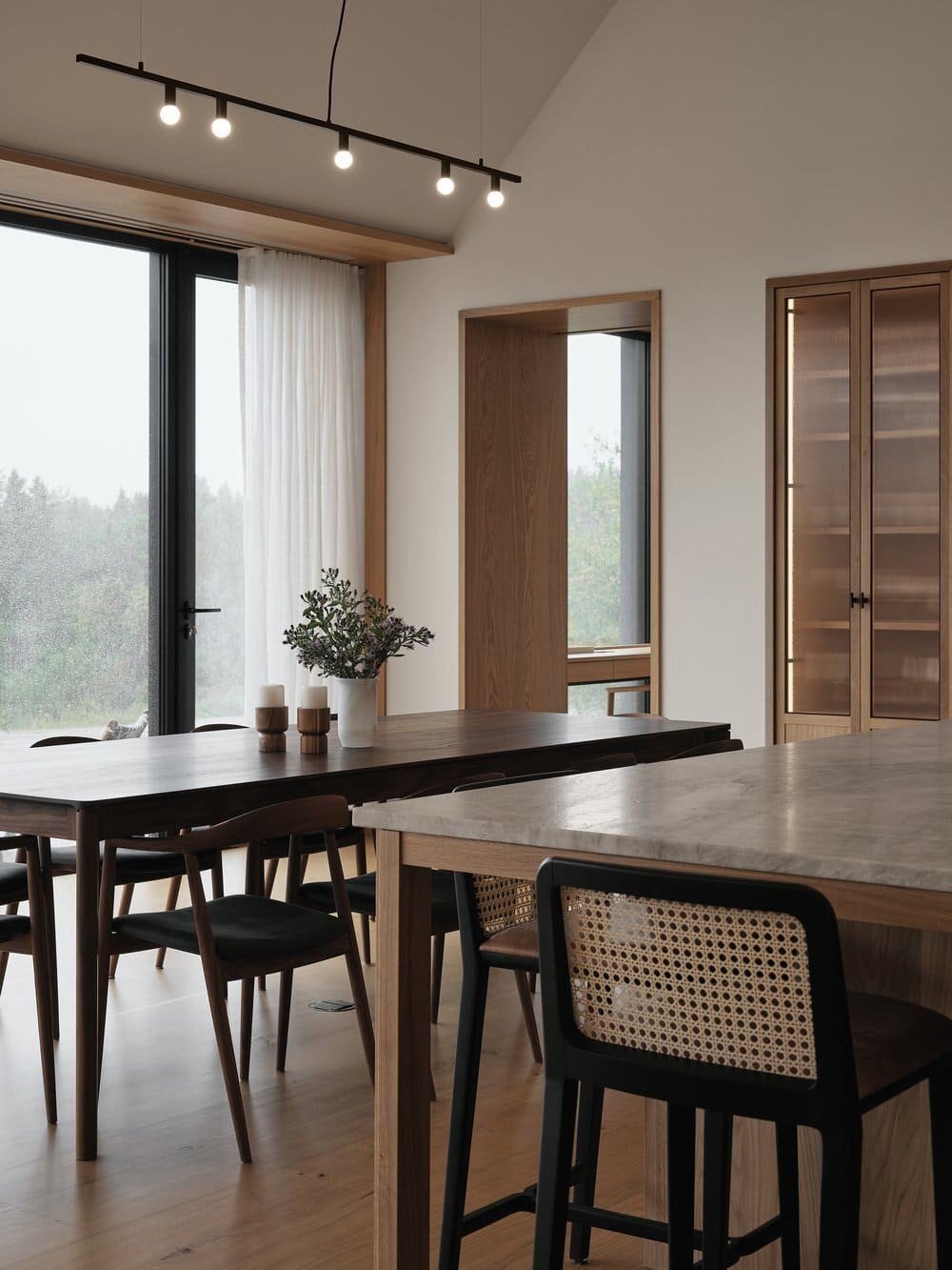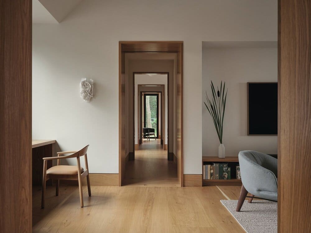 该住宅坐落于客户家族历史悠久的地块上,由一系列建筑体量组成,它们被集中在一个共同的屋顶下。因此,每个体量都通过天花板确定了方向,就像一个村落的斜屋顶,容纳了特定的项目。大面积的玻璃窗将火红的夕阳尽收眼底,每个空间都为这些狂热的读者提供了复杂的阅读空间。定制的黑色焦木外墙在夏日的色彩中显得朴实无华,而在冬日的白色毯子下又是一道引人注目的风景。原来的住宅也被改造成了一个类似的冬季花园,温室和室内水泥砖是连接过去时代和业主对园艺热情的一种方式。