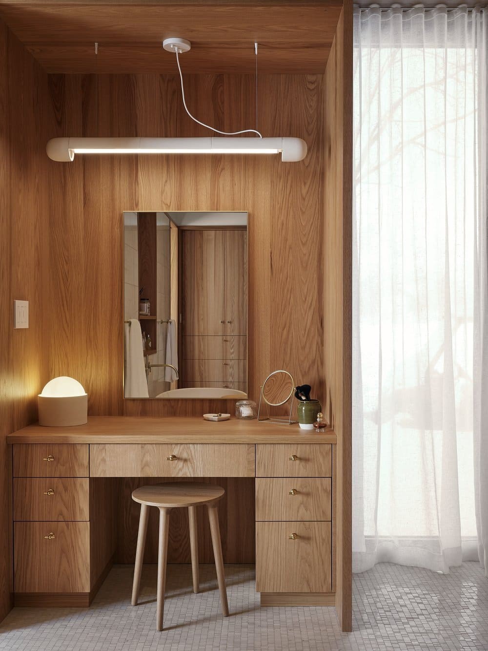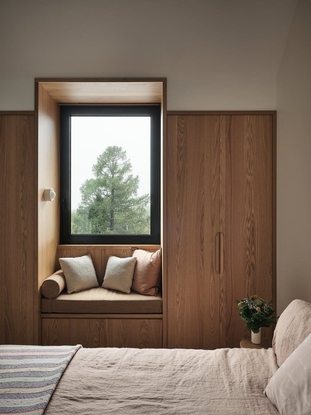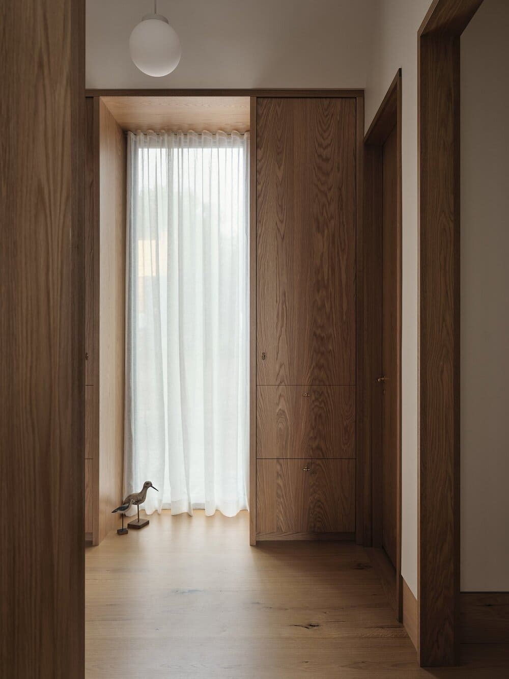 该住宅坐落于客户家族历史悠久的地块上,由一系列建筑体量组成,它们被集中在一个共同的屋顶下。因此,每个体量都通过天花板确定了方向,就像一个村落的斜屋顶,容纳了特定的项目。大面积的玻璃窗将火红的夕阳尽收眼底,每个空间都为这些狂热的读者提供了复杂的阅读空间。定制的黑色焦木外墙在夏日的色彩中显得朴实无华,而在冬日的白色毯子下又是一道引人注目的风景。原来的住宅也被改造成了一个类似的冬季花园,温室和室内水泥砖是连接过去时代和业主对园艺热情的一种方式。