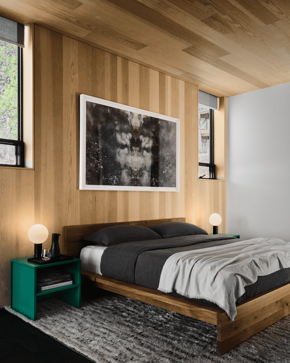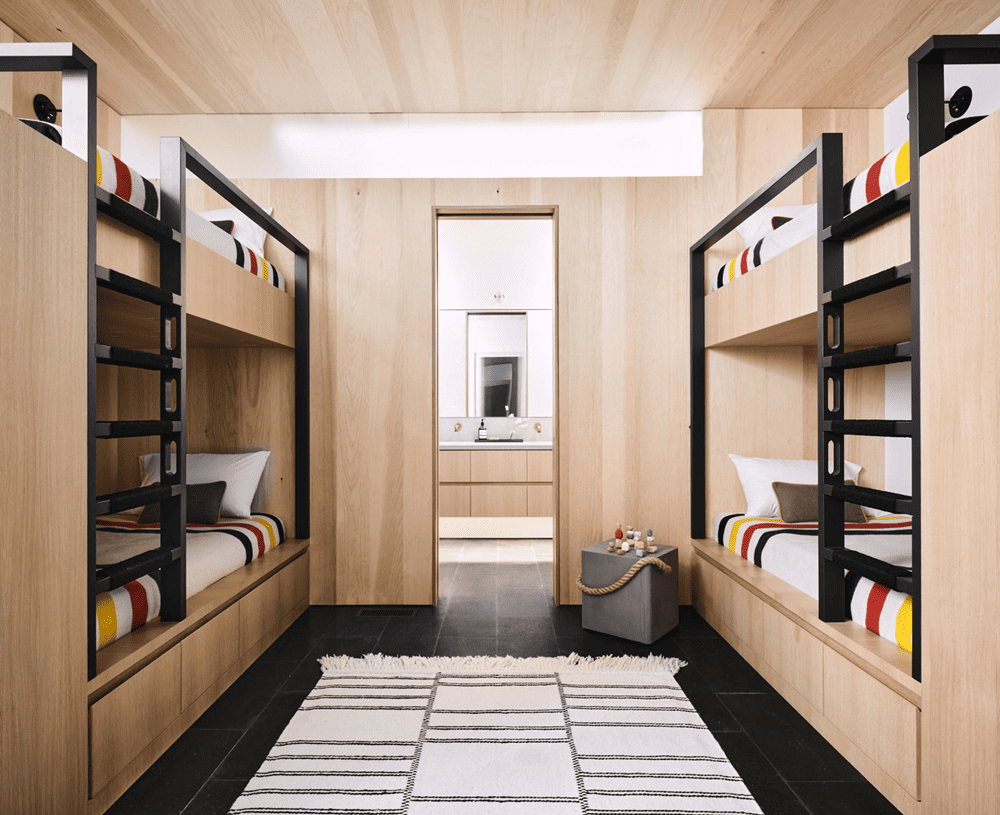 在书房内,一个由 Kroll Furniture制作的定制卧铺沙发上铺着 Silver State Textiles的靛蓝色户外织物。Pampa 公司定制的海蓝色羊毛地毯为这个空间增添了情调。为孩子们准备的双层床铺有Pendleton的羊毛条纹毛毯,而地板则铺有CB2的平织羊毛棉混纺地毯。在客房内,可以看到 EQ3 的象牙色和灰色羊毛粗毛地毯,以及用深灰色织物装饰的 Room & Board 大号床架,床脚处则是橡木长凳和丹佛现代皮革座垫。