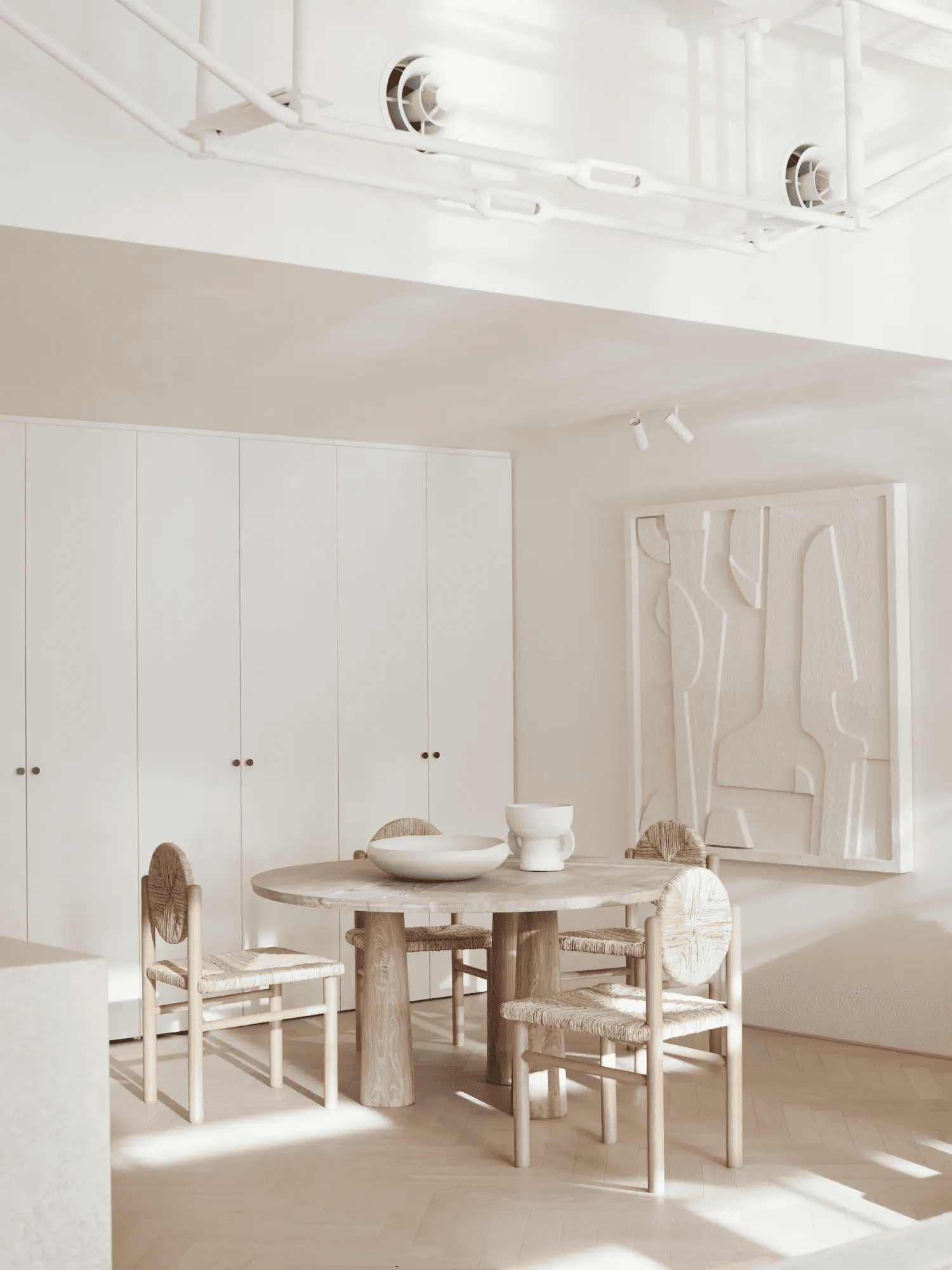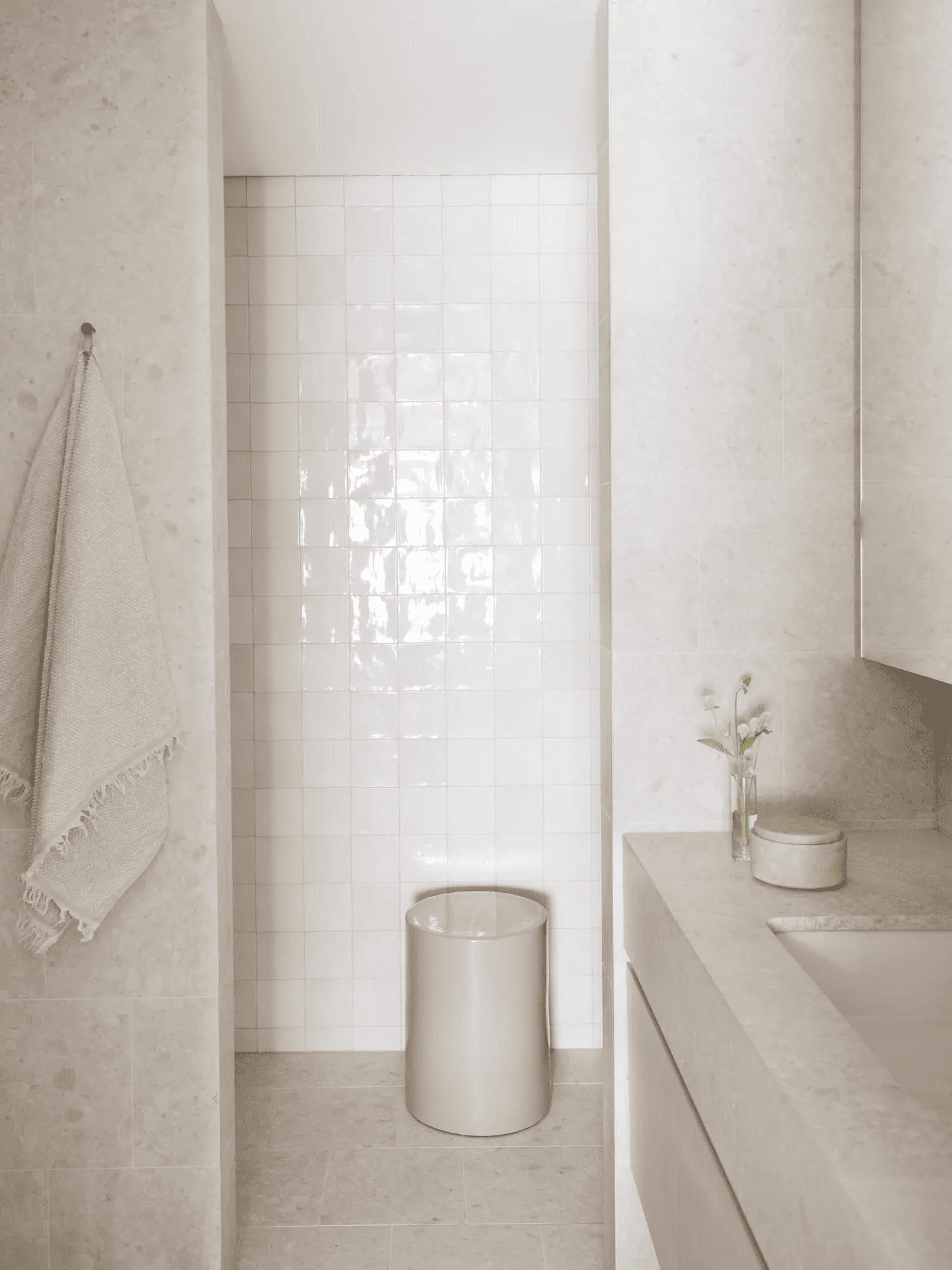 In terms of material and colour selection, the design team aimed to create a bright, light and timeless spatial atmosphere, allowing the external view to become the protagonist of the space. The foundational palette includes lime-washed oak herringbone parquetry flooring, Savannah marble benchtops, and crisp white painted walls.