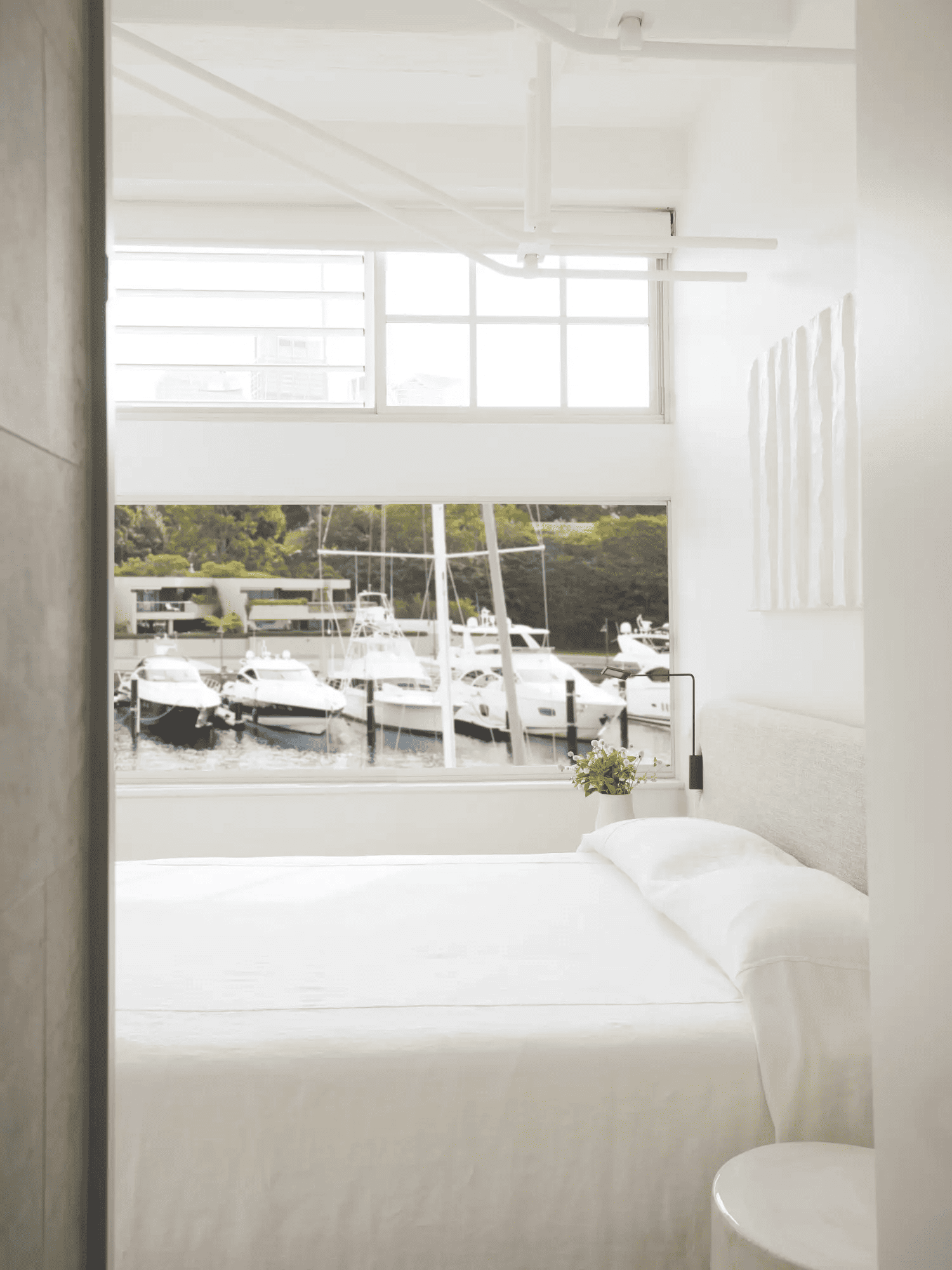 These materials collectively establish a neutral yet warm backdrop, effectively drawing the external harbour scenery into the interior.
