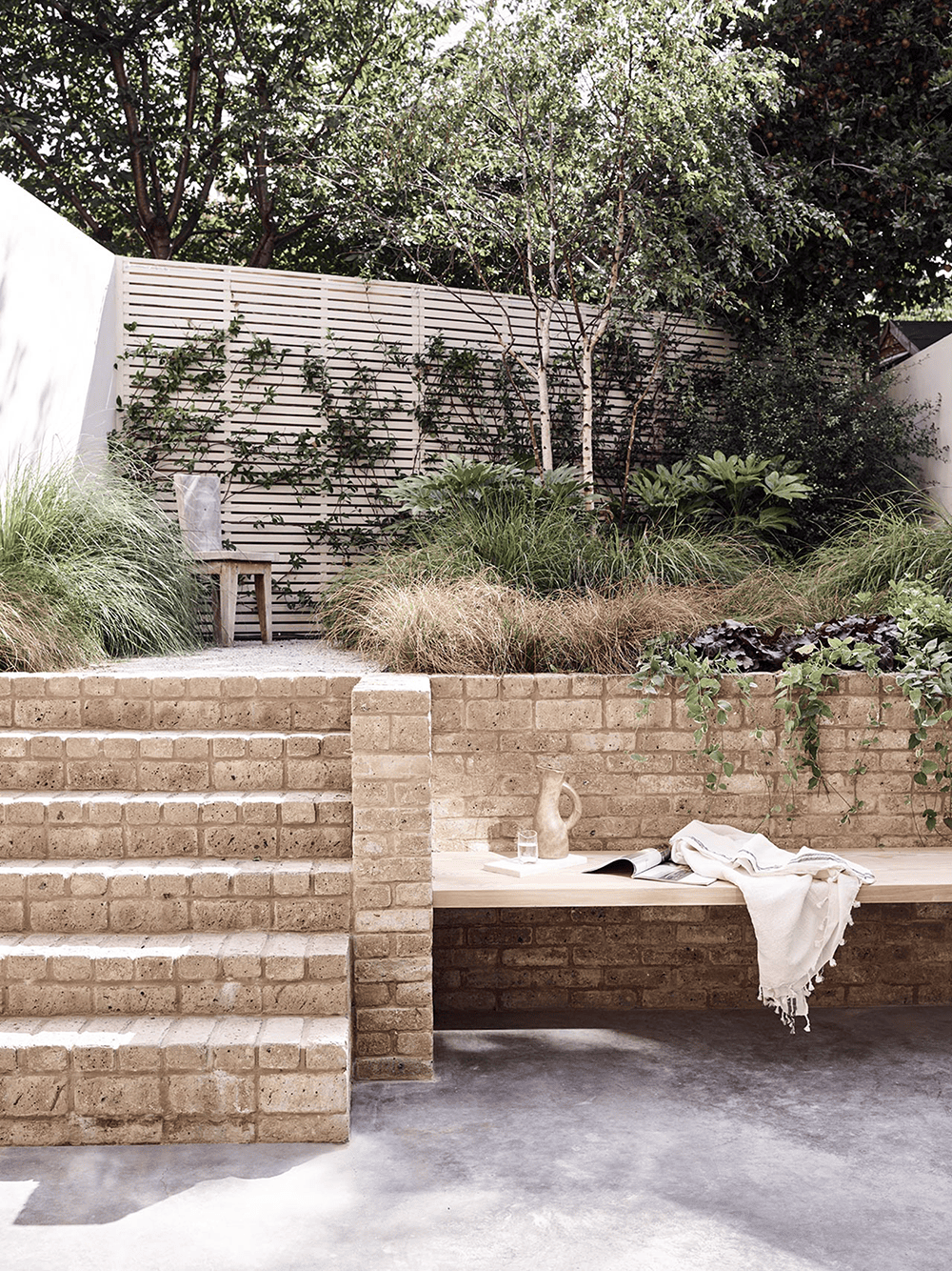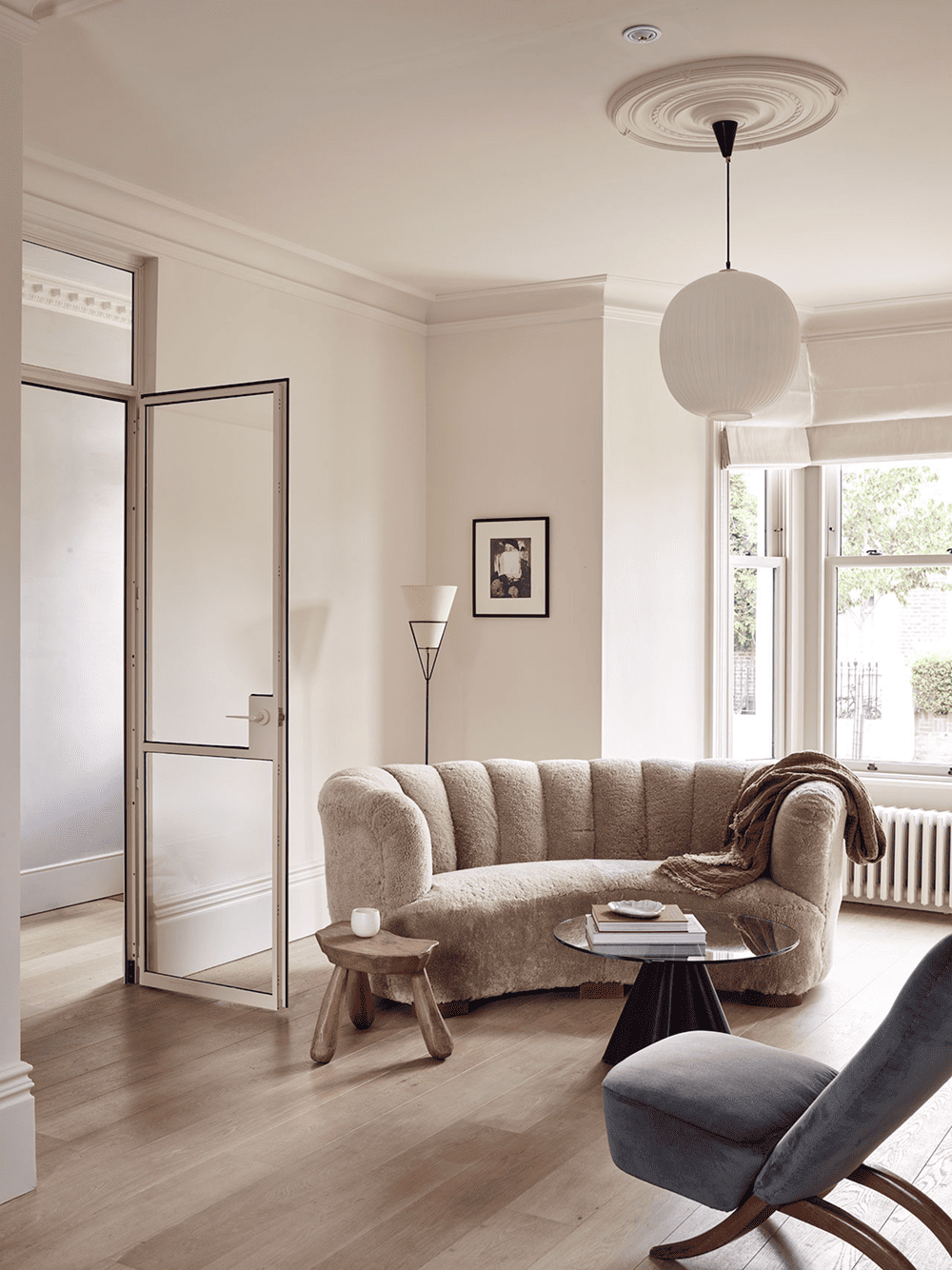 The most intentional part of the renovation was the excavation of the building's basement, where a spacious, light-filled sunken kitchen and living room were created and seamlessly connected to the outdoor garden via floor-to-ceiling glass and a continuous polished concrete other interior. The space boasts a bespoke kitchen in beautiful Douglas fir and honed Evora marble, and its tonal subtlety and minimalist ease are reflected in the landscaped gardens designed by Lauren Finch's Tyler Goldfinch.