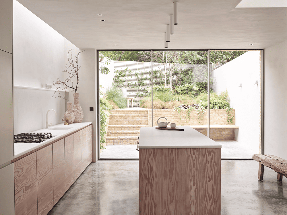 翻新工程中最用心的部分是对建筑地下室的挖掘,在这里创造了一个宽敞的、充满光线的下沉厨房和客厅,并通过地板到天花板的玻璃和连续的抛光混凝土另室内的地板与户外的花园无缝连接。该空间拥有一个精美的道格拉斯枞木和磨光的埃沃拉大理石的定制厨房,其色调的微妙和极简主义的轻松反映在Lauren Finch的Tyler Goldfinch设计的景观花园中。