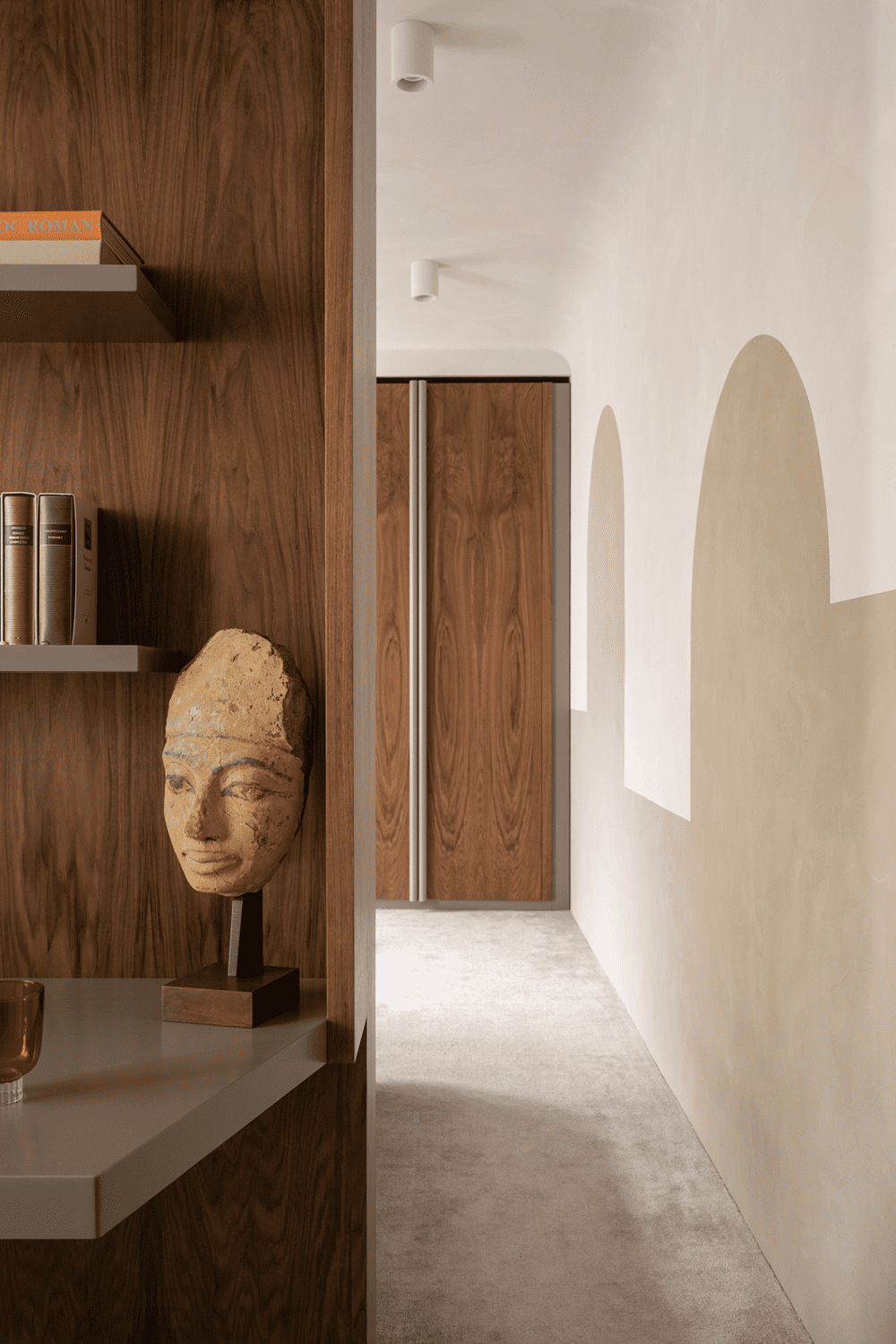 A restrained selection of finishes and a formal strategy making abundant use of curved shapes to avoid hard shadows all contribute in creating a peaceful space, where sound, light & vision all become part of a coherent whole.