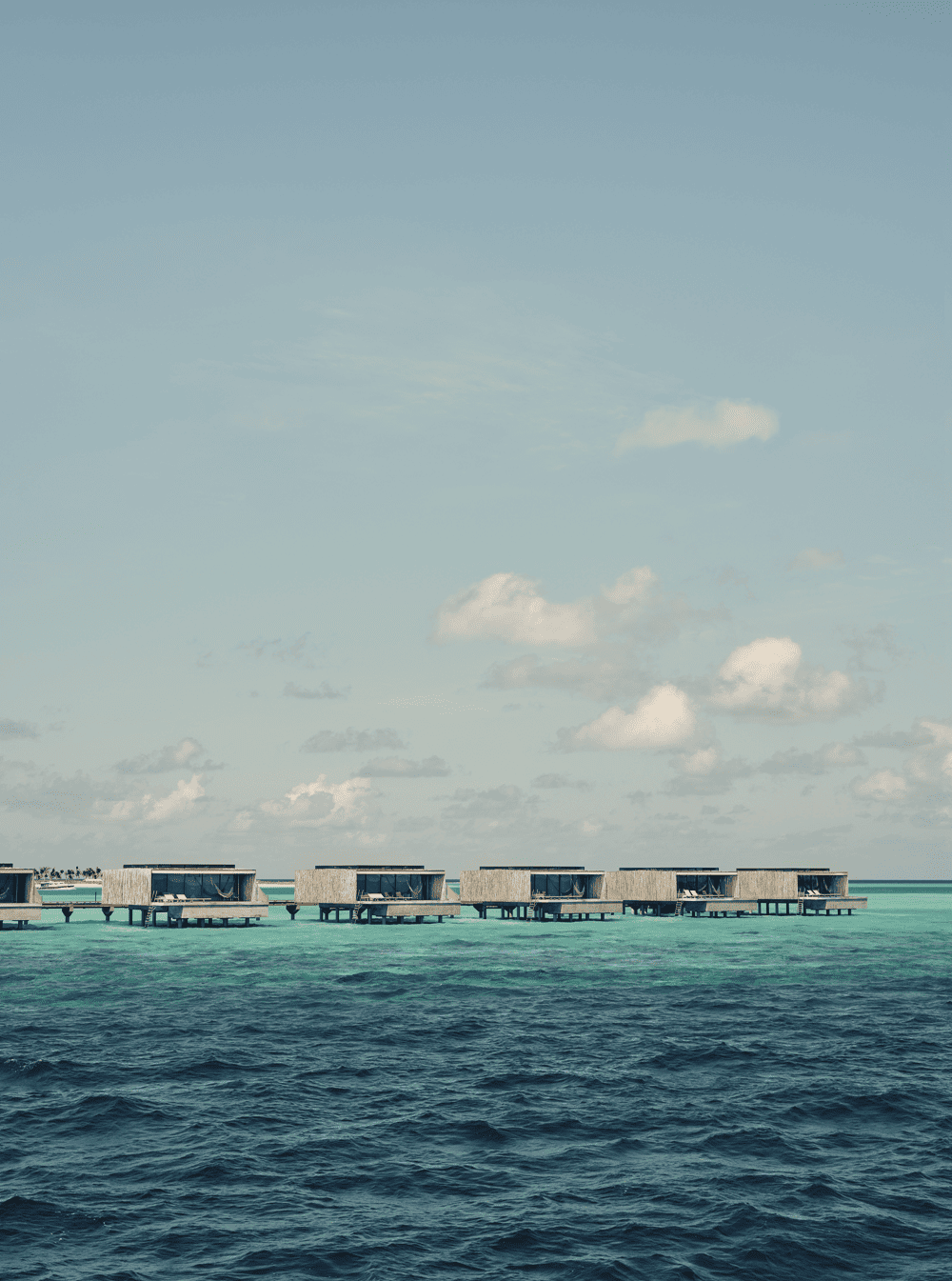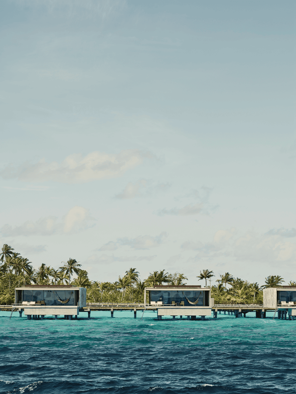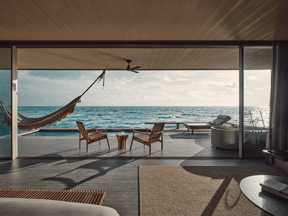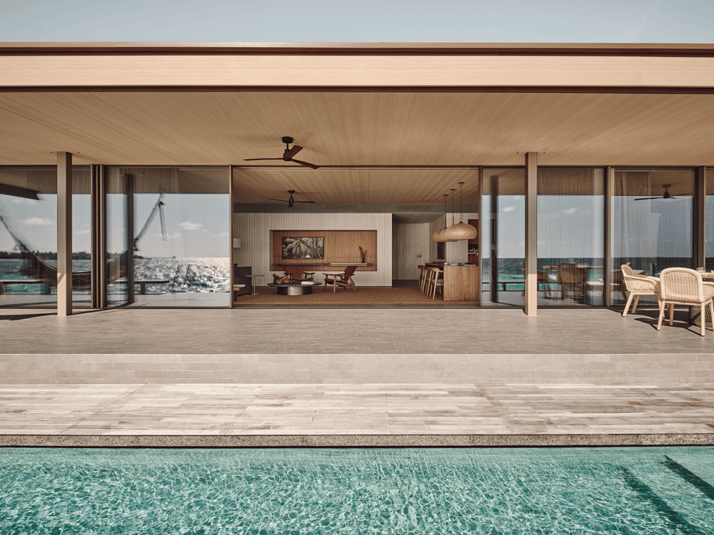A floor-to-ceiling panoramic sliding window system, exclusive to the Maldives, allows the villa to open to all three side elements, while customised blackout blinds provide cocooning comfort at the push of a button.