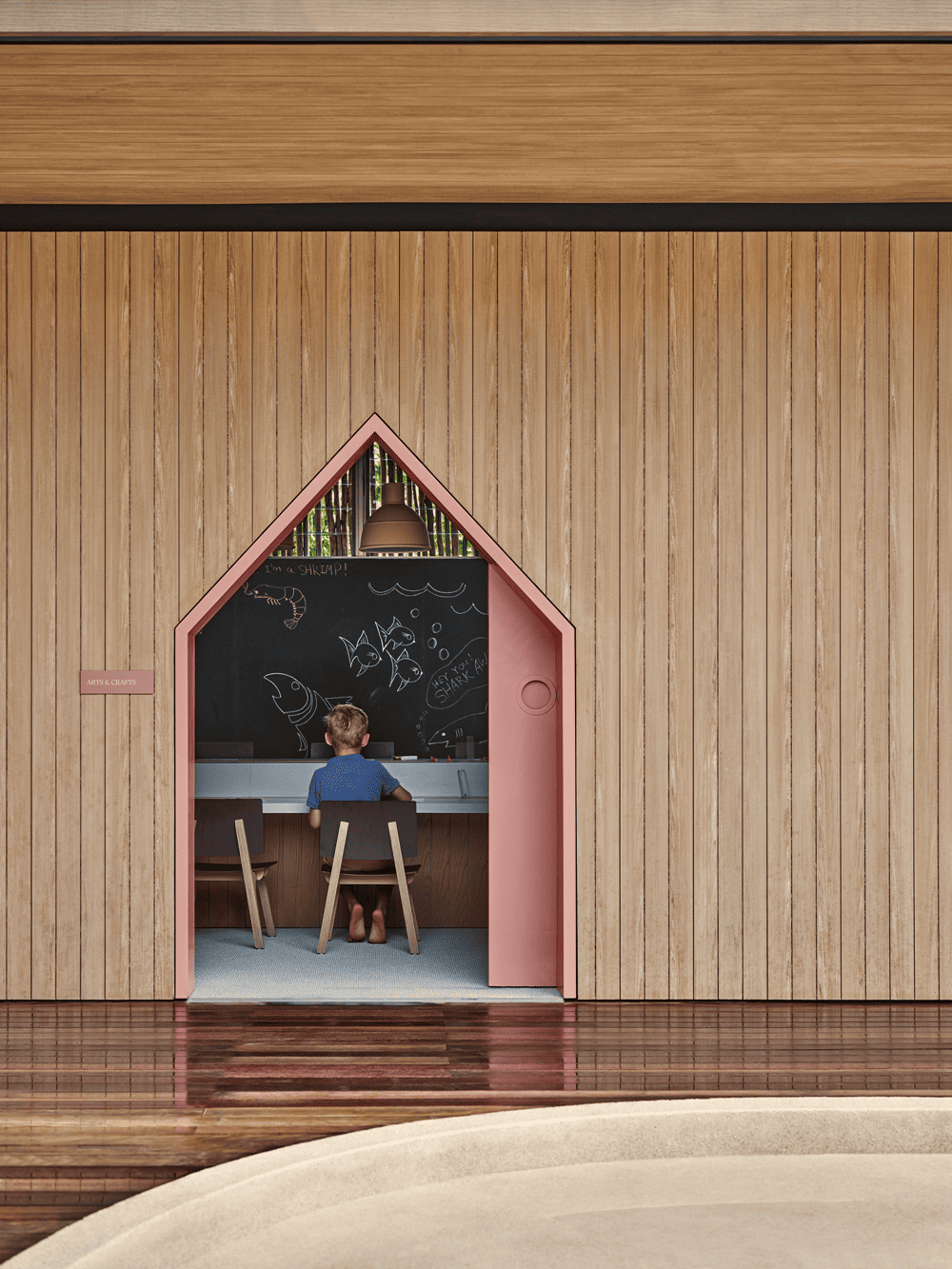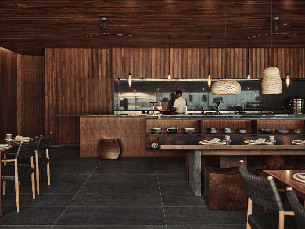 Commissioned to integrate the large James Turrell Pavilion with numerous retail and dining venues, the permeable design of the island building creates a gentle transition between open and enclosed spaces, organised according to a hierarchy of textures and coverings.