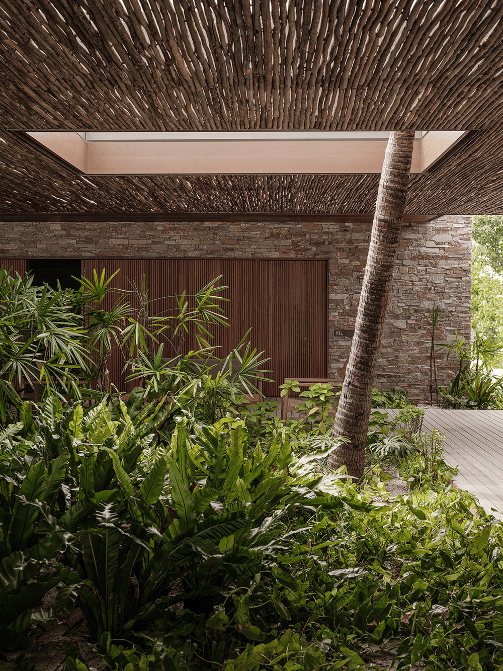 Throughout the interior, rustic palettes, subtle textures and matte surfaces are complemented by rustic materials that create a dialogue with nature. Wood, linen, rattan, paper ropes, stone and natural fibres extend from the interior, blurring the boundaries and attracting the outside world as well as the ‘inhabitants’ of the place.