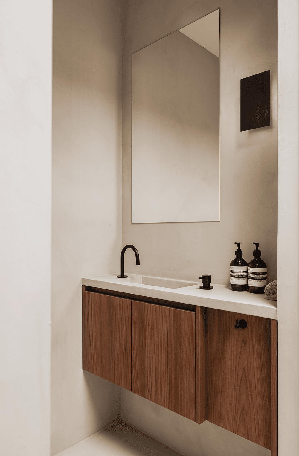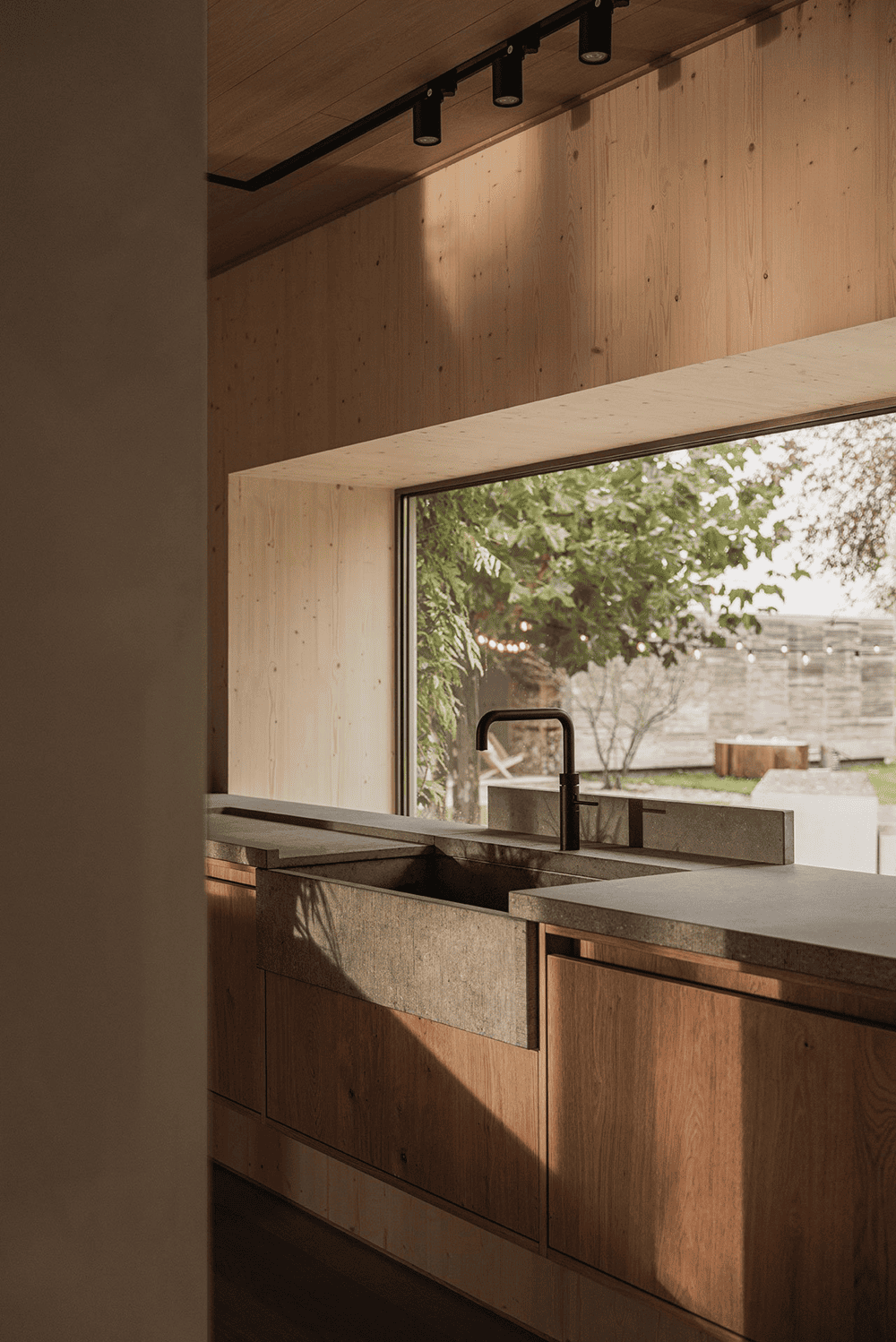 Carefully curated stacked bricks form a fireplace that fits within the proportions of the house. Slightly longer bricks than usual were chosen to reflect the horizontal characteristics of the bungalow. This can also be found in the several long cantilevered windows that frame the views as if it were a work of art. The use of light tracks with directional spotlights enhances this feeling. A subtle nod to the origins of the artist’s home.