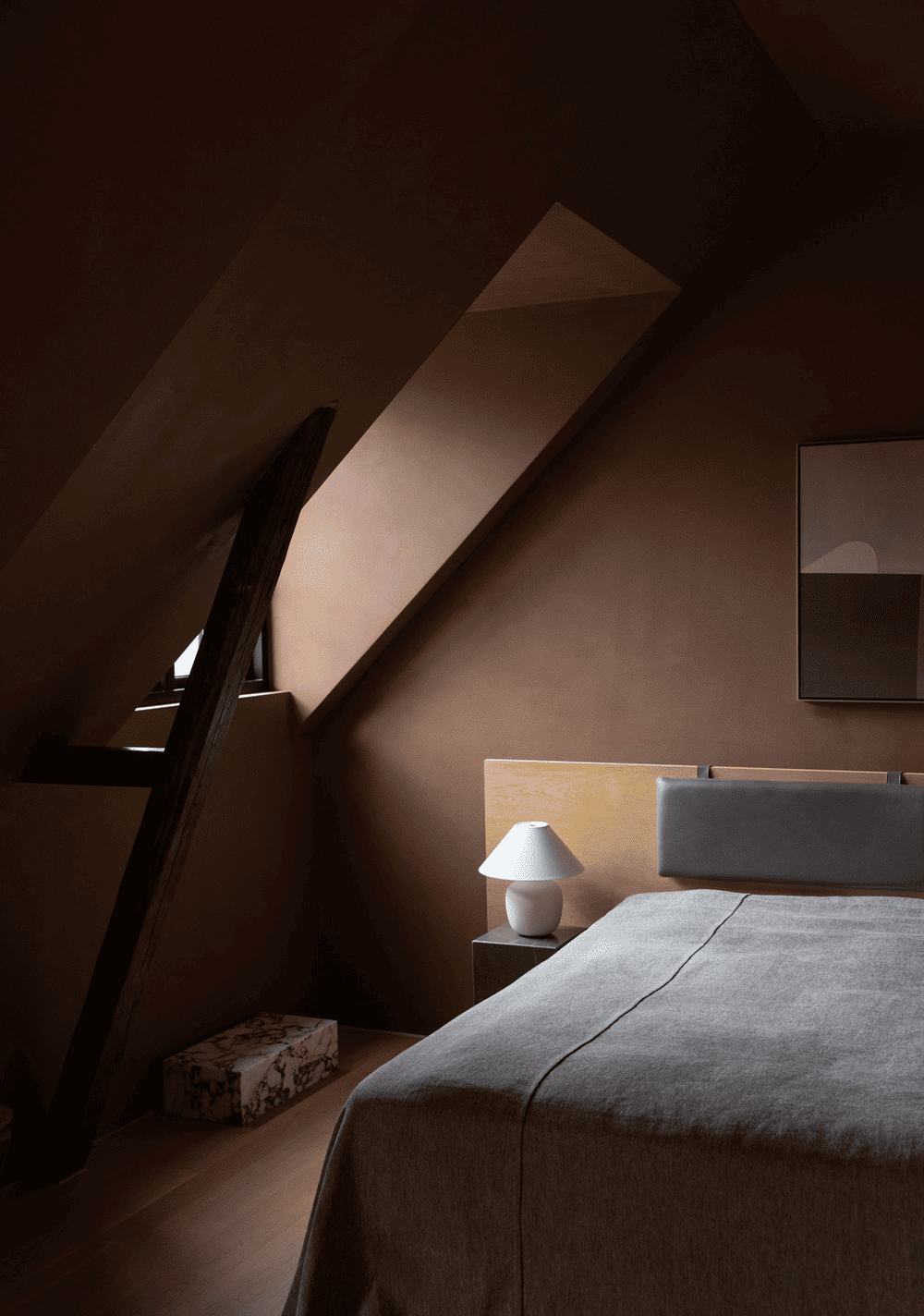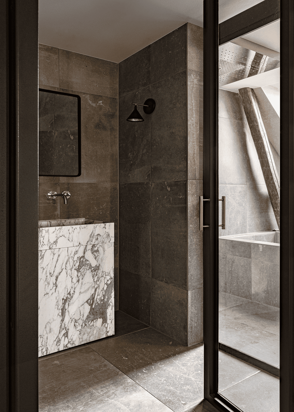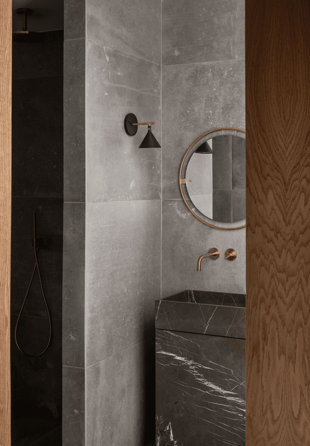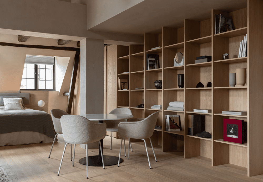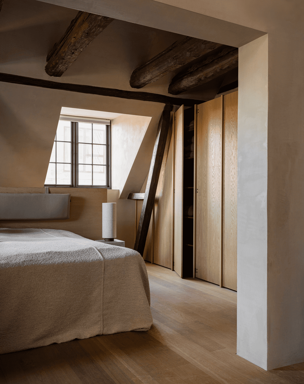 Lead architects Jonas Bjerre-Poulson and Peter Eland of Norm Architects completed a complete renovation of this magnificent 1918 building, one of the oldest in the area. The designers wanted to celebrate the building's historic character by retaining the neo-baroque façade, while telling a contemporary story inside the building, which is shrouded in earthy tones and timeless beauty.