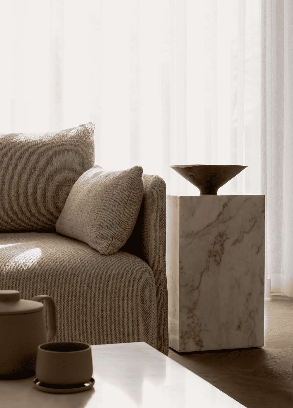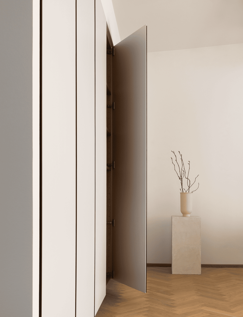 The bedrooms combine the inherent warmth of wood with the tactile feel of textiles for a haven of tranquillity. Carefully curated interior details and materials stand out in a subtle way when clutter and superfluous decorations are removed.