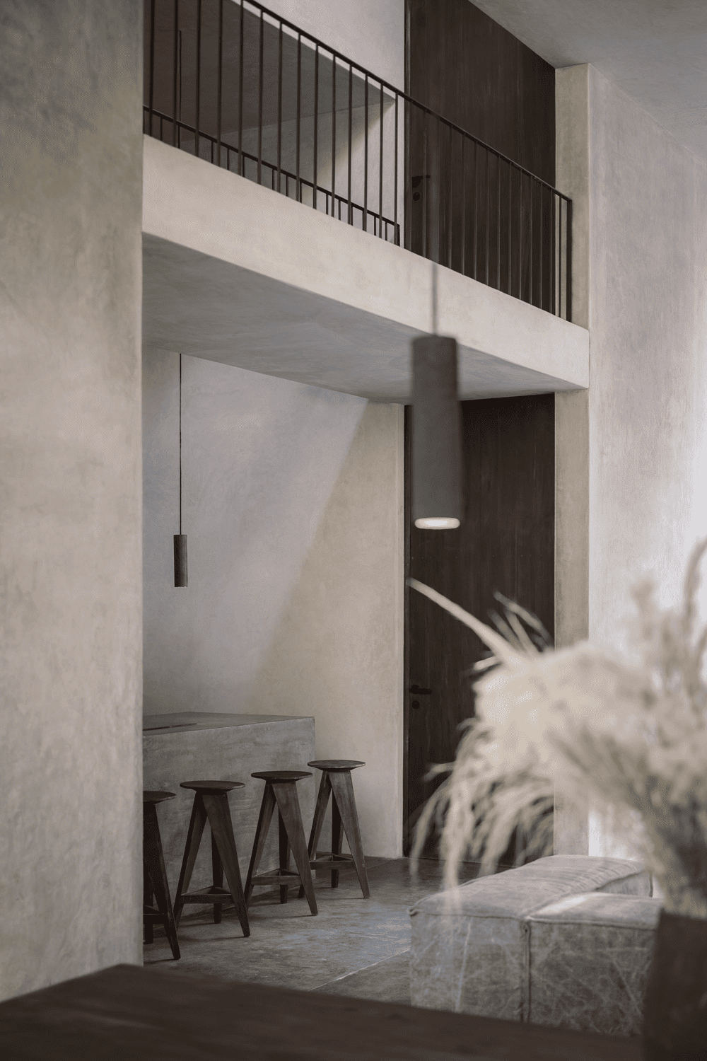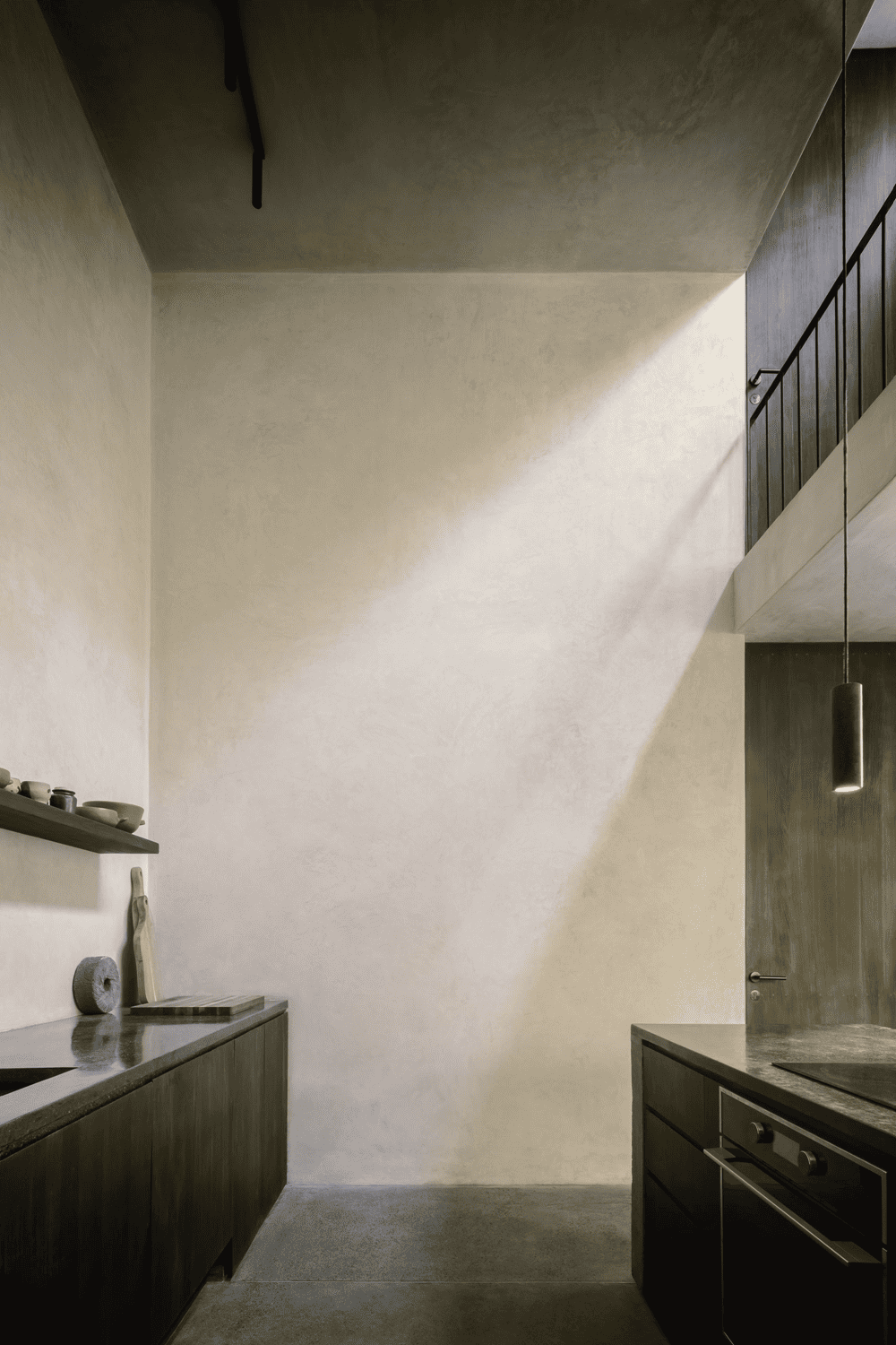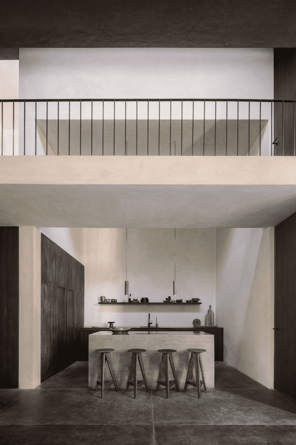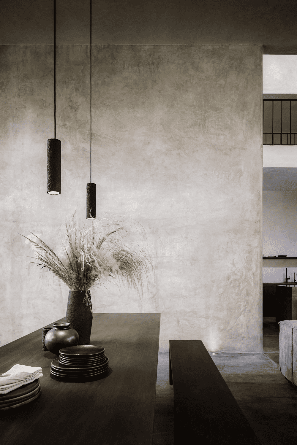 Designed and built by CO-LAB, the house is surfaced with handmade finishes. The warm grey polished cement walls contrast with black terrazzo floors. Charred cedar wood carpentry complements the neutral palette.