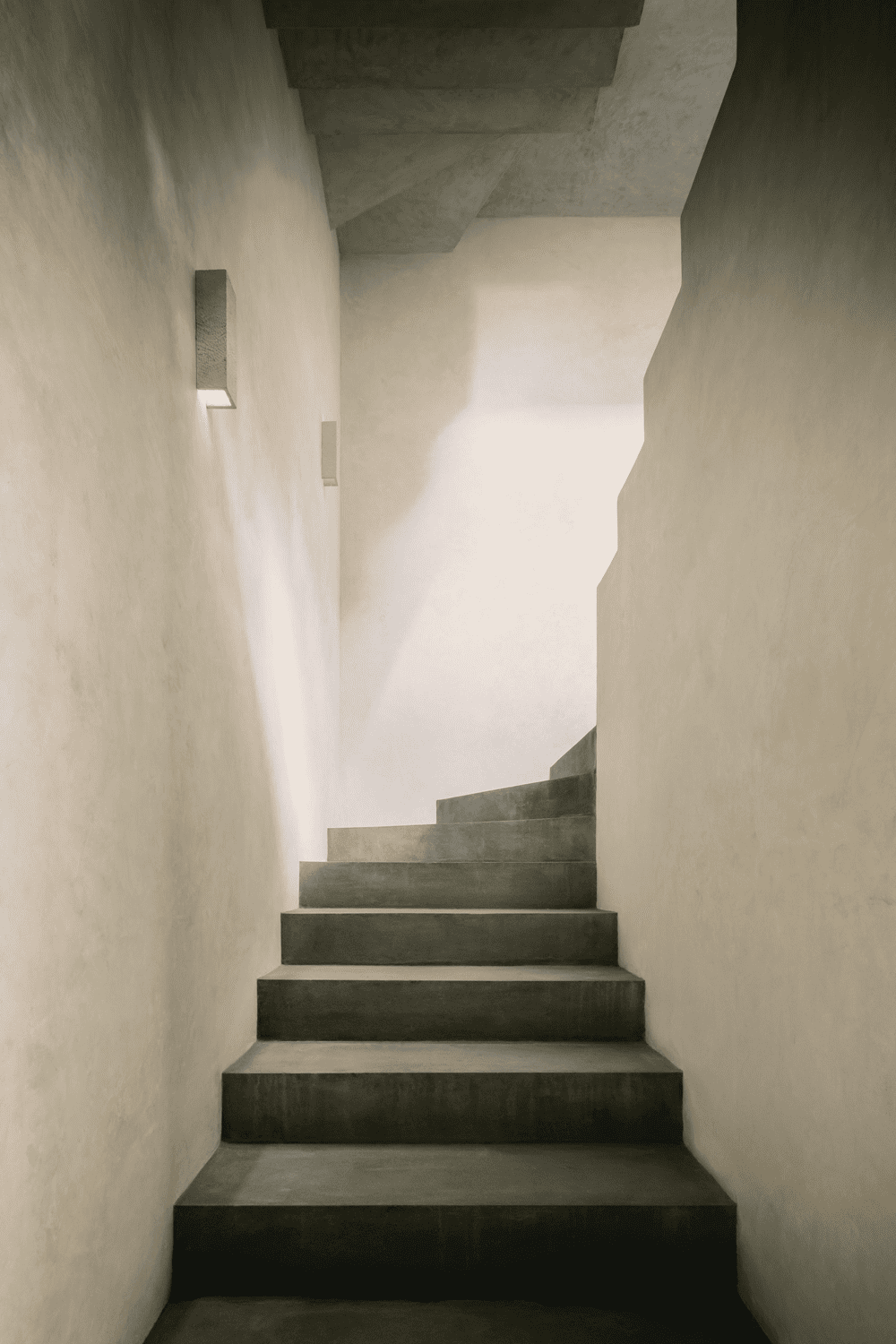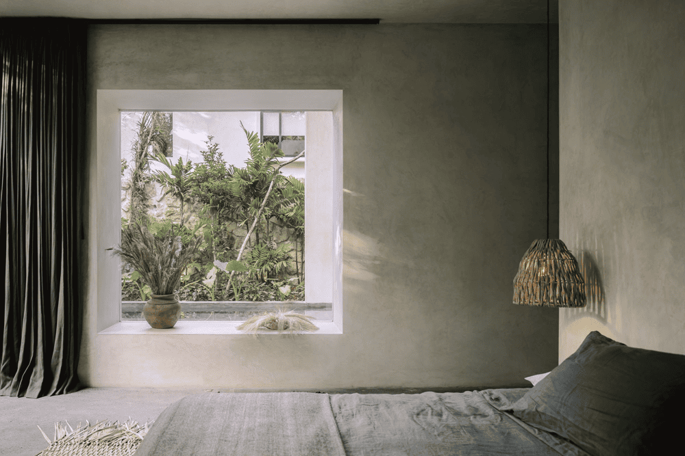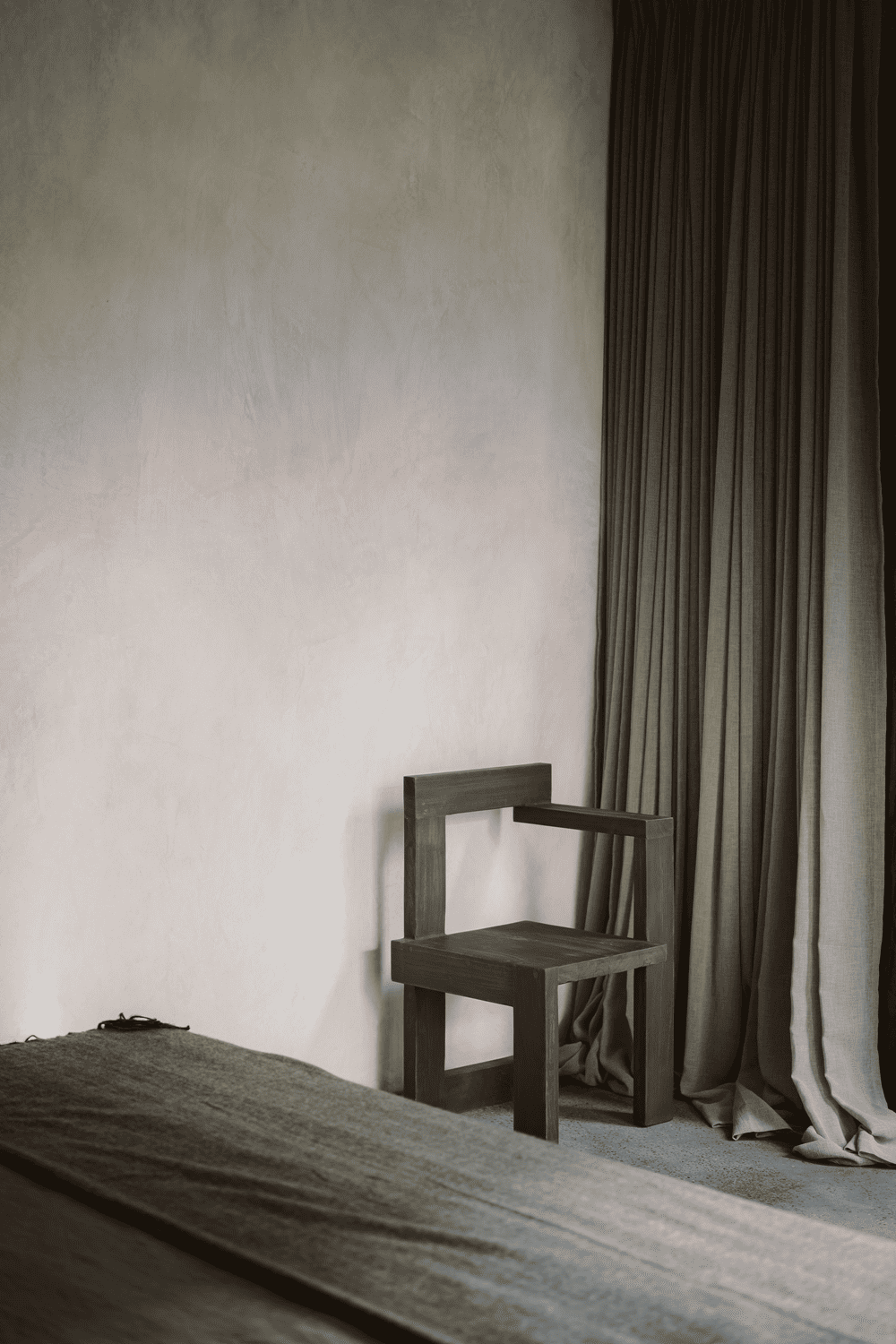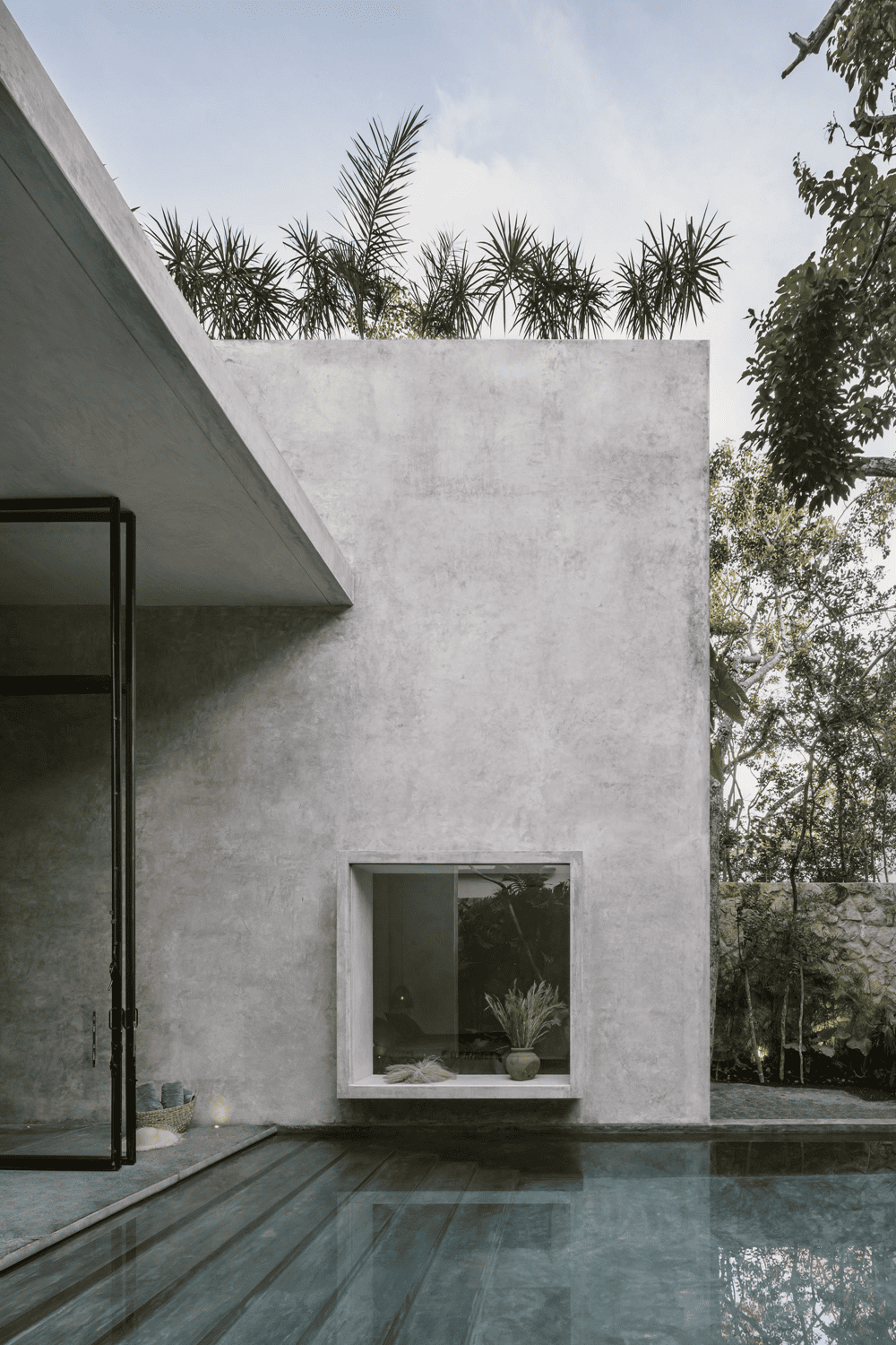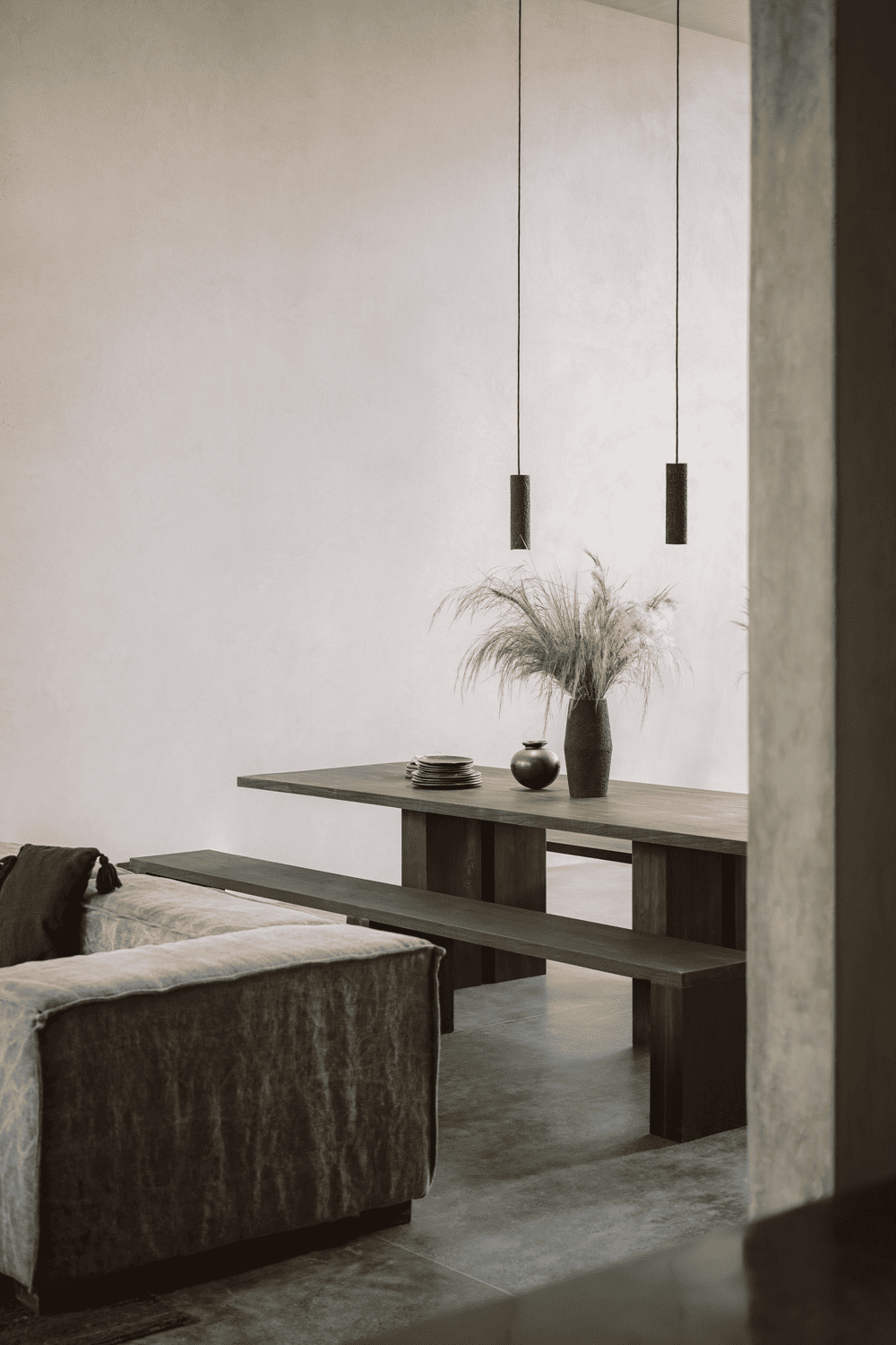 Designed and built by CO-LAB, the house is surfaced with handmade finishes. The warm grey polished cement walls contrast with black terrazzo floors. Charred cedar wood carpentry complements the neutral palette.
