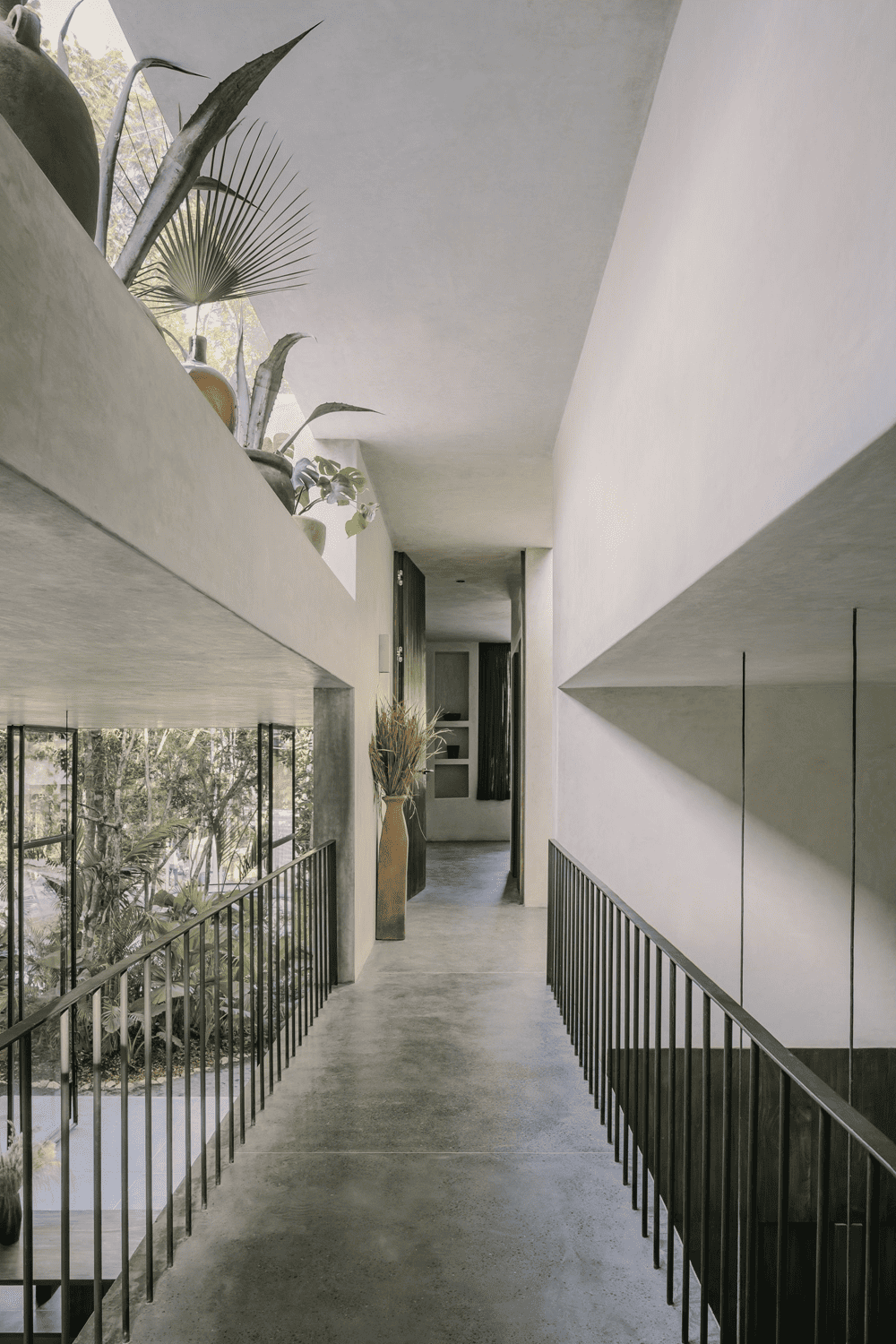 On the first floor, two bedrooms frame the lush jungle, connected by a bridge under a skylight.