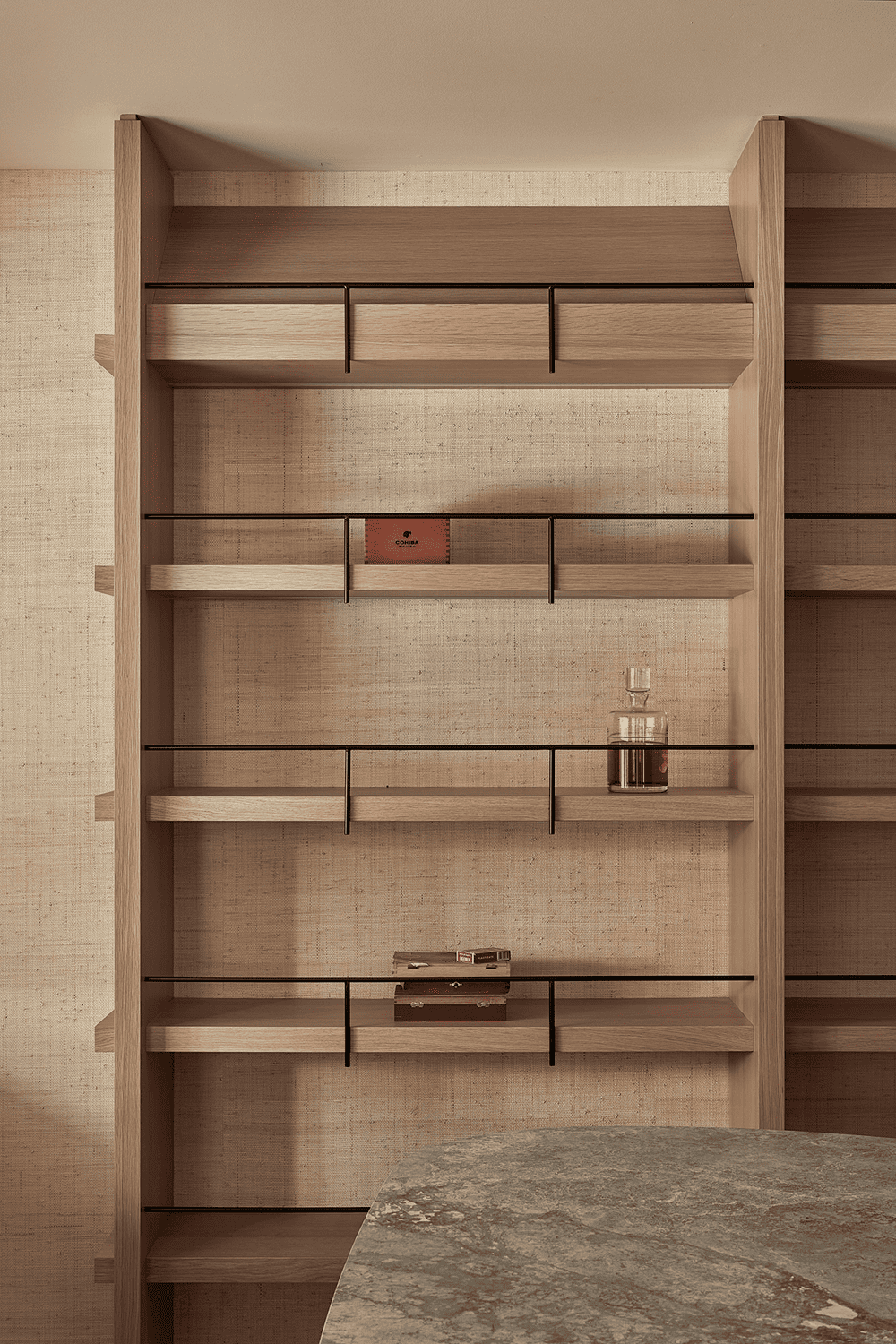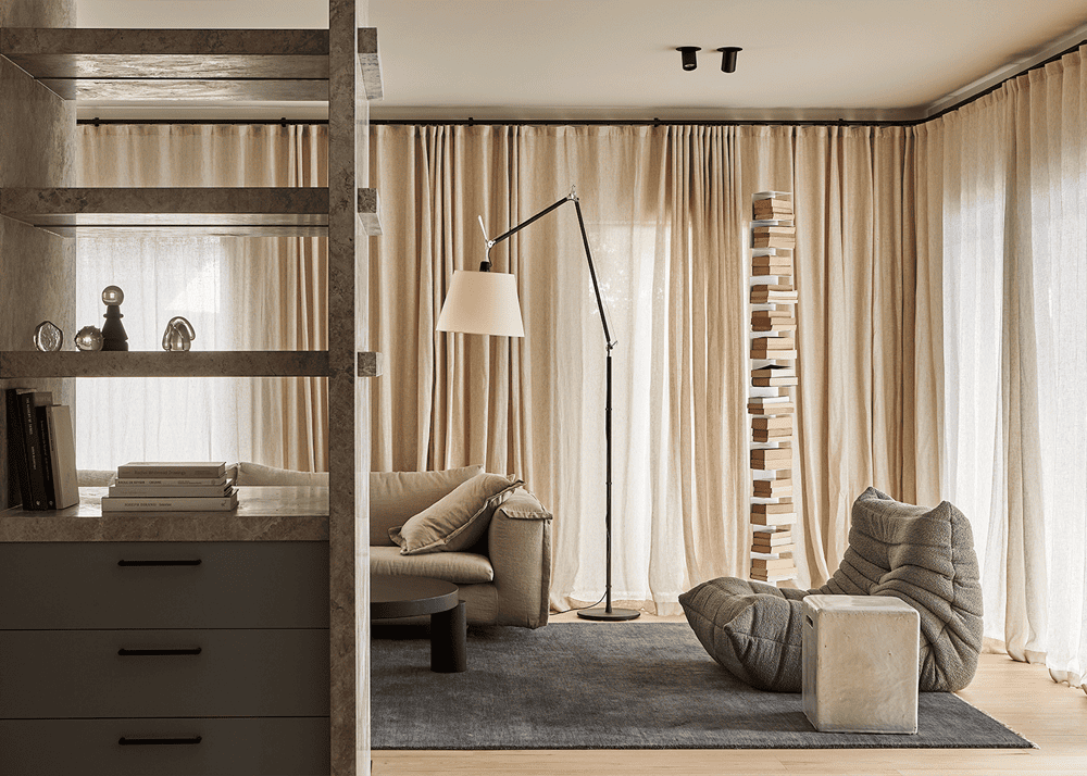 相信不久之后,人们就会意识到这个家有一种完全古老的气息。受意大利理性主义的规模和对称性的影响,20毫米厚的石灰岩框住了水平壁架,取代了传统的壁炉。电视屏幕被贴在后墙的表面,以避免数字干扰。