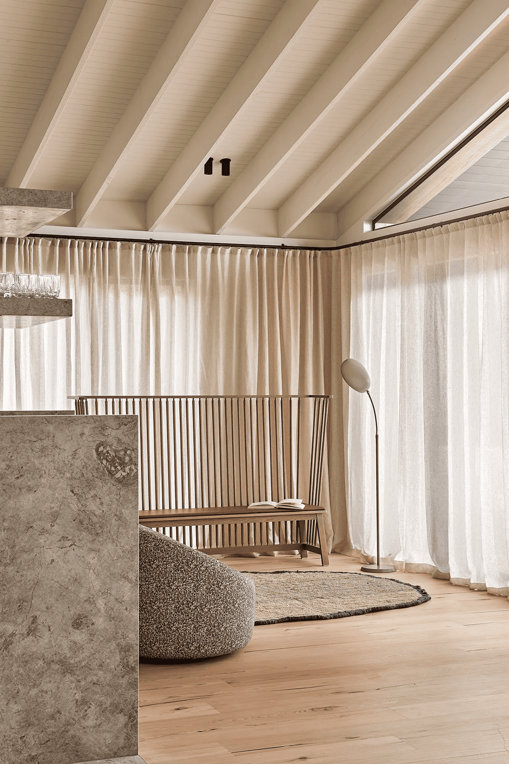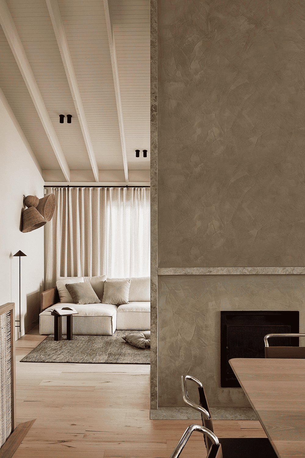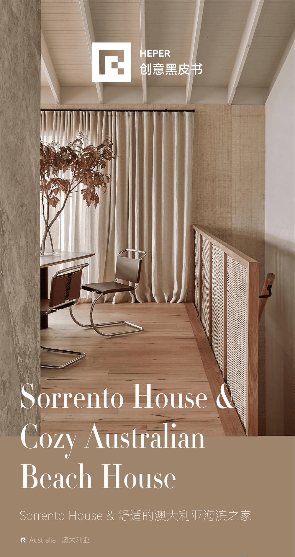 Sorrento House的风格和空间精神与其周边的环境息息相关——浅色的木材形式、敞开的编织亚麻窗帘、鹅卵石般的颜色和部分泥土质地的家具,都像是与当地的环境相得益彰。