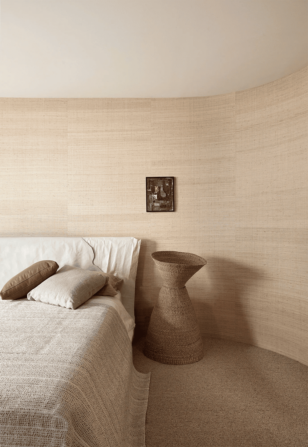 To bring the beach inside, Fiona Lynch brought together a range of design applications that mimic the surroundings. Wheat-toned raffia wallpaper (in the living spaces and sleeping areas above and the entertaining area below), sage plaster surfaces that resemble thick undergrowth and coastline, and woven wicker screens and doors that welcome the sea breeze.