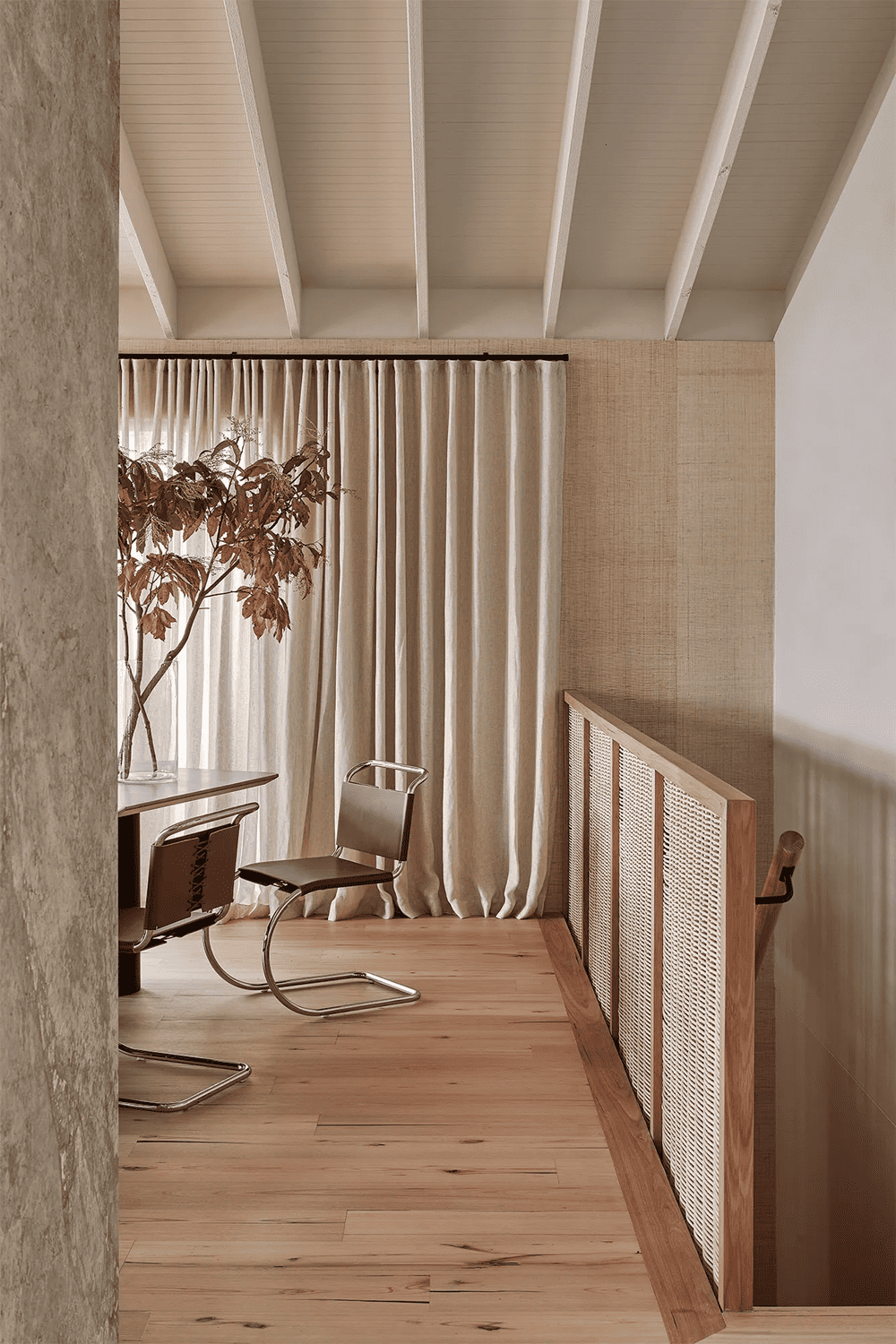 The style and spatial spirit of Sorrento House is tied to its surroundings - light timber forms, open woven linen curtains, cobbled colours and partially earthy furnishings all seem to complement the local environment.
