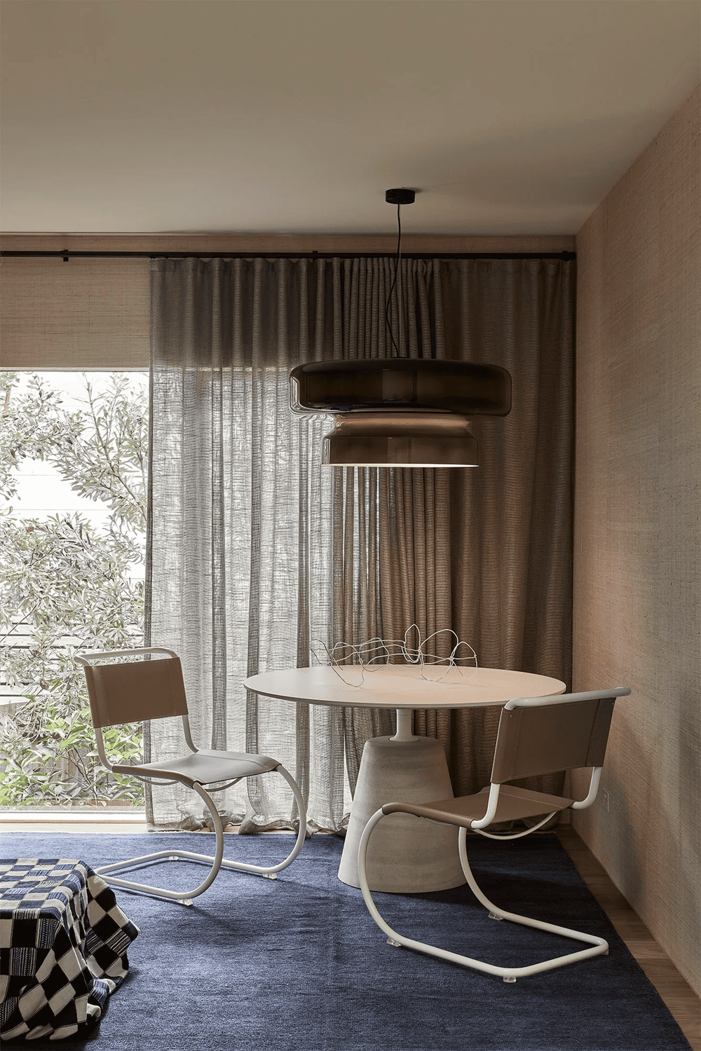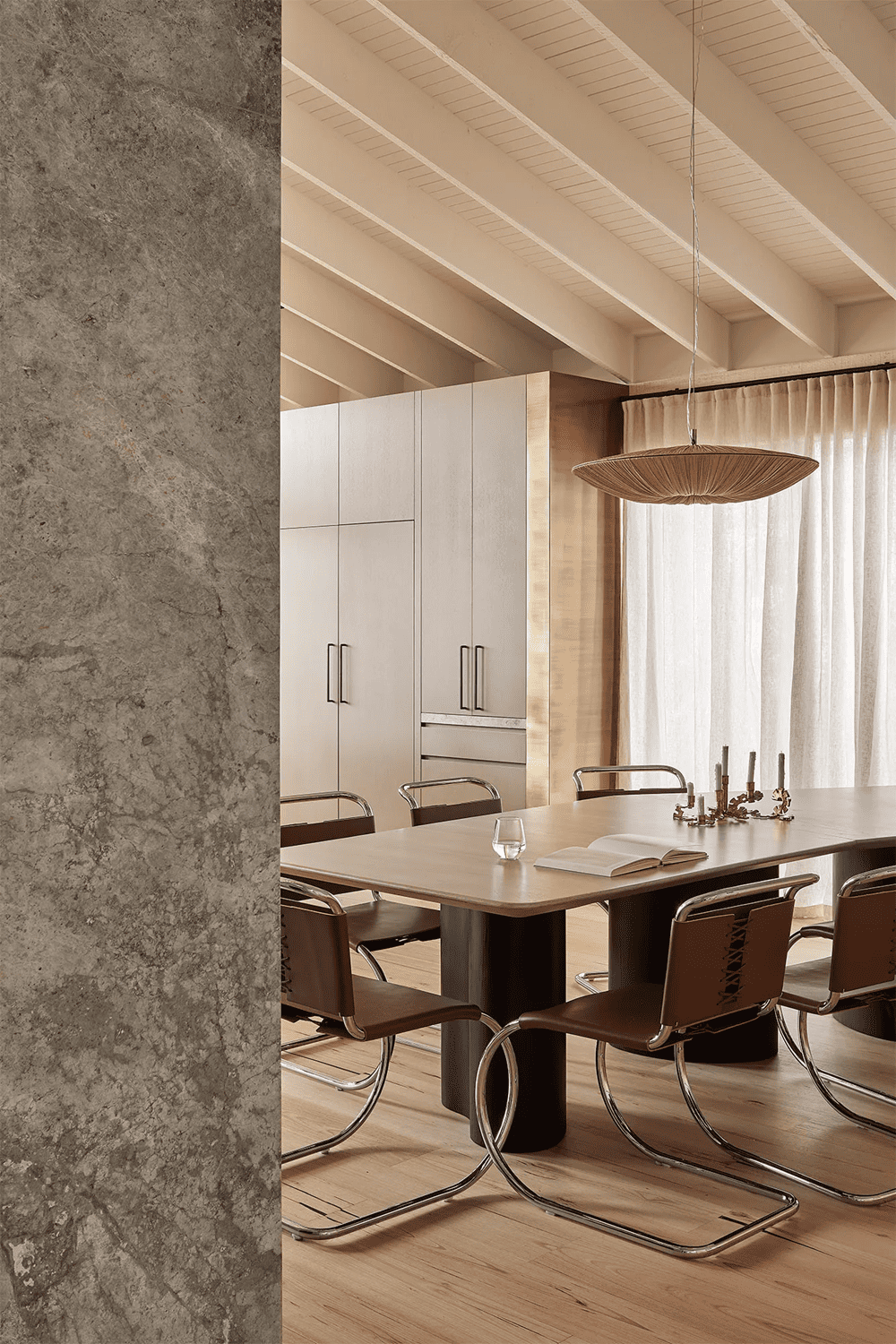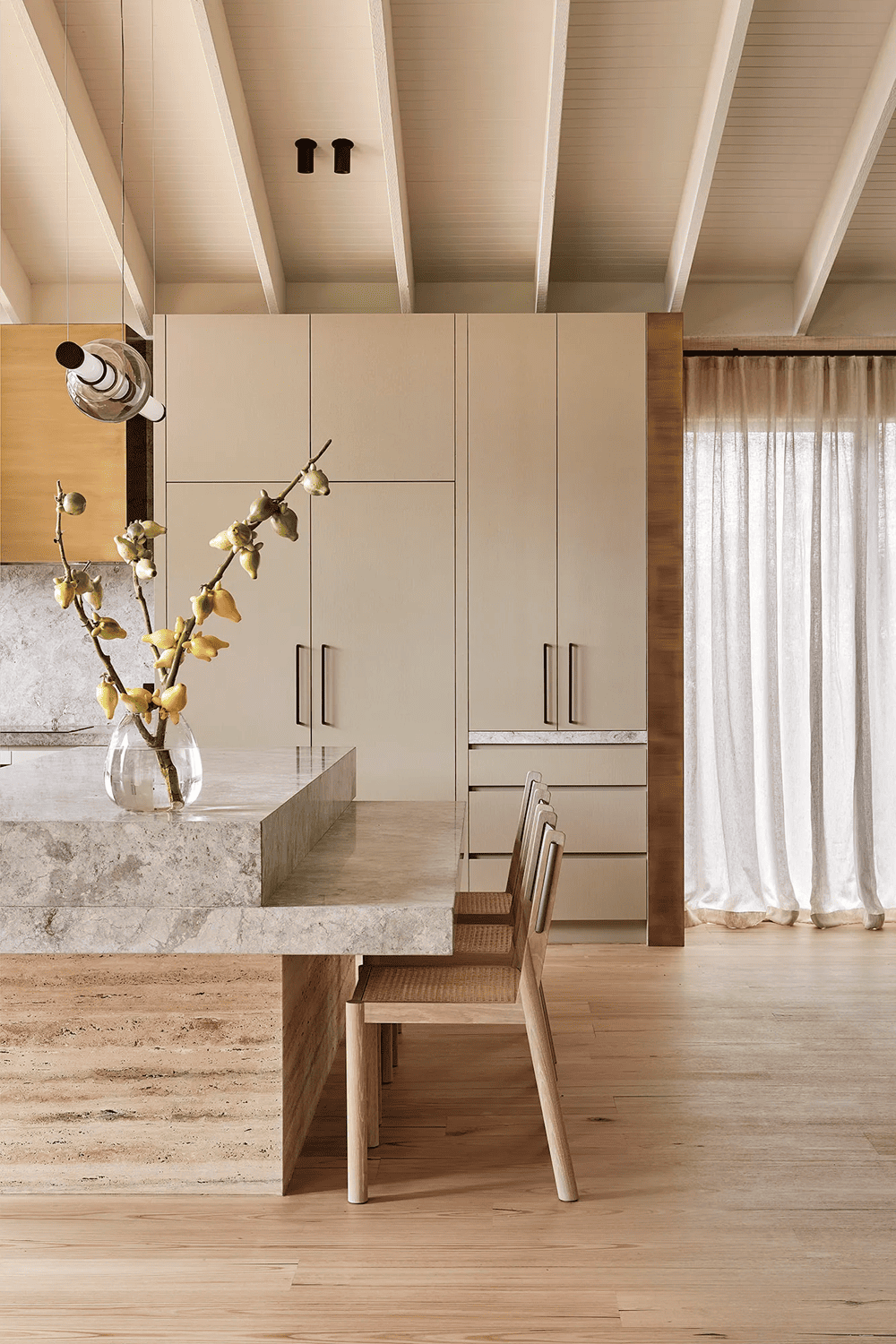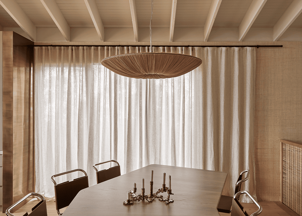 Above the dining table, a chandelier with a pleated fabric base replicates the texture under a mushroom umbrella, while the satin brass elements of the Gabriel Scott Luna chandelier above the island benches resemble threaded beads’.