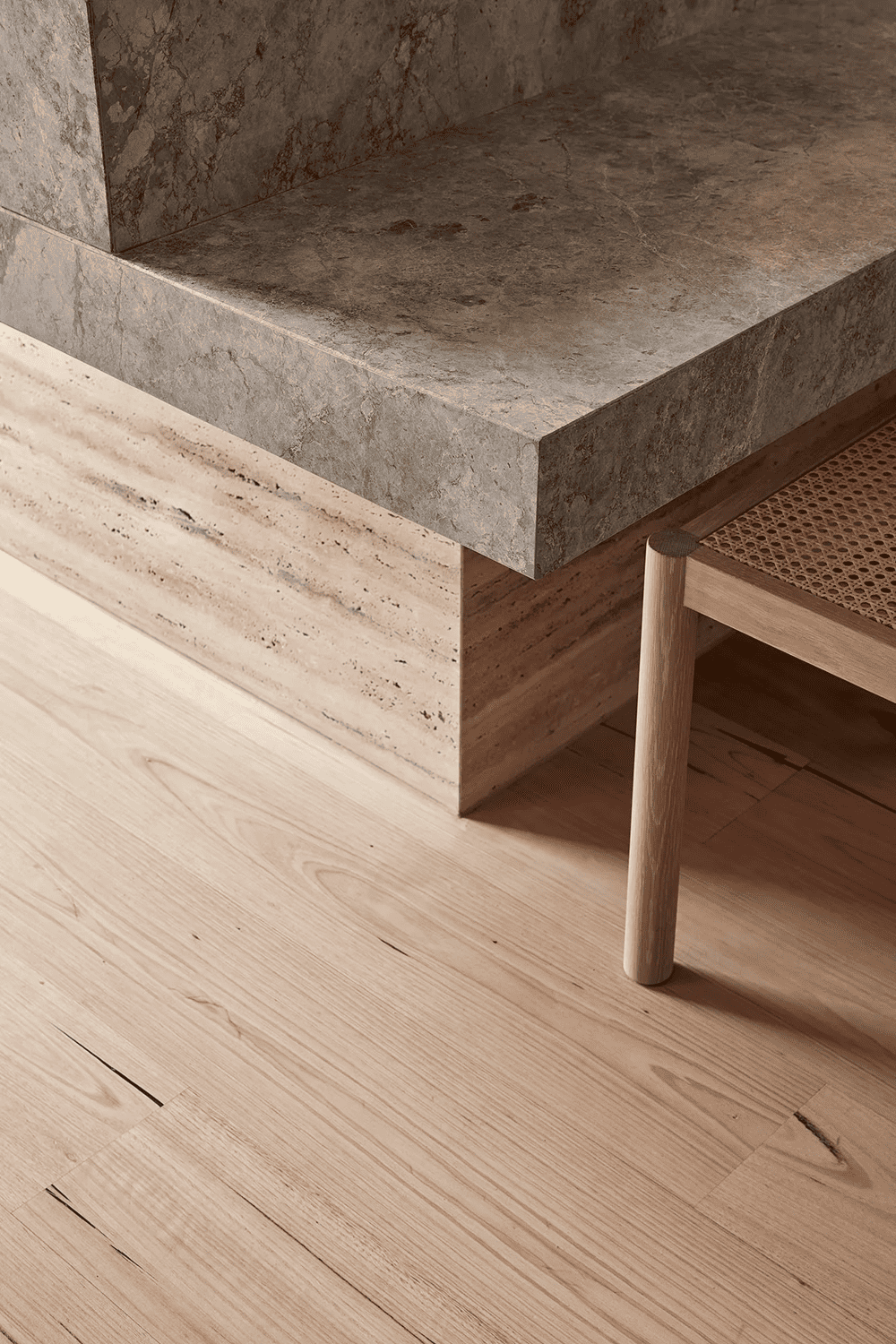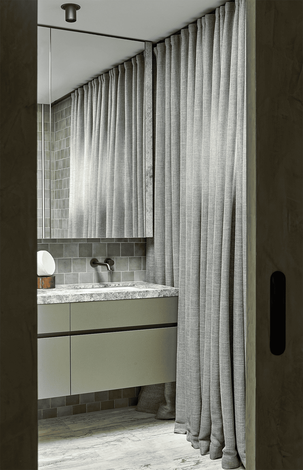 Instead, she chose a material palette of organic, porous elements. As a result, Fiona Lynch trucked in travertine to surface the space, with oyster grey limestone filling in the original joinery and effortless countertops and tables filling in the gaps. fiona Lynch recalls ‘the two original fireplaces on both floors were rendered to match the sage-green plaster on the feature walls, allowing light to pool on their crushed velvet surfaces. its crushed velvet-like surface’.