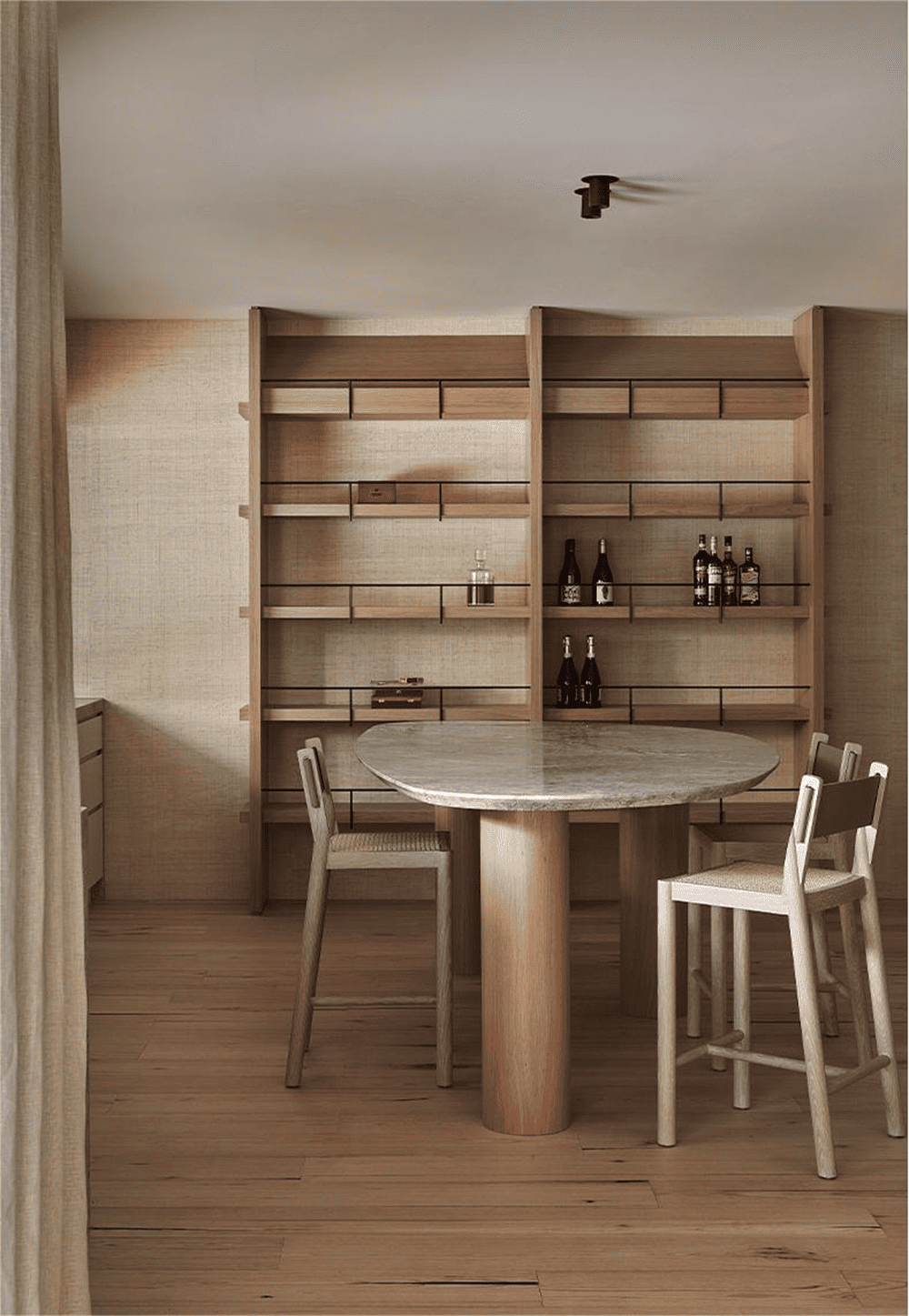 Sorrento House也许是低调的,但这个空间并不是没有一些惊喜。Fiona Lynch说“除了书房新建的木材和不锈钢橱柜外,楼下的酒吧区还设有一个定制的酒瓶展示装置,这是对本地快速轨道的精致演绎。”