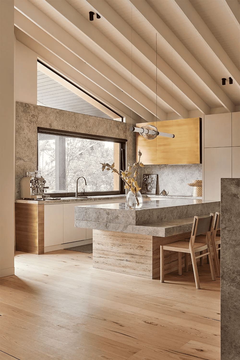 餐厅与厨房相连,就像潮水般呼啸而过——人们会想,这是一个很适合在海边的房子。但是,尽管有相似的颜色和饰面,厨房还是有自己的特点——橡木饰面的细木工板、石灰岩台面、整体式的岛形长凳,以及拥抱海岸线的面向海洋的窗户。L形细木工、抽油烟机和橱柜门都用青铜包层密封,金属饰面突出了结构元素,为哑光表面增添了微妙的光泽。