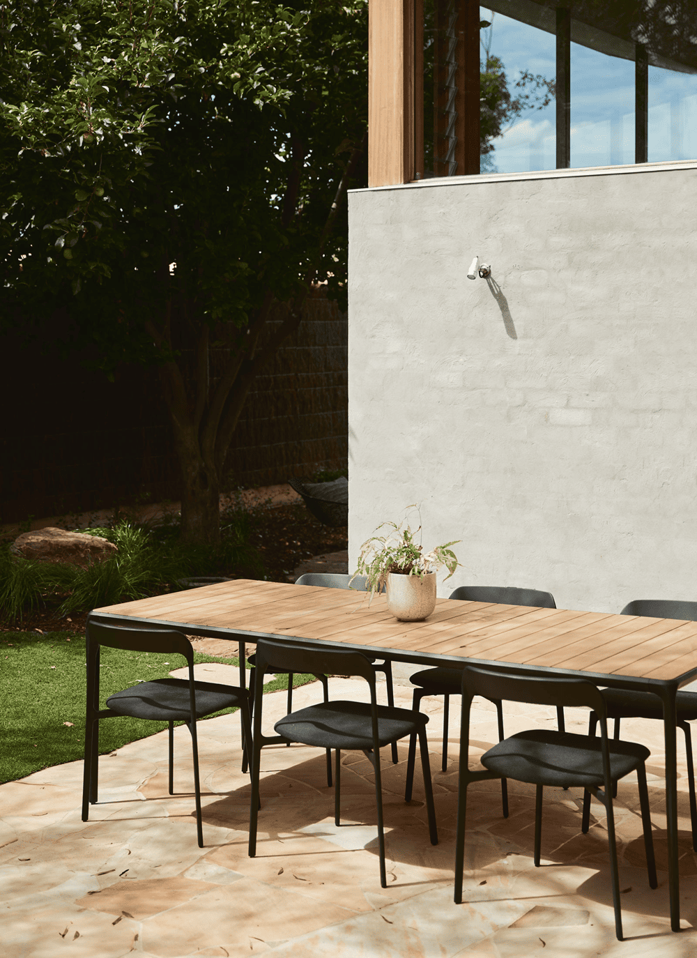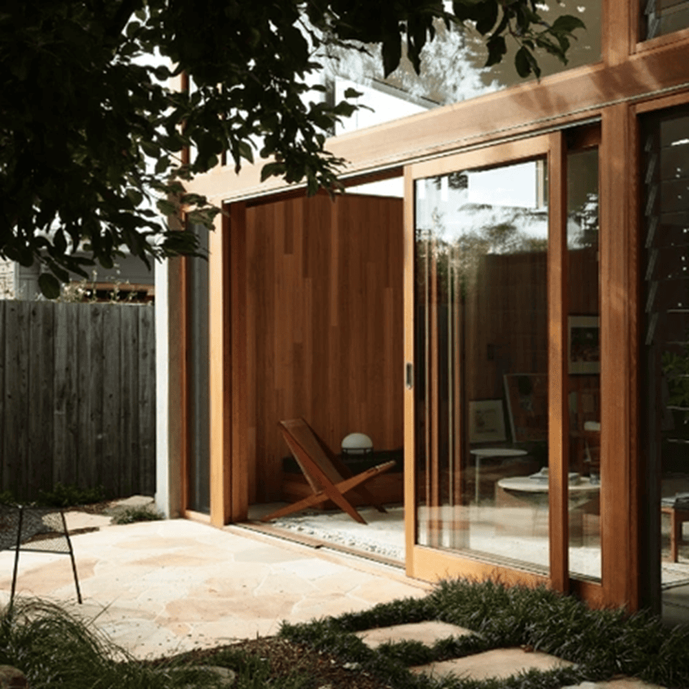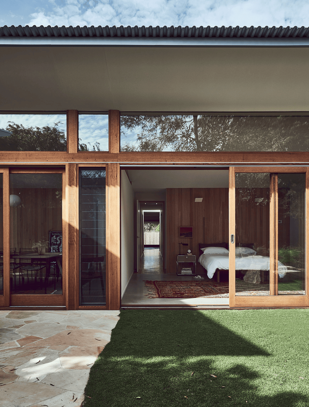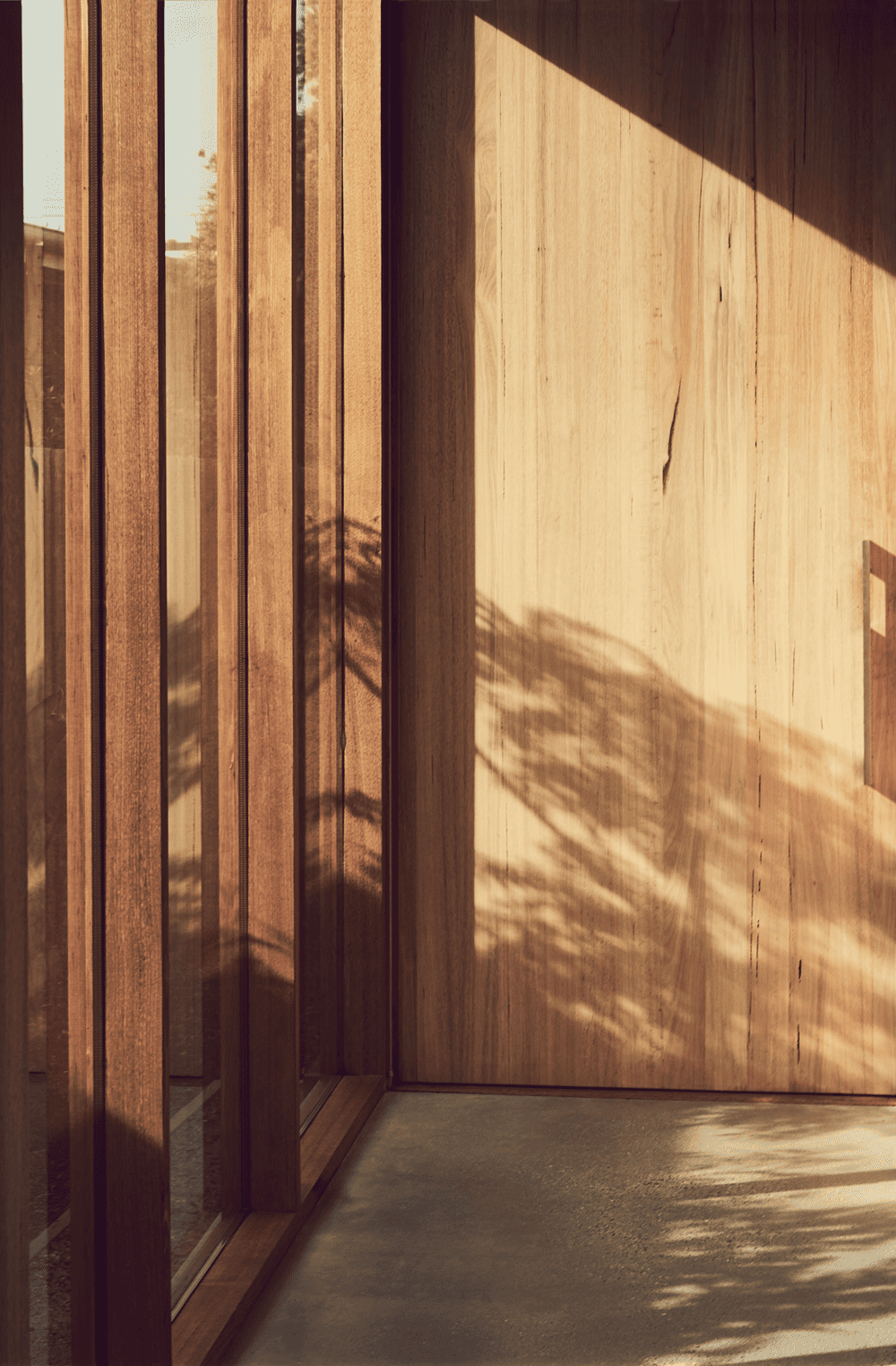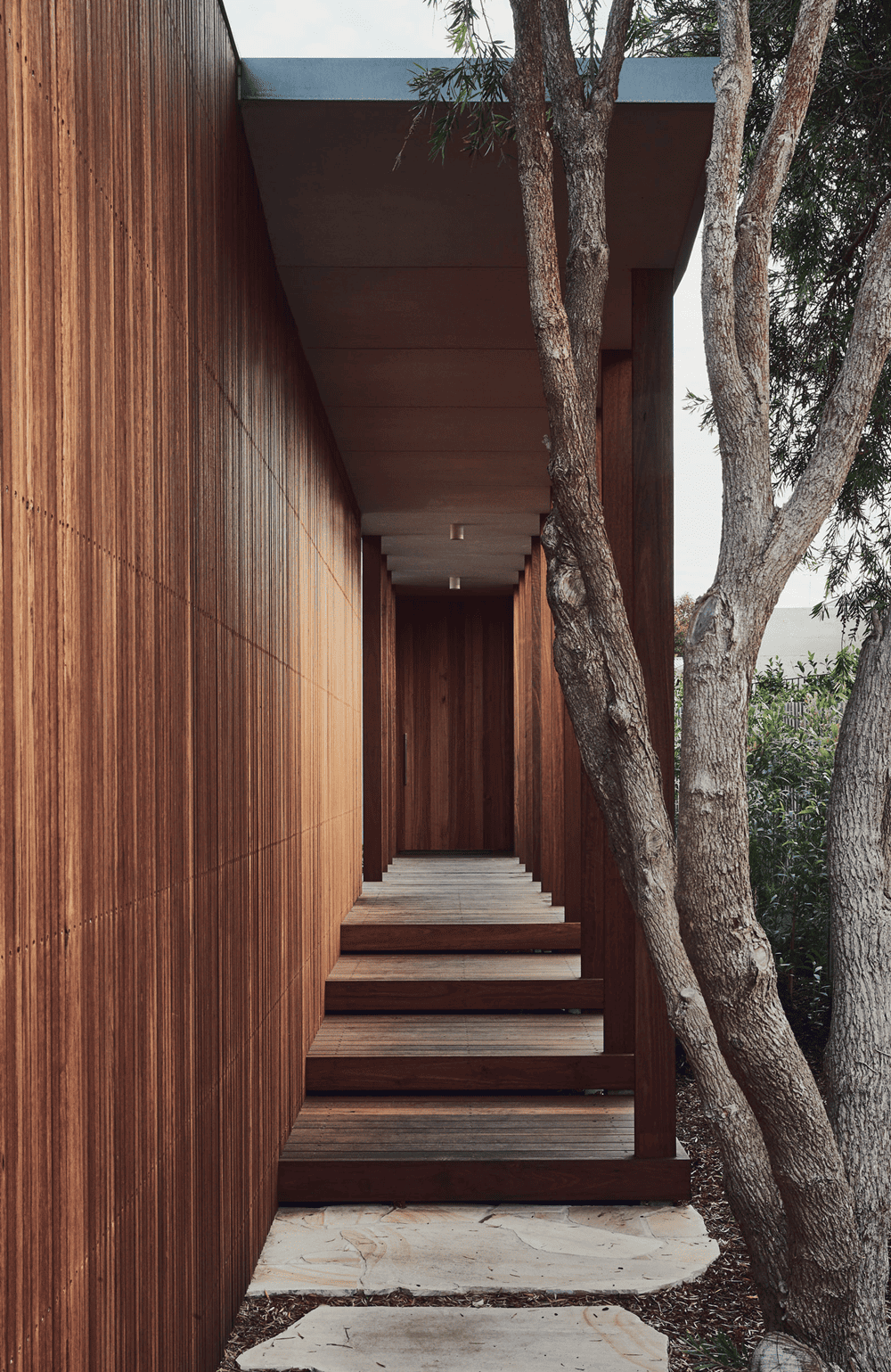 At the entrance, the existing bottlebrush tree (Melaleuca Viminalis) was retained to guide the entrance. The boardwalk entrance also creates an enclosed courtyard between the original and new built forms, protecting from cool southwesterly breezes as well as allowing summer breezes to enter the space, providing an additional outdoor retreat.