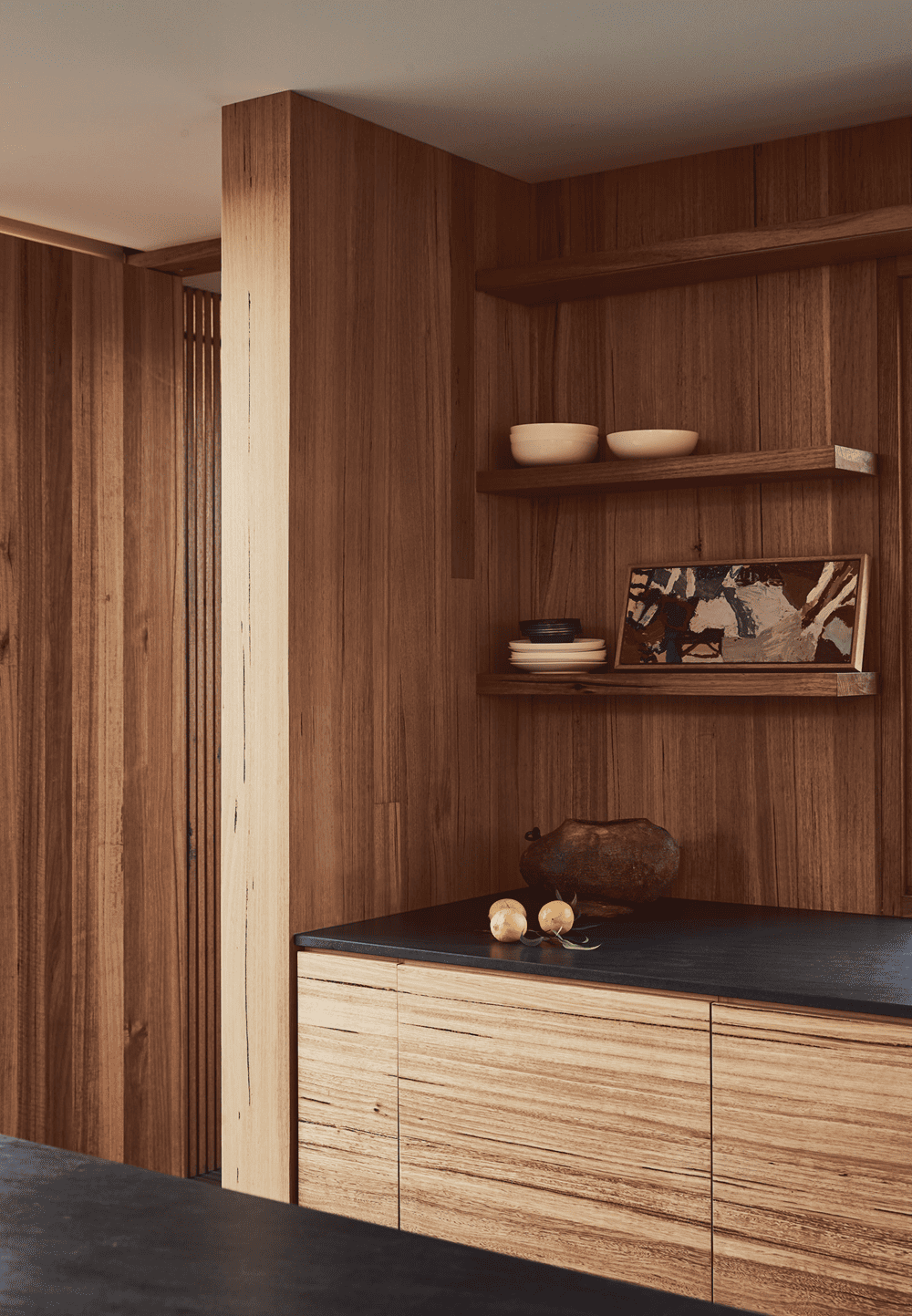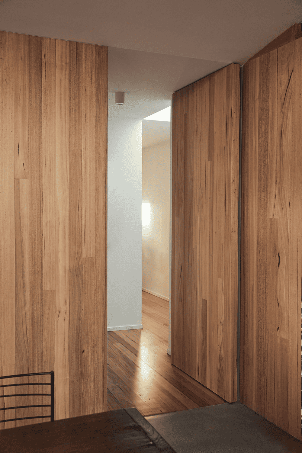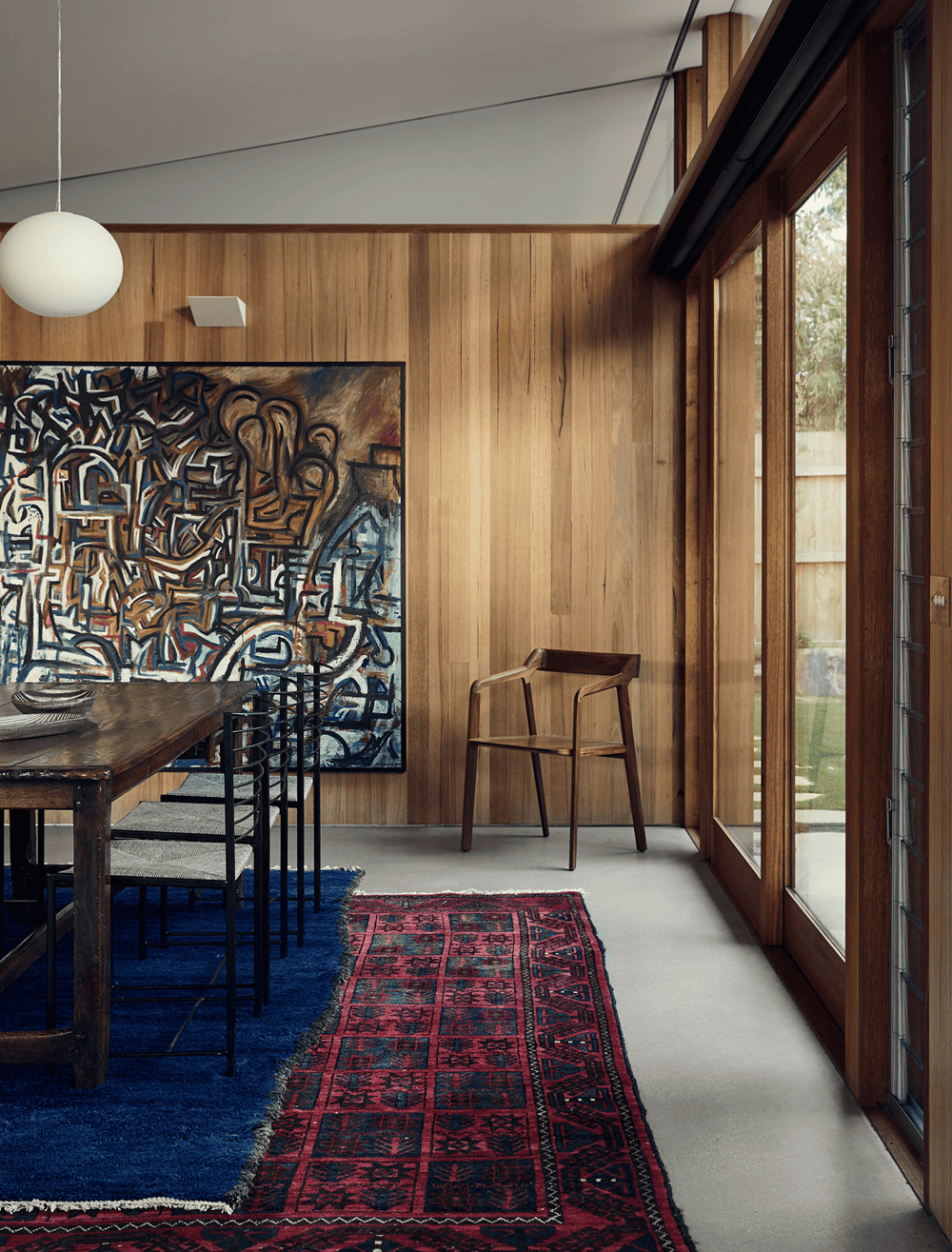 A palette of warm toned materials connects to the original brickwork of the home and wraps around the interior, with the timber mixing with polished concrete floors and painted plaster elements to create a clear balance in the visual aspect of the space.