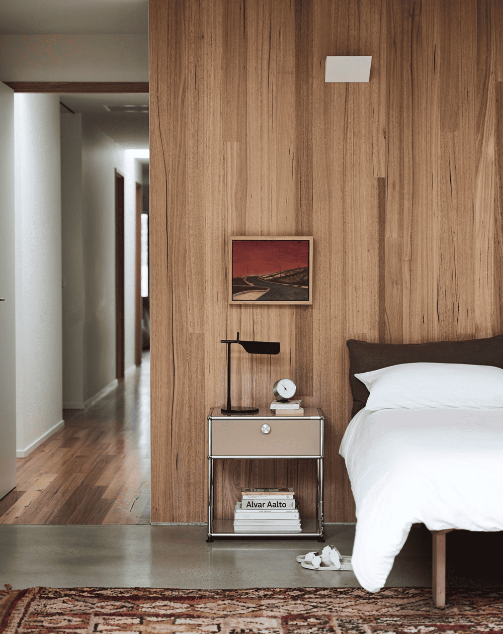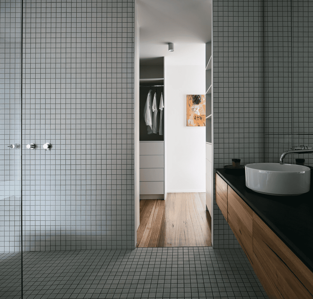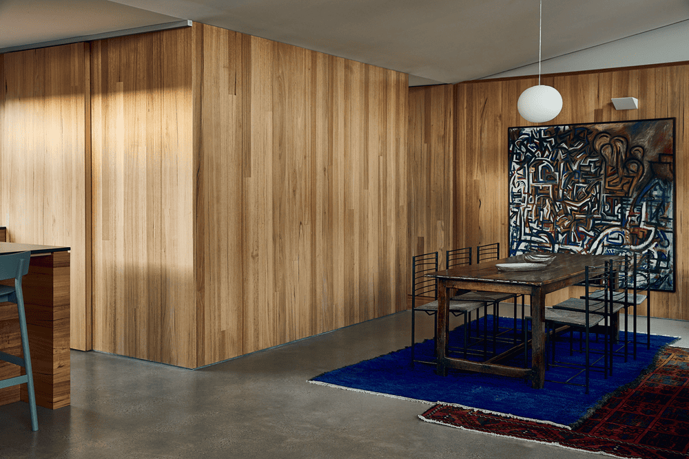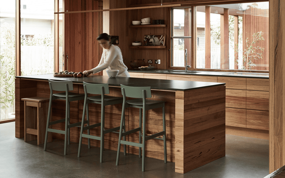 A palette of warm toned materials connects to the original brickwork of the home and wraps around the interior, with the timber mixing with polished concrete floors and painted plaster elements to create a clear balance in the visual aspect of the space.