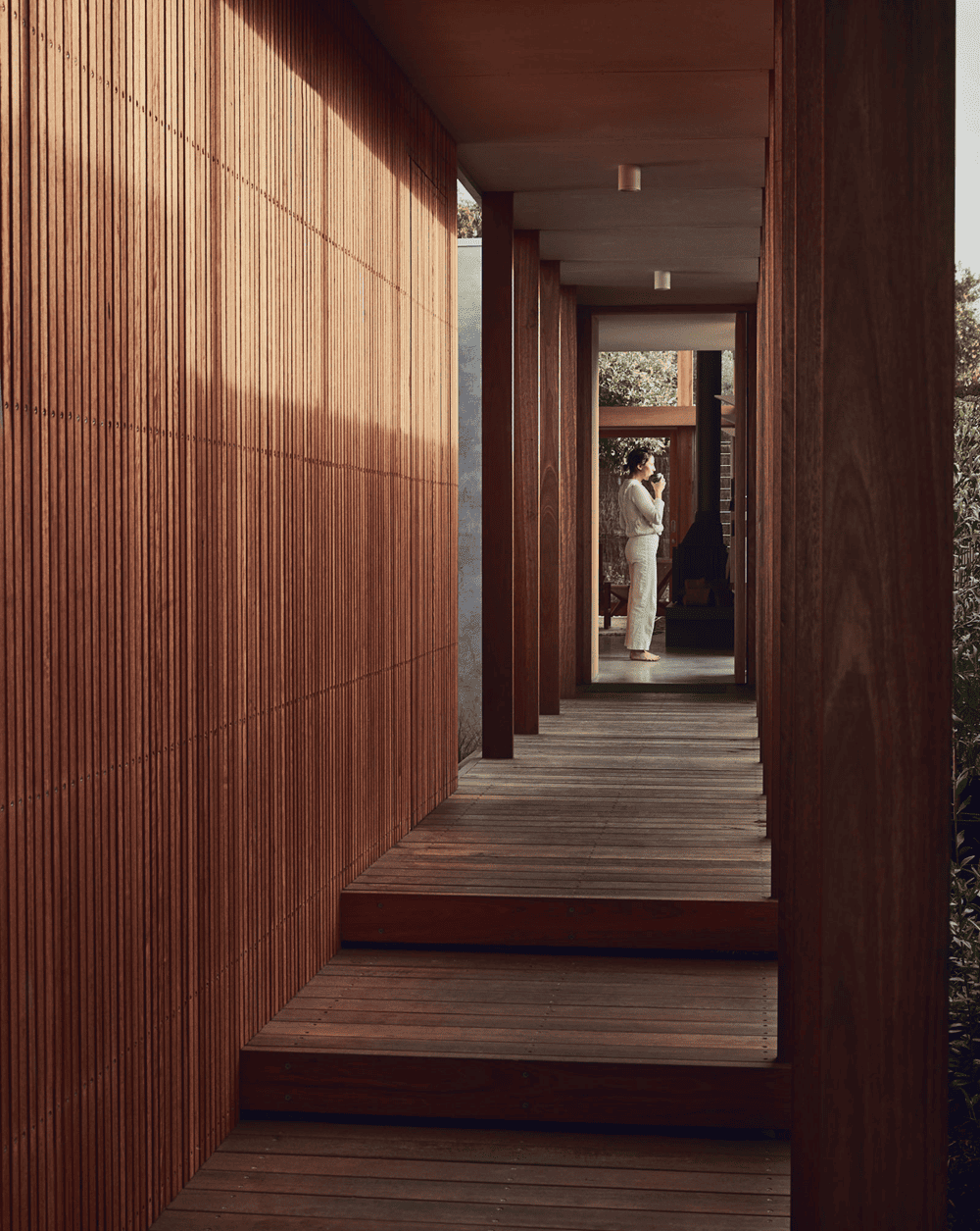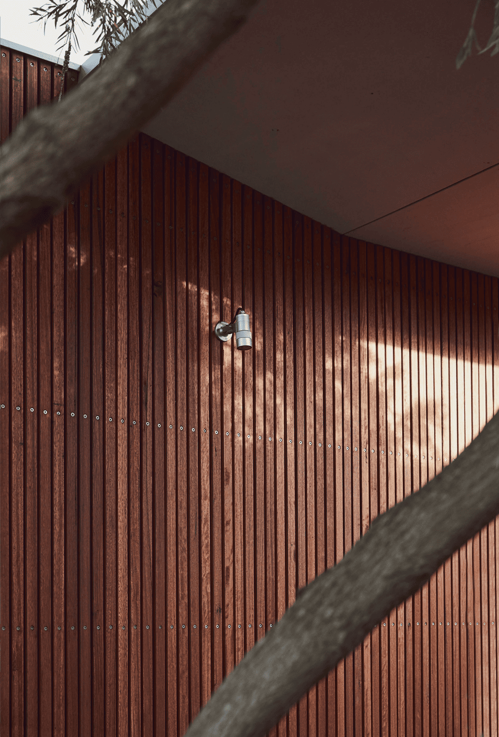 在入口处,现有的瓶刷树(Melaleuca Viminalis)被保留下来,作为入口的指引。木板路入口也在原有的和新的建筑形式之间创造了一个封闭的院子,既保护了凉爽的西南风,也能让夏日的微风进入空间,提供了一个额外的户外休闲场所。