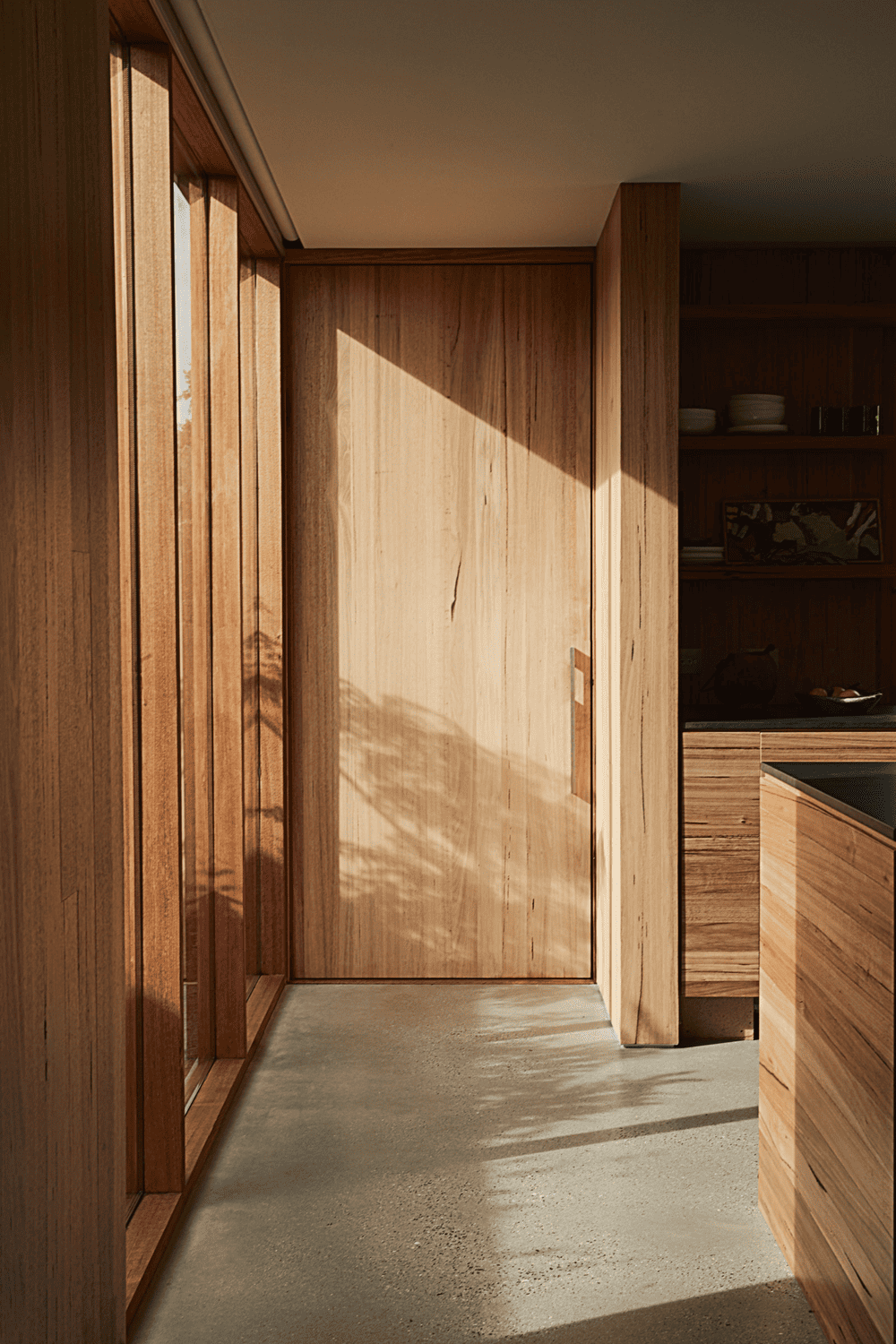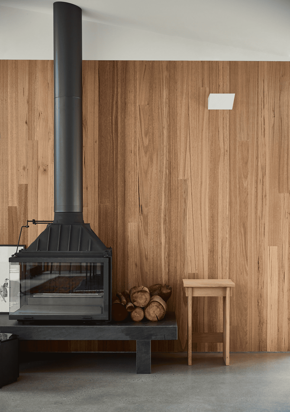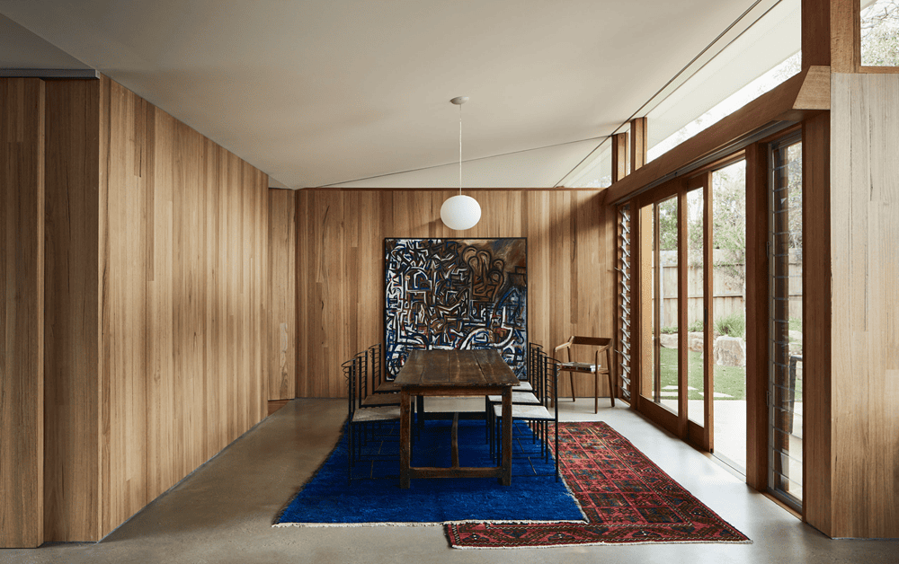 A baseline extends from the ceiling of the existing home to the new addition, Tasmanian oak hardwoods surround all new interior spaces, and the new roof slopes to the north.