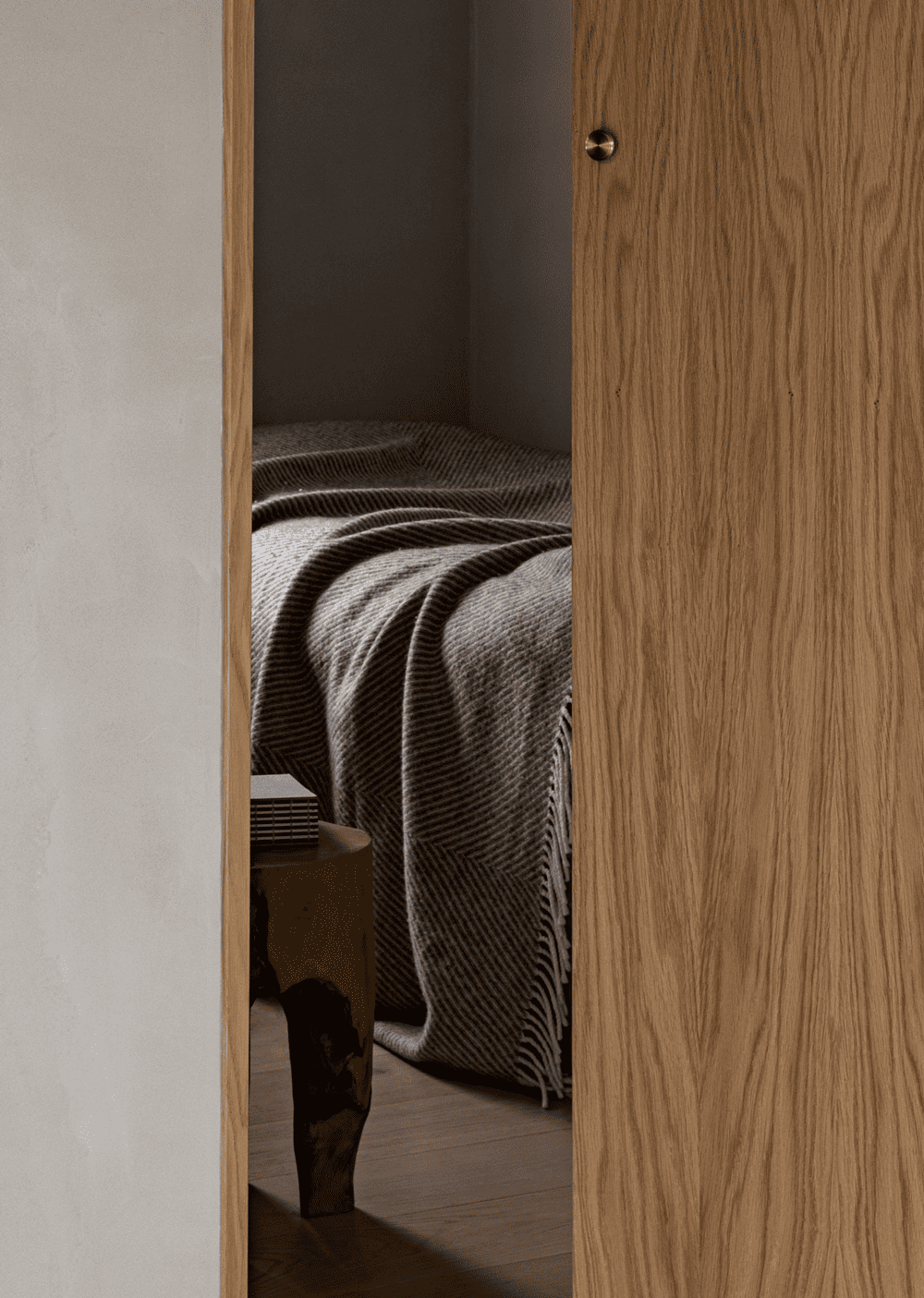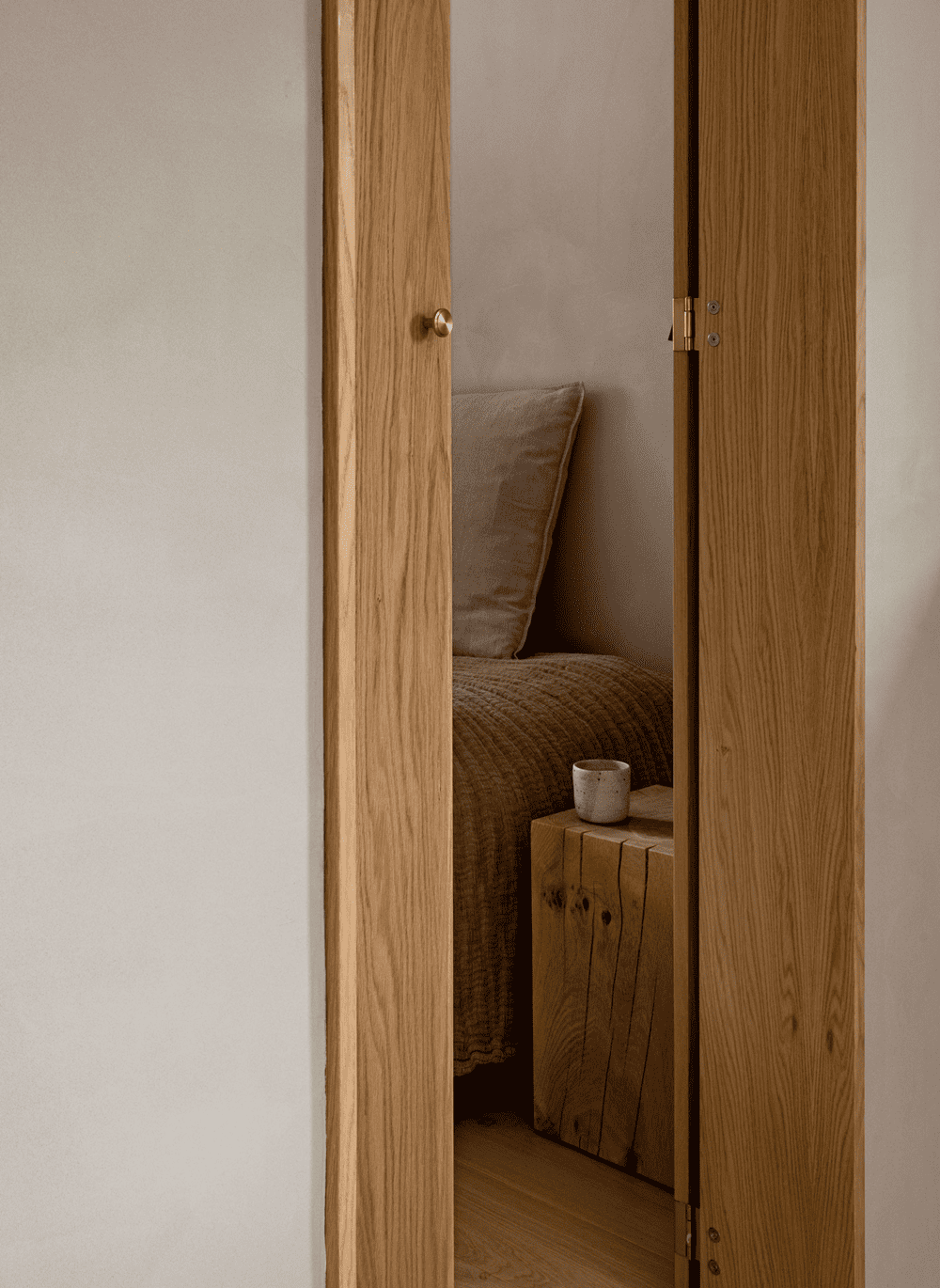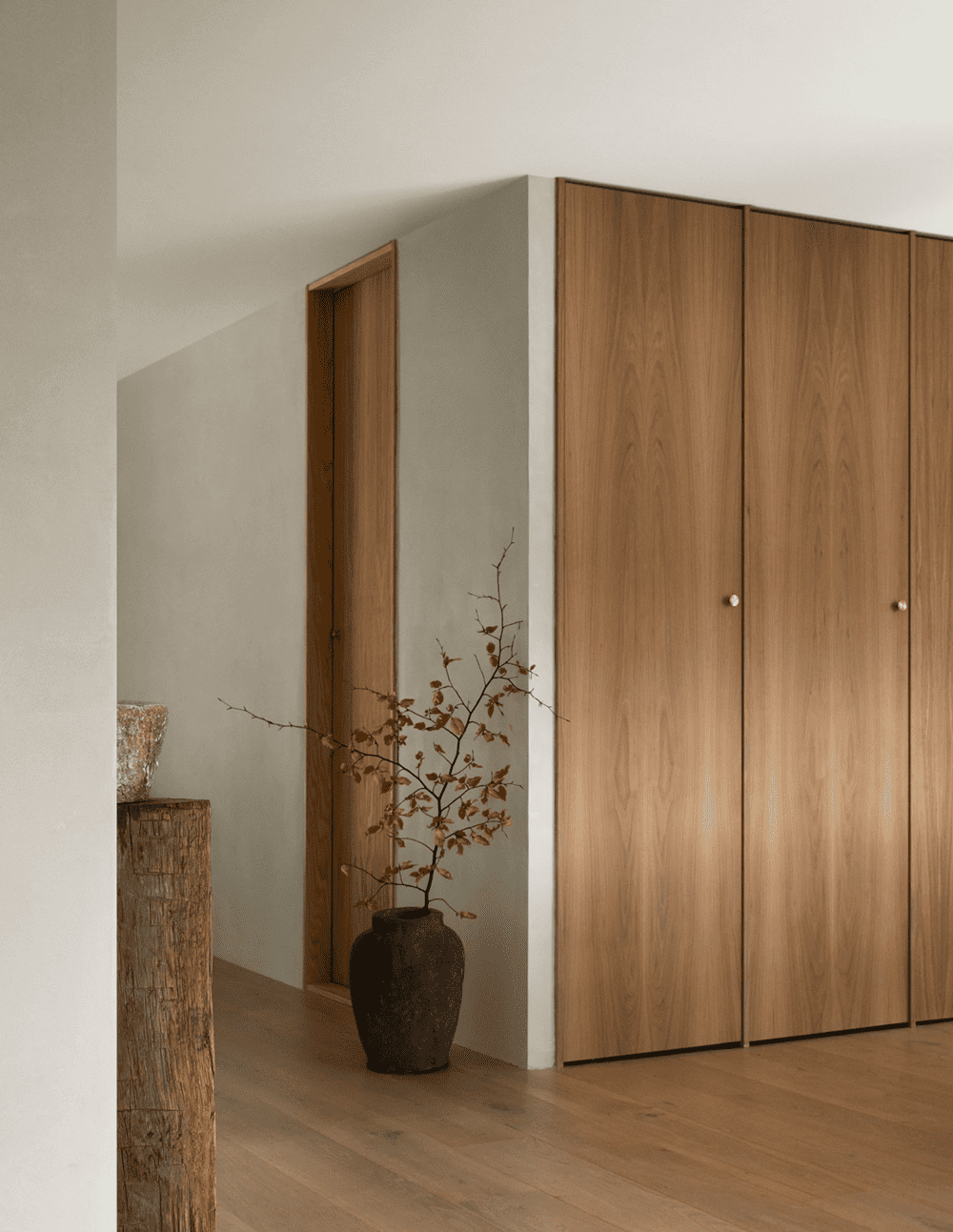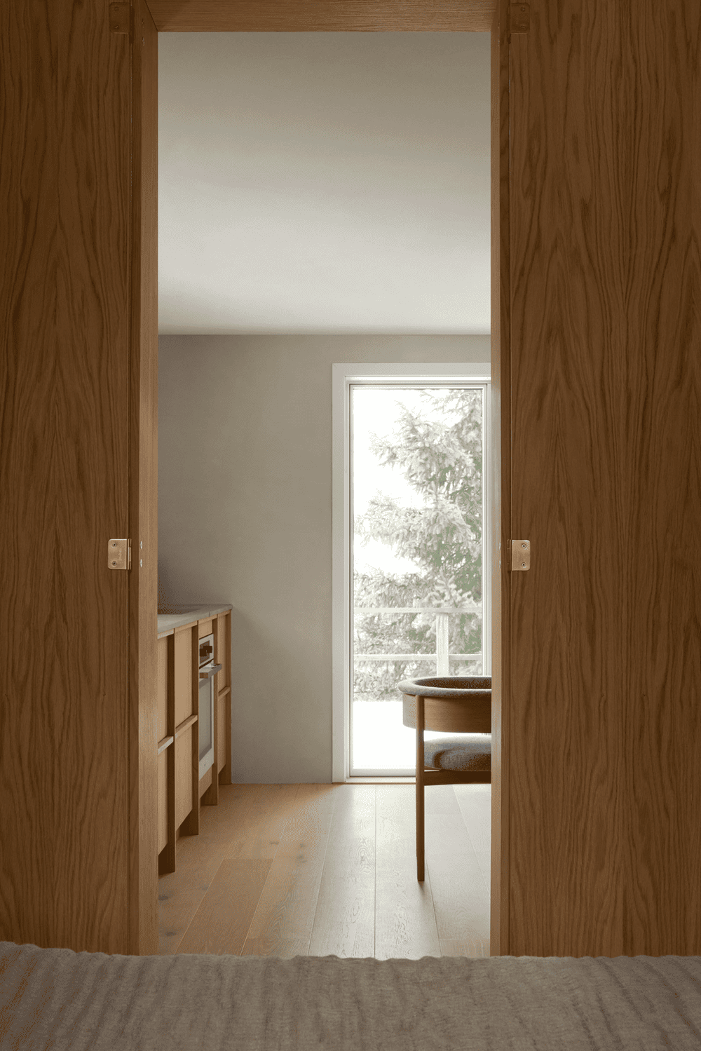 从主起居室通往卧室和浴室的内门被设计成高高的细长木柜门,以尽可能不占用较小卧室的空间。它们的高度在视觉上拉伸了空间感,使天花板的高度显得更加宽敞。