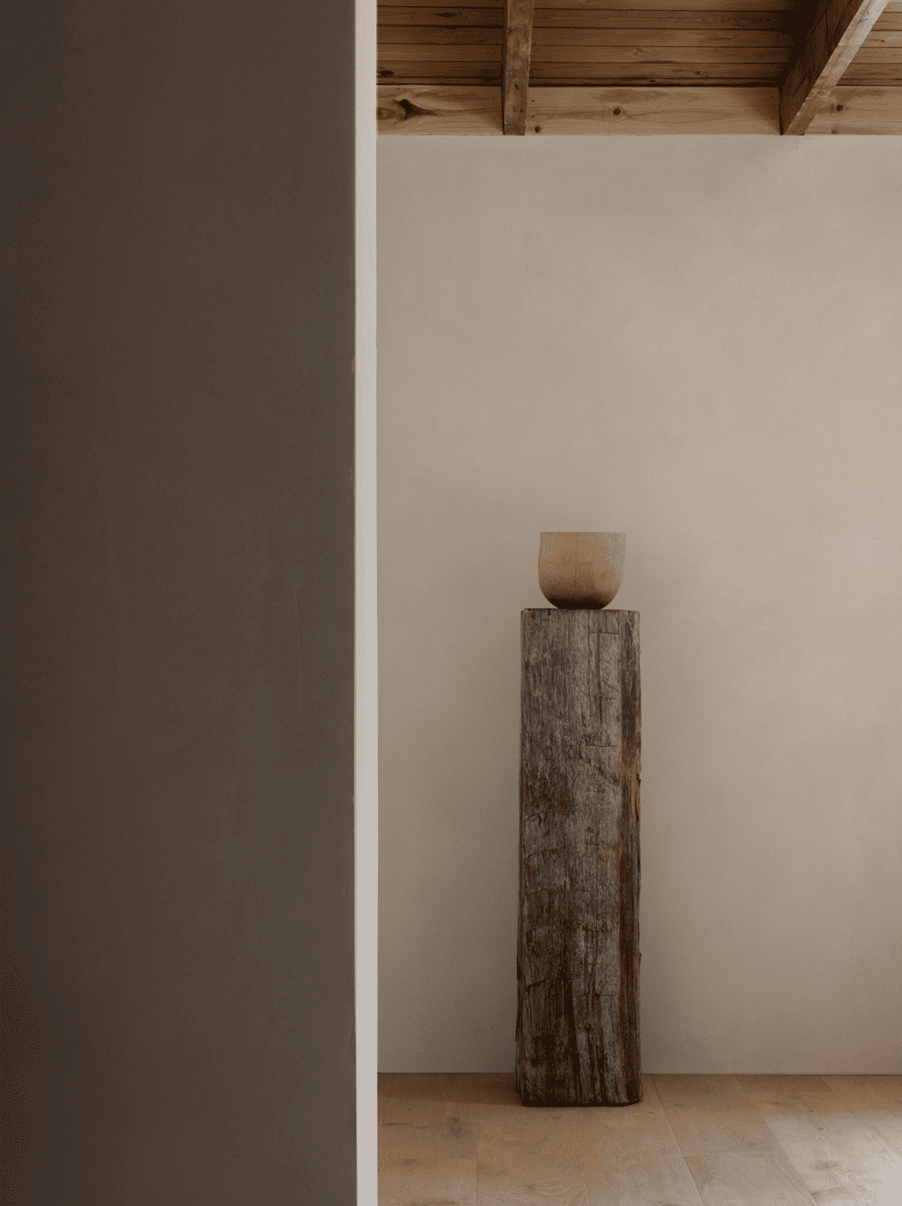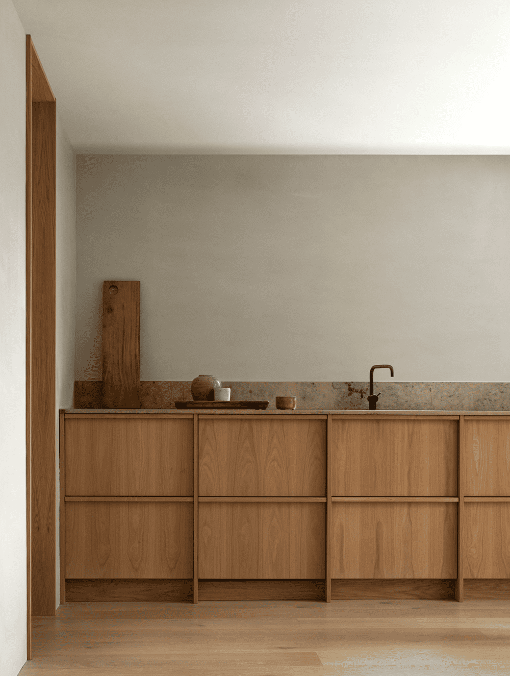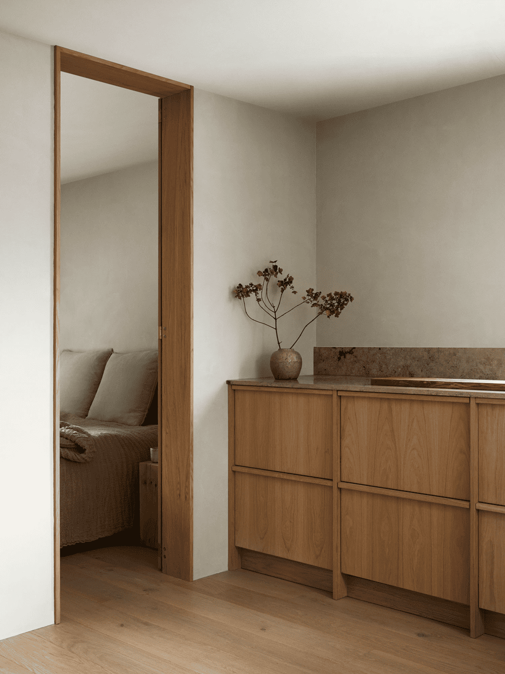 The interior material palette is kept as simple, natural, and rustic as possible dominated by oak flooring and fittings juxtaposed with dolomite plaster walls from St. Leo and a few stone elements here and there. The inherent warmth and textural qualities in the chosen materials magnify the expression of light and space, making sure that the sparse interior won’t ever feel empty.