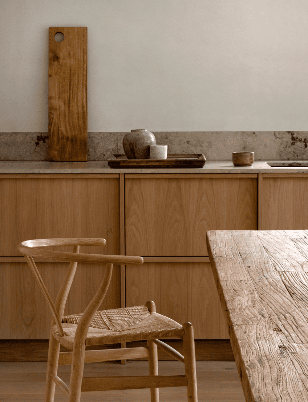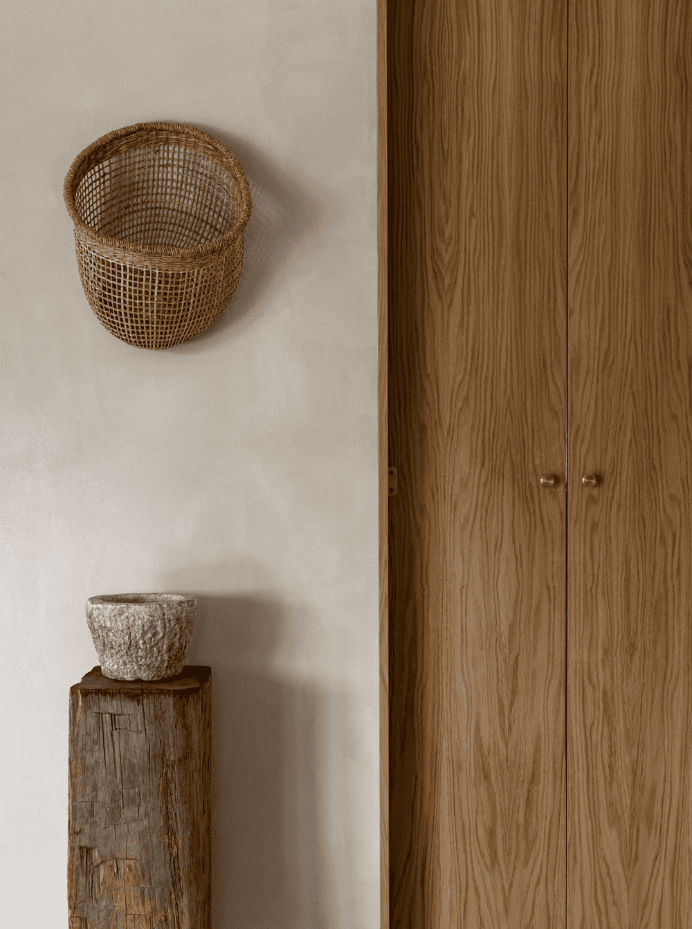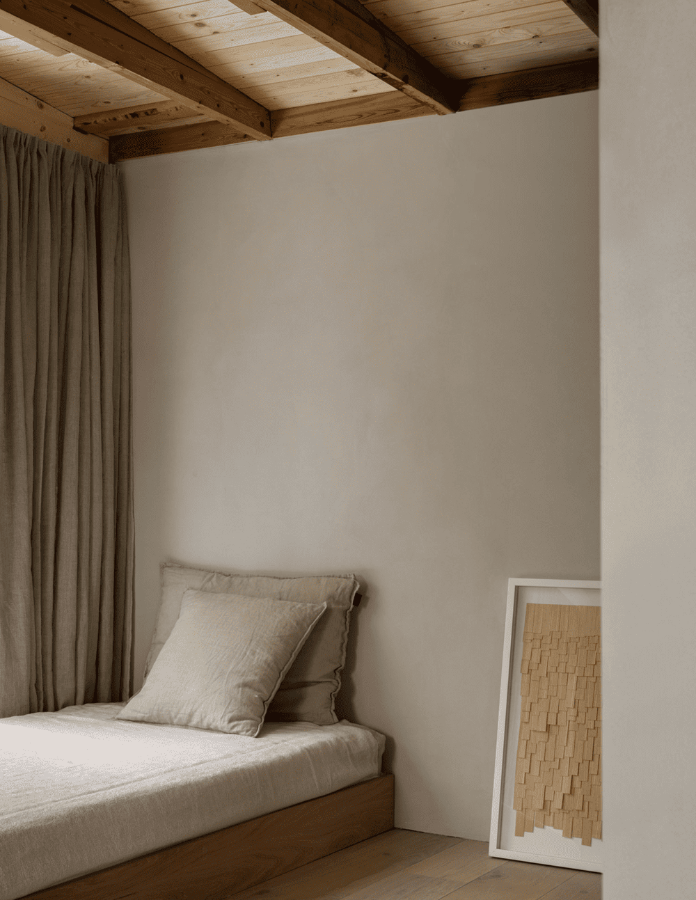 The interior material palette is kept as simple, natural, and rustic as possible dominated by oak flooring and fittings juxtaposed with dolomite plaster walls from St. Leo and a few stone elements here and there. The inherent warmth and textural qualities in the chosen materials magnify the expression of light and space, making sure that the sparse interior won’t ever feel empty.