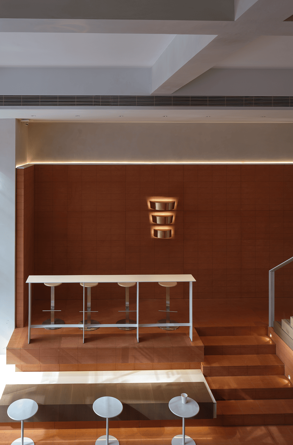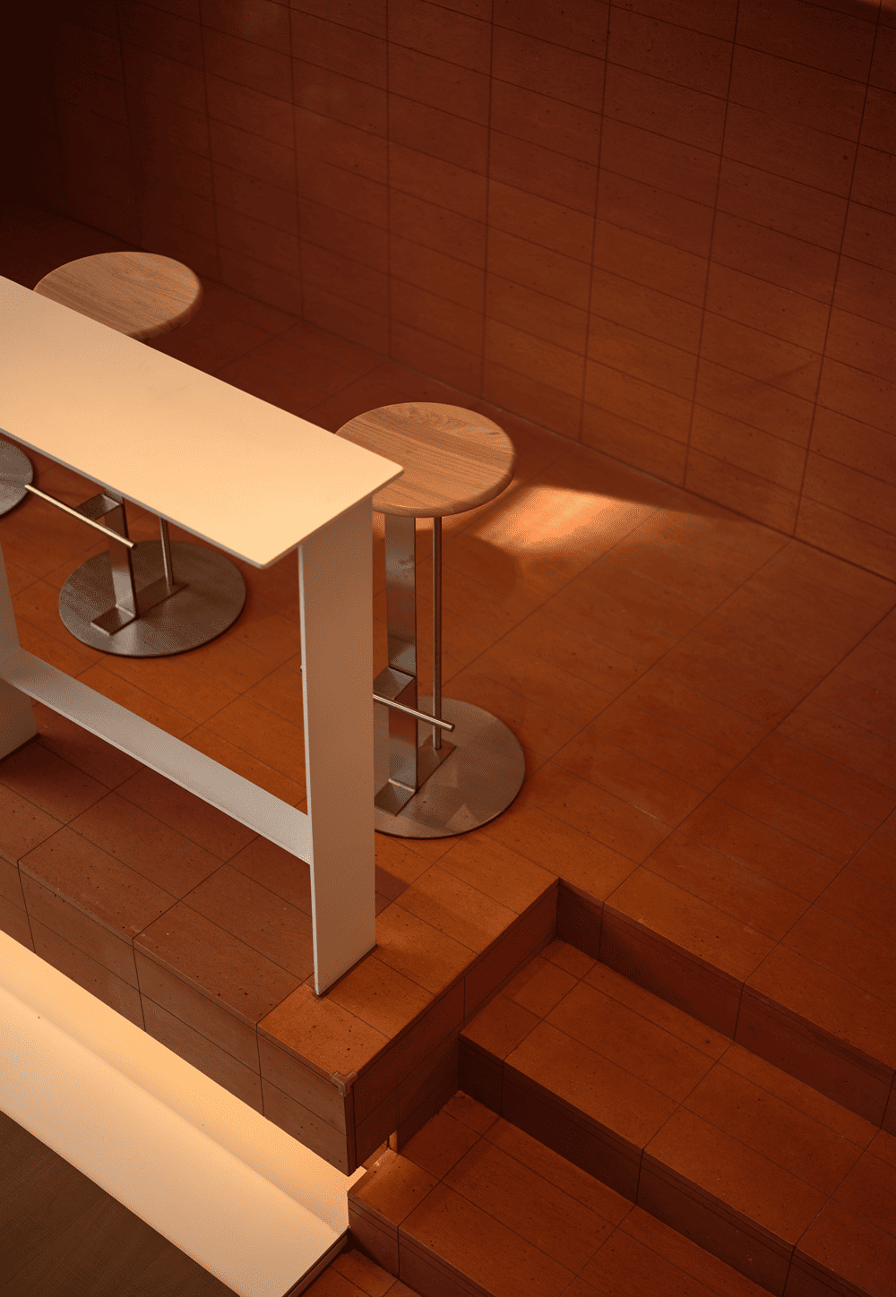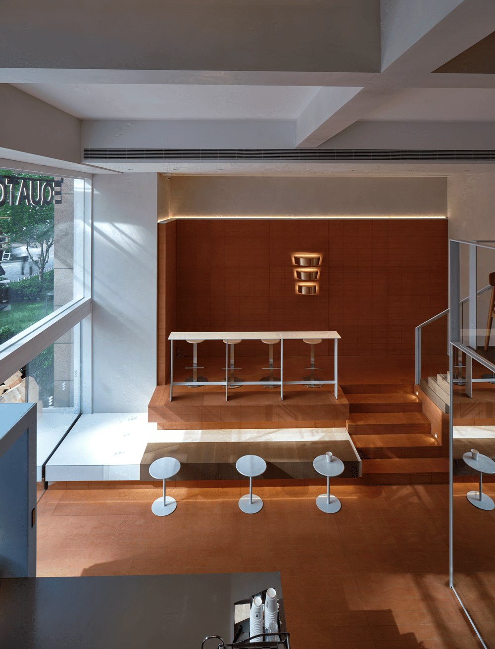 The overall design is dominated by red and white. The flooring and most interior walls are made of red brick, wood and stone, allowing the space to form a material sensory unity that extends from the inside to the outside.