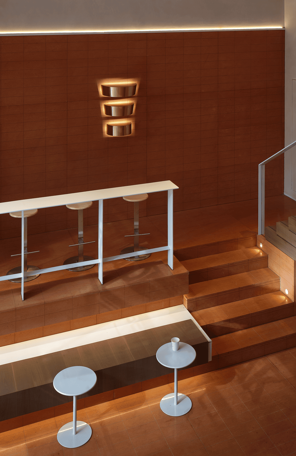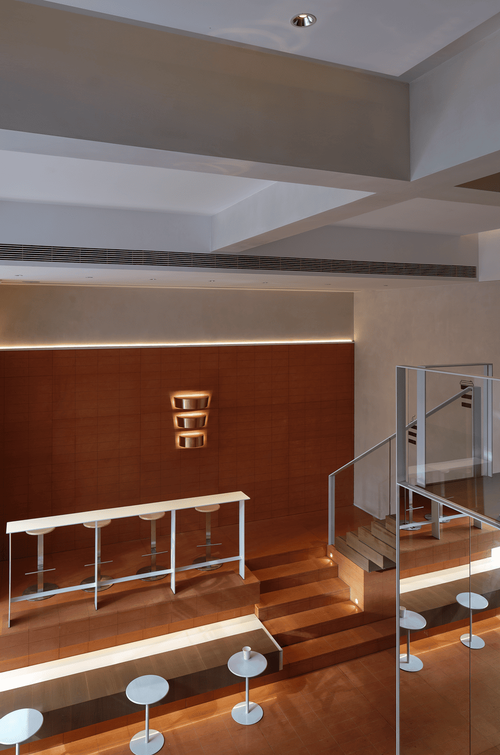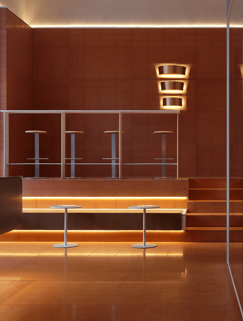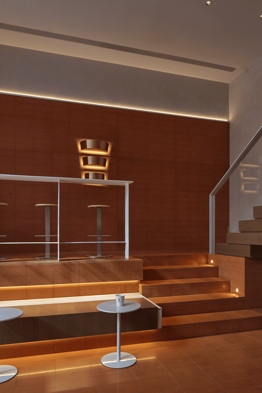 为了使咖啡厅的内外沟通与延伸成为可能,并最大程度地实现由室内向室外拓展的视觉效果,该设计在材料的选择和运用上费了一番功夫。