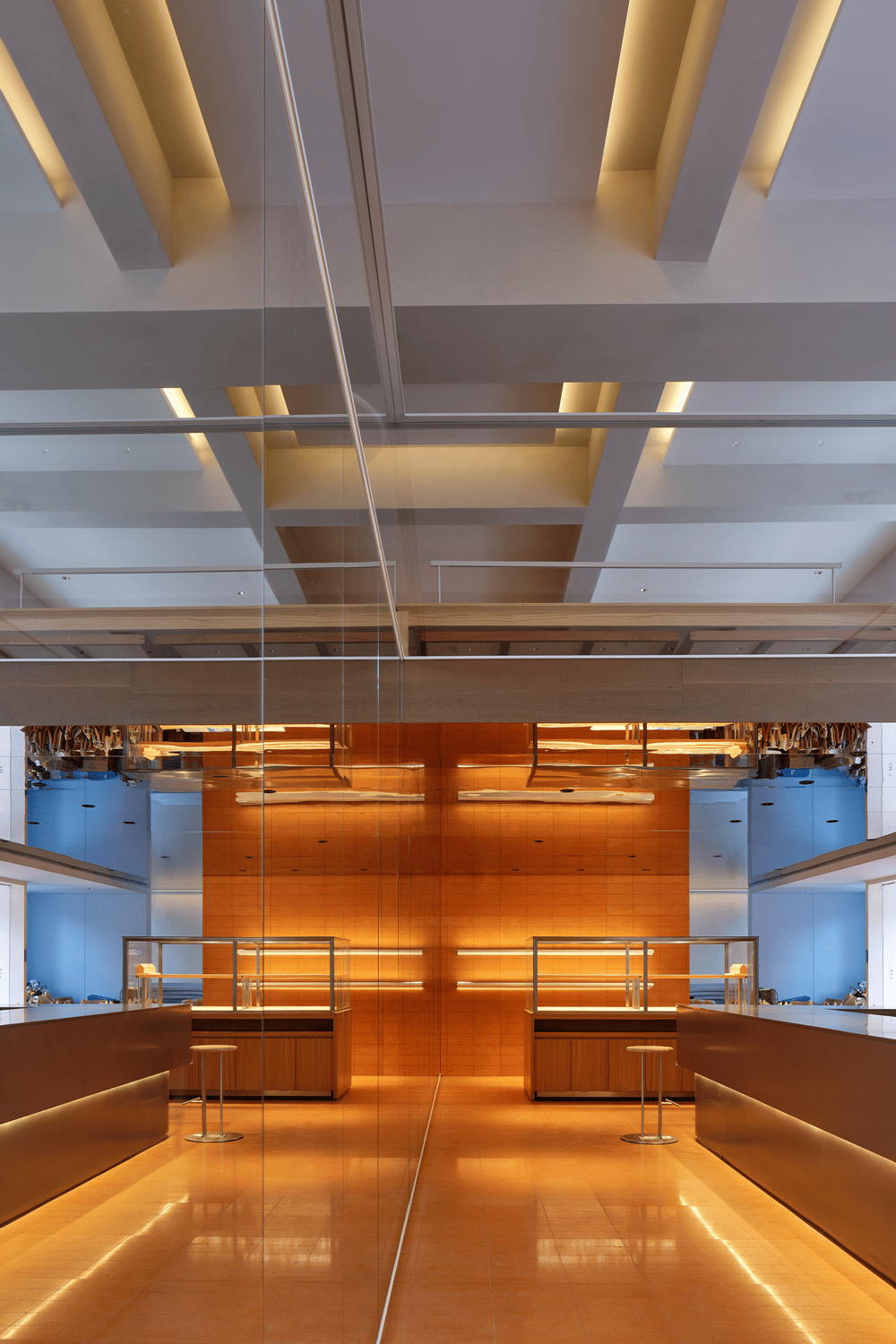 值得注意的是,室内同时也使用了镜面材质,内置镜面映射室外场景,使得室内外实现了一种“并置”的效果,这一处理无疑加强了内外空间的沟通联系,并从视觉层面将这两种感知糅合到一起。