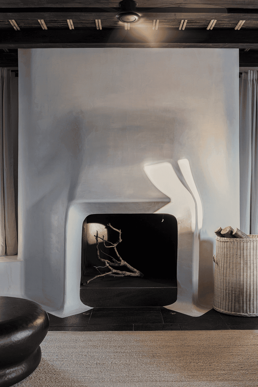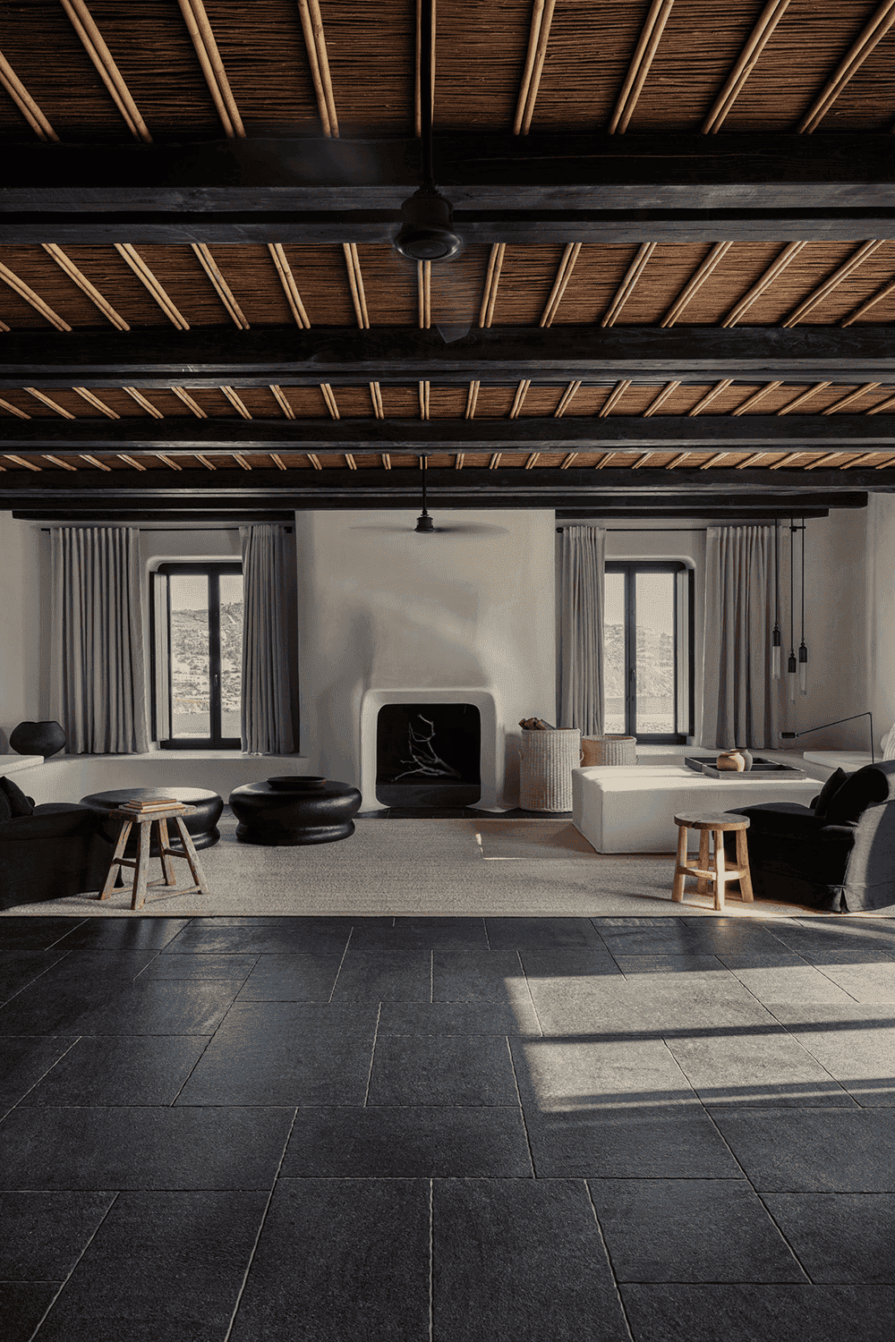 粉刷过的墙壁与较暗的表面(如喷砂石地板和栗色屋顶横梁)并置,营造出柔和且低调的空间背景,而竹芦苇天花板、拉丝木家具、石磨亚麻织物和黄铜细节则为空间增添了质感。