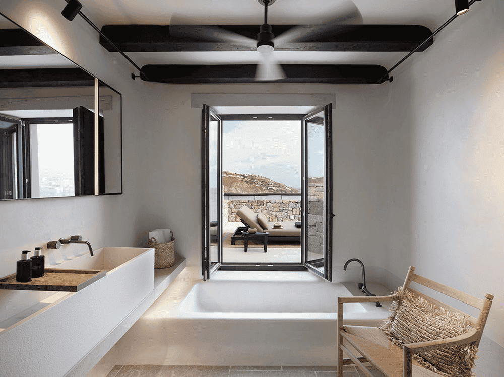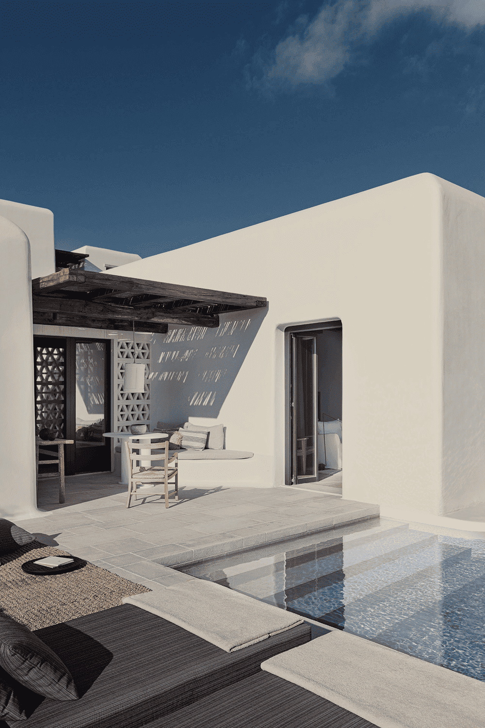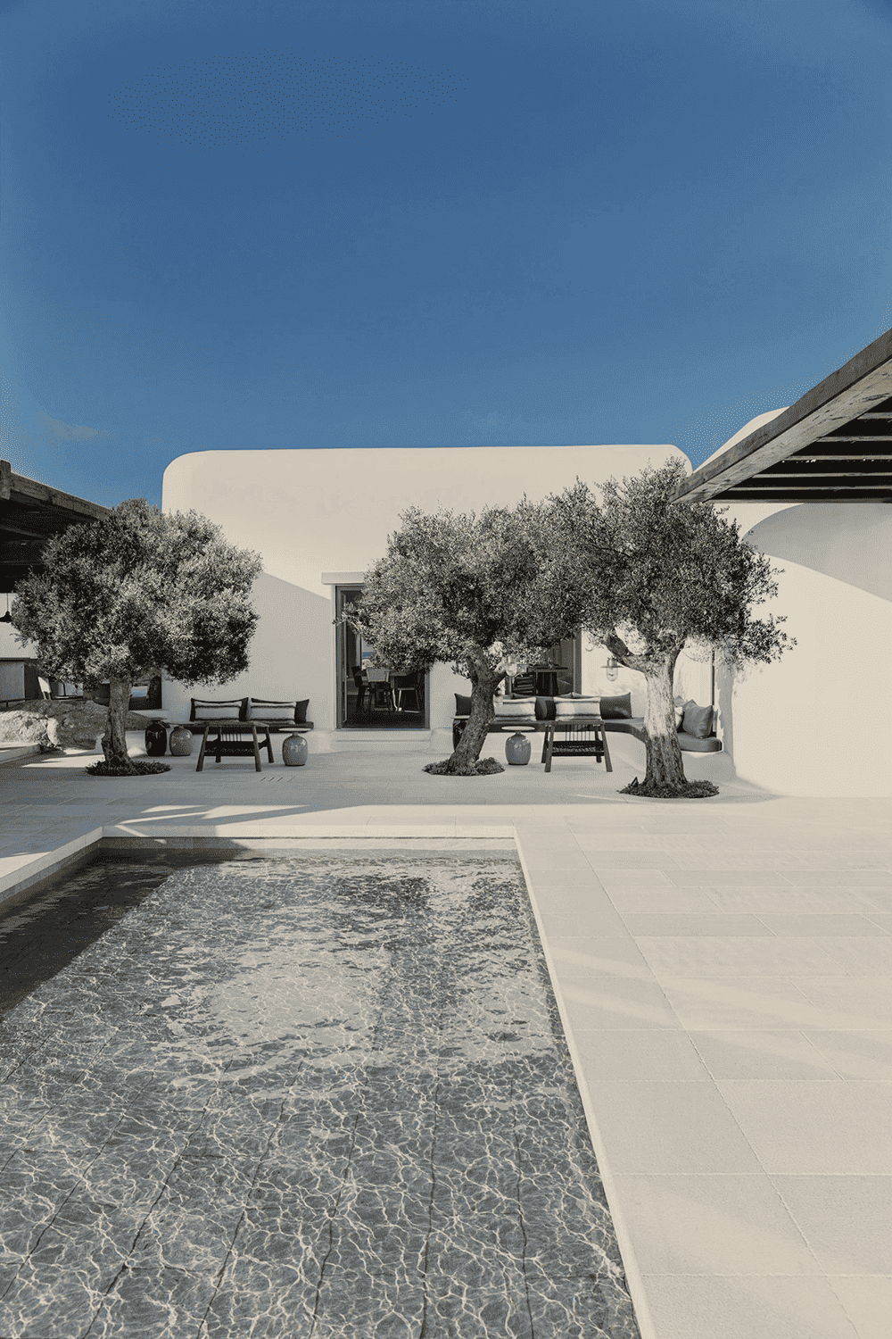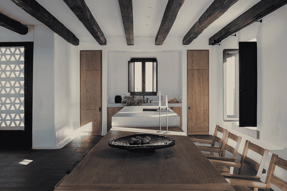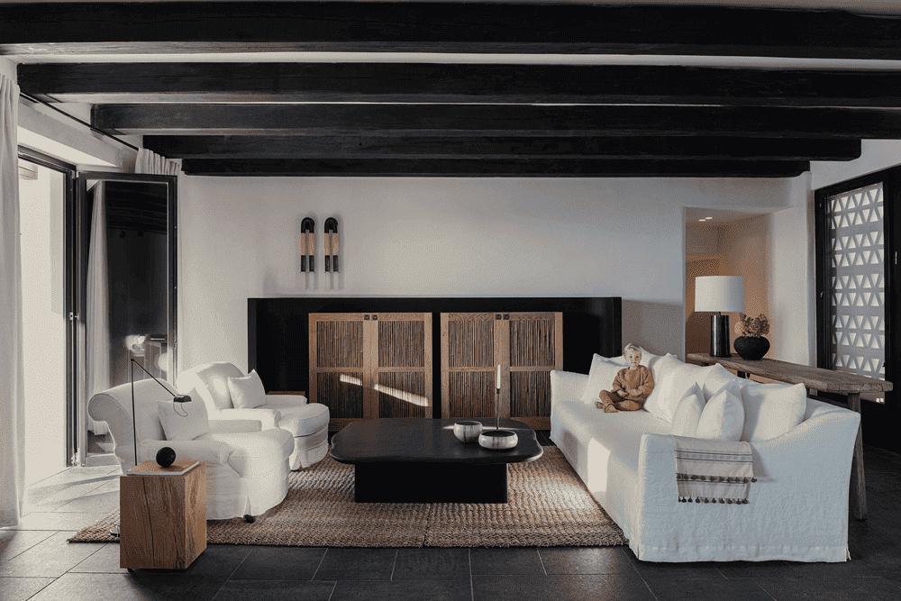 By eschewing the typical blue-painted windows and doors in favour of slender black frames, abandoning the traditional stucco silhouettes on the paving stones and introducing handcrafted furnishings that blend tradition with modernity, the design team has combined the local vernacular with an aesthetic of timeless sophistication.