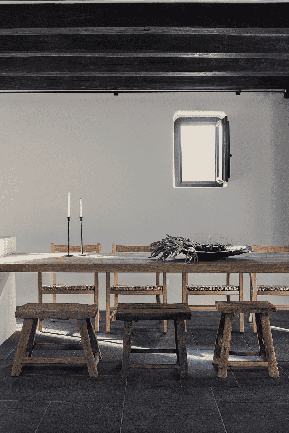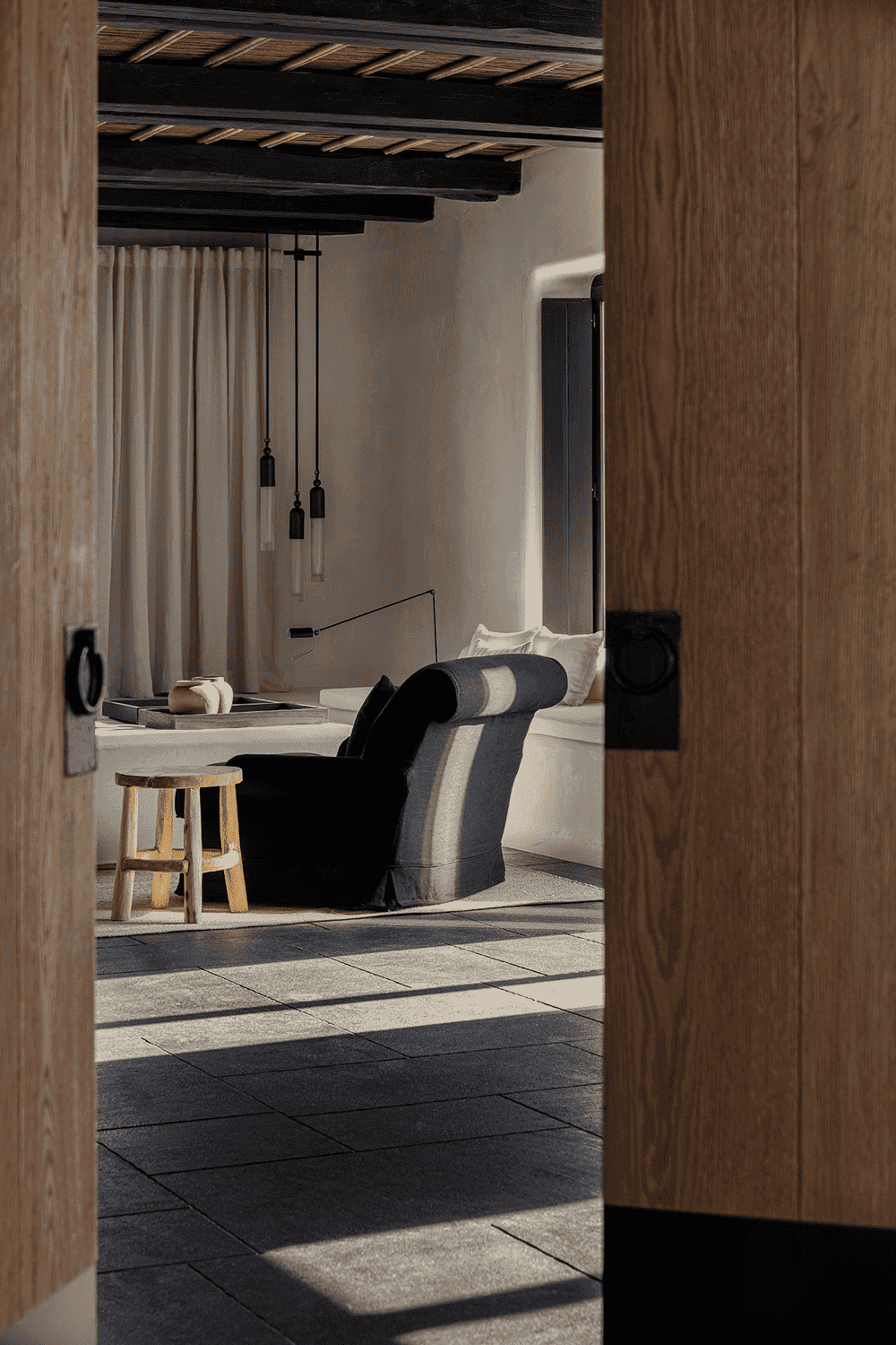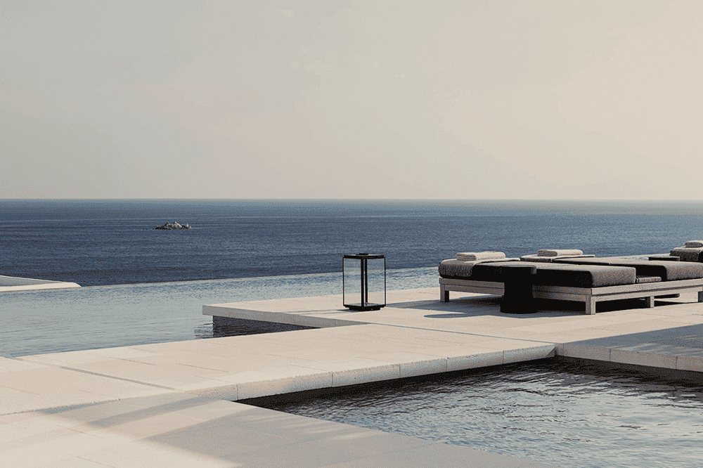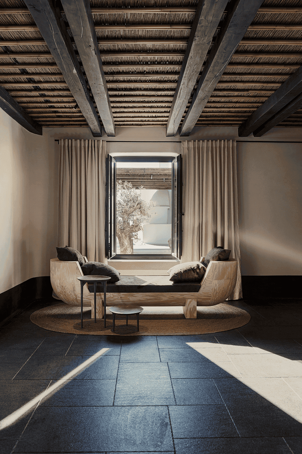 By eschewing the typical blue-painted windows and doors in favour of slender black frames, abandoning the traditional stucco silhouettes on the paving stones and introducing handcrafted furnishings that blend tradition with modernity, the design team has combined the local vernacular with an aesthetic of timeless sophistication.